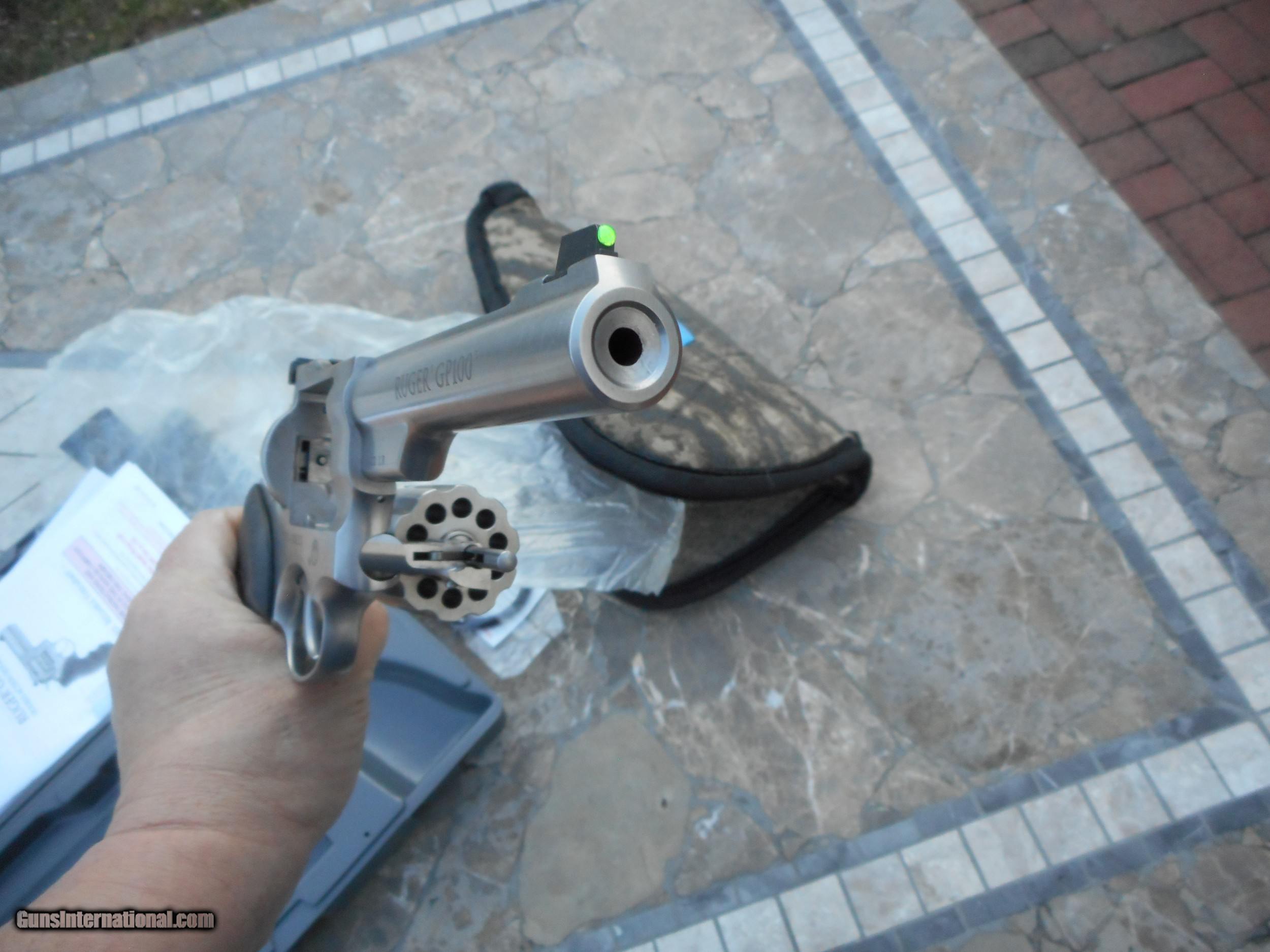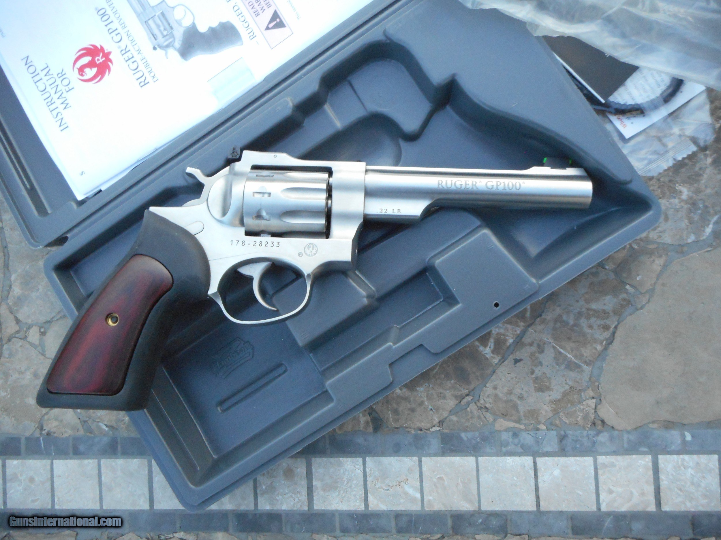 RUGER GP100,22LR,10 SHOT STAINLESS REVOLVER,6 INCH BARREL,UNFIRED NEW IN MATCHING BOX,ALL PAPERS,FIBER OPTIC FR SIGHT,RUGER NEOPRENE GRIPS