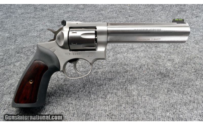 Description: Ruger's GP100 Double-Action Centerfire Revolvers are renowned for dependability, accuracy and reliability. Triple-locking cylinder provides positive alignment. Patented transfer-bar mechanism provides security against accidental discharge. Comfortable rubber grips with hardwood inserts make it a breeze to shoot. This GP100 is in like-new-in-box factory second condition and comes with the factory case and paperwork. SOLD Caliber Info: .357 Magnum Chambers: 7 shot Metal Condition: LNIB Wood Condition: LNIB Bore Condition: LNIB Barrels: 6 inch Triggers: 3 lb single action, >8 lb double action Butt Pad: Cushioned rubber with hardwood insert Weight: 46 oz Sights: Fiber optic front, adjustable rear Extras: Factory case and paperwork Item Location: Gainesville, VA |