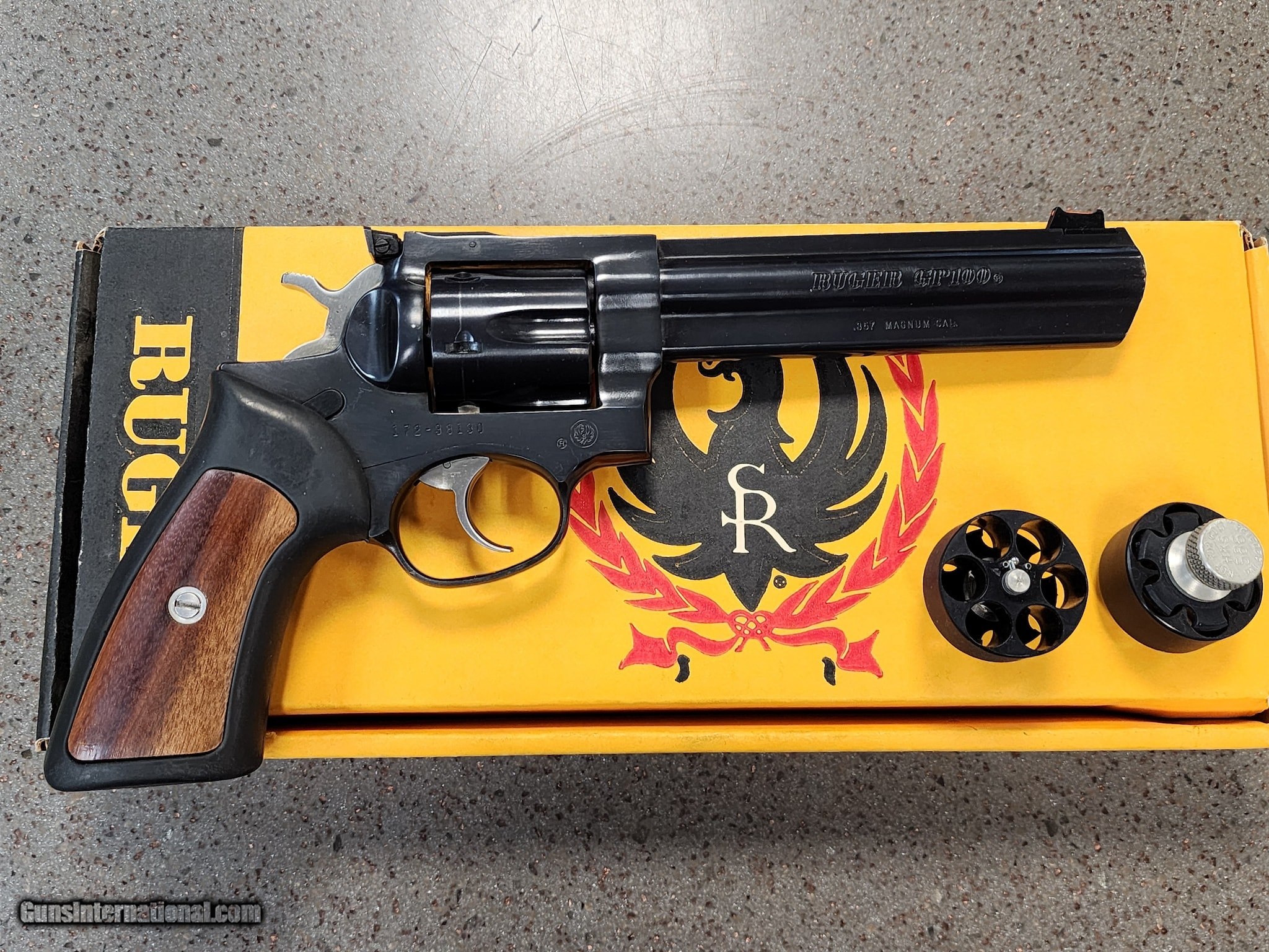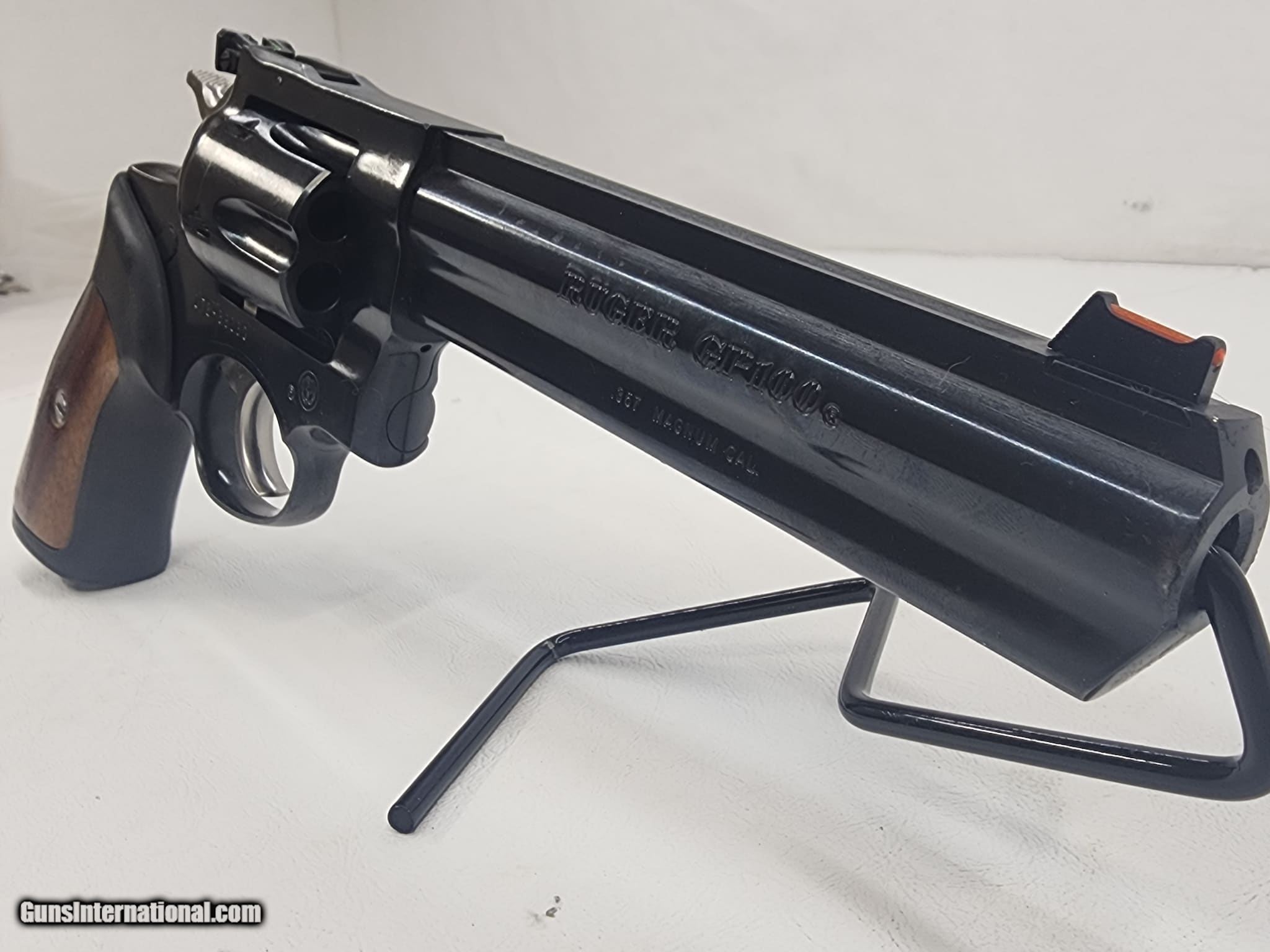 Description: Guns Listing ID: 1123043 Ruger® GP100® is a rugged and reliable double-action revolver that serves equally well for field carry in the outdoors, home defense, law enforcement, or target shooting. The GP100 revolver is built on a robust, medium/heavy frame of stainless steel. To withstand recoil from heavy 357 loads, a triple-locking cylinder is locked into the frame at the front, rear, and bottom so it stays aligned without getting sloppy over time. A full-length rib along the top of the barrel adds weight, and provides ample steel to dovetail the front sight, making the sight easily replaceable. The rear sight is fully adjustable for windage and elevation, and the factory ramp front sight is easily seen, while providing minimal interference when drawing the sidearm from a holster. (3\" barrel model has a fixed rear sight and a pinned front sight.) The angle of the GP100‚‚s peg-style grip frame, and the recoil cushioning Hogue® Monogrip®, greatly absorb recoil and allow the shooter to stay on target while firing the revolver in double-action mode. A full-length ejector rod shroud puts extra weight out front to reduce muzzle flip, allowing for faster sight acquisition on follow up shots. The Ruger GP100 has a smooth double-action trigger pull, and a clean, crisp break in single-action. Stainless steel construction provides corrosion resistance, and low maintenance in the backcountry. The solid frame of the GP100 has no side plate, and the revolver disassembles into large subassemblies with no tools, aiding to ease of maintenance in the field. As with all Ruger Double-Action Revolvers, the GP100 features the patented Ruger transfer bar mechanism that provides an unparalleled measure of security against accidental discharge—the revolver can be dropped directly on its hammer and will not fire without the trigger being pulled all the way to the back. The Ruger GP100 Double-Action Revolver is solidly built sidearm that will serve a lifetime of hard use. Made in the USA. 1991 JPOO SOLD Manufacturer: RUGER Model: GP100 Caliber Info: .357 MAG Condition: Used - Non-Certified Barrels: 6 BARREL Finish: BLACK /W WOOD STOCK |