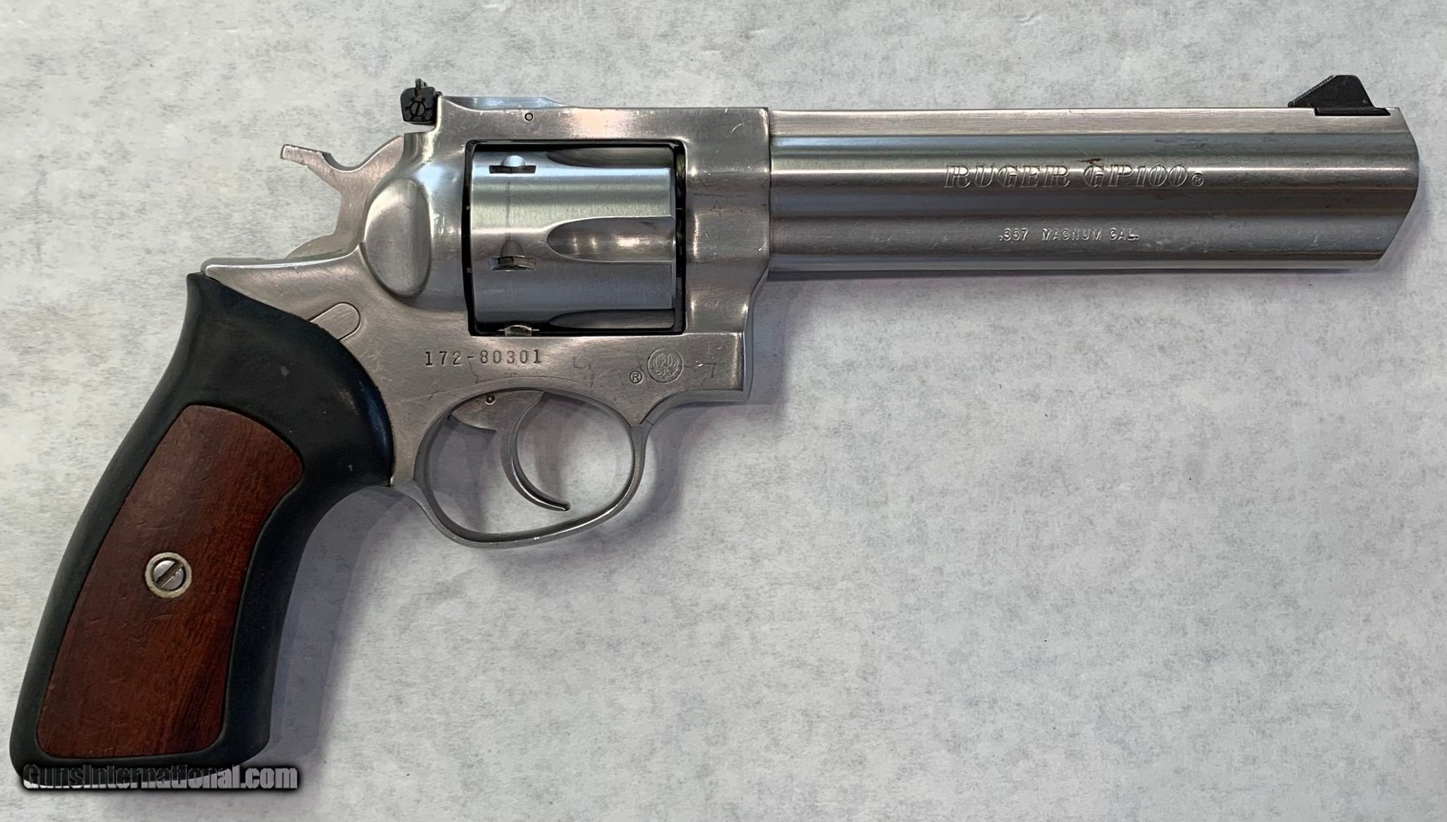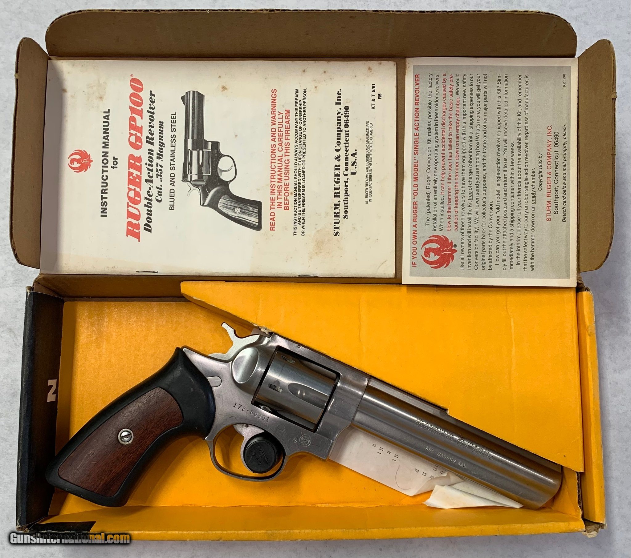 Description: Guns Listing ID: 463880 The revolver was made in 1993. It comes with the original box, manual, and cover bag. There are a few marks around the gun. This is an excellent and classic revolver. SOLD Manufacturer: RUGER Model: GP100 Condition: Used - Non-Certified Barrels: 6 Gauge Info: .357 MAG Finish: stainless/wood grips |