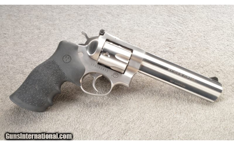 Description: Excellent condition Ruger GP 100 chambered in .357 Magnum. This example has a 6" barrel with a full underlug, stainless finish, 6 shot fluted cylinder. The front sight is a serrated ramp blade dovetailed to the front of the muzzle. The rear sight is a square notch with a white outline adjustable for windage and elevation pinned to the top of the frame. The grip are a one piece stippled rubber grip with Ruger logos at the tops. Comes with the factory matched hard case, owners manual, paper work and cable lock. Serial 179-90830. .357 Magnum SOLD Chambers: 6 shot revolver. Metal Condition: Excellent with a couple minor scratches on both sides of the top strap. Bore Condition: Bright bore with little wear. Barrels: 6" barrel. Triggers: SA/DA. Sights: Adjustable. Item Location: Owatonna, MN |