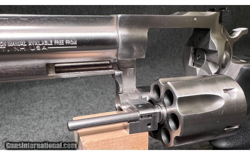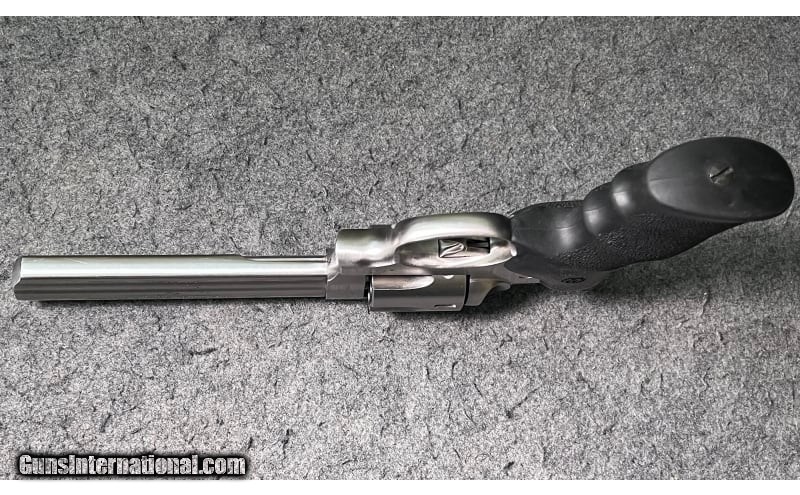 Description: This 2009 right-hand stainless steel revolver is a Ruger GP100 chambered in .357 Magnum. It has a six round fluted cylinder, a fixed dovetailed serrated ramp front sight, a square white outline adjustable rear sight, a cross-hatched hammer, Ruger emblem soft black rubber finger grooved grips, a smooth curved trigger, and a 6-inch nine-groove serrated full rib barrel. The finish is in very good to excellent condition, with little to no noticeable handling wear. The Ruger emblem soft black rubber finger groove grips are in very good condition. It comes with the factory gray hard plastic case, lock, and pin. .357 Magnum SOLD Chambers: Six round cylinder Metal Condition: "The brushed stainless steel finish is in very good to excellent condition, with little to no noticeable handling wear. Wood Condition: The Ruger emblem soft black rubber finger groove grips are in very good condition Bore Condition: Bore is bright and shiny with strong rifling Barrels: 6-inch nine-groove serrated full rib barrel Triggers: Smooth curved trigger Stock Dimensions: 11⅜ inches overall length Fore End: Shrouded extractor rod Butt Pad: Ruger emblem soft black rubber finger grooved grips Weight: 2 lbs 12 oz Sights: "Fixed dovetailed serrated ramp front sight, square white outline adjustable rear sight Item Location: Wichita, KS |