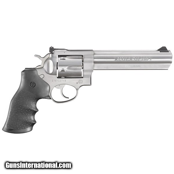 Description: Ruger 1764: Ruger's GP100 revolver features a triple-locking cylinder that is locked into the frame at the front, rear and bottom for more positive alignment and dependable operation. Its patented transfer bar mechanism provides an unparalleled measure of security, while the integrated sub-assemblies allows for easy maintenance and assembly. The grip frame design easily accommodates a wide variety of custom grips. This Standard model has a stainless steel 6" barrel, frame, and cylinder. It also has a black Hogue Monogrip and a fiber optic front sight with an adjustable rear.
