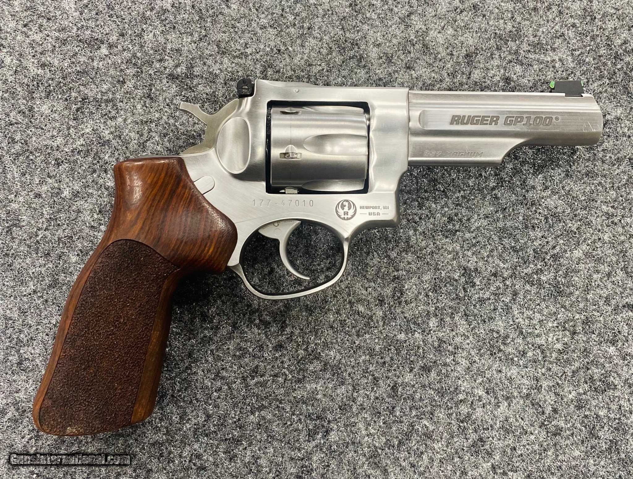 Description: Guns Listing ID: 1300334 Great shape Ruger GP100 with adjustable sights .357 STS. Does not include box, You are responsible for examining photographs before purchase. If you have more questions or would like to request more photos please contact us, and we will be more than happy to help you out. Thank you. SOLD Manufacturer: RUGER Model: GP100 MATCH CHAMPION Caliber Info: .357 MAG Condition: Used - Non-Certified Barrels: 4.2 BARREL |