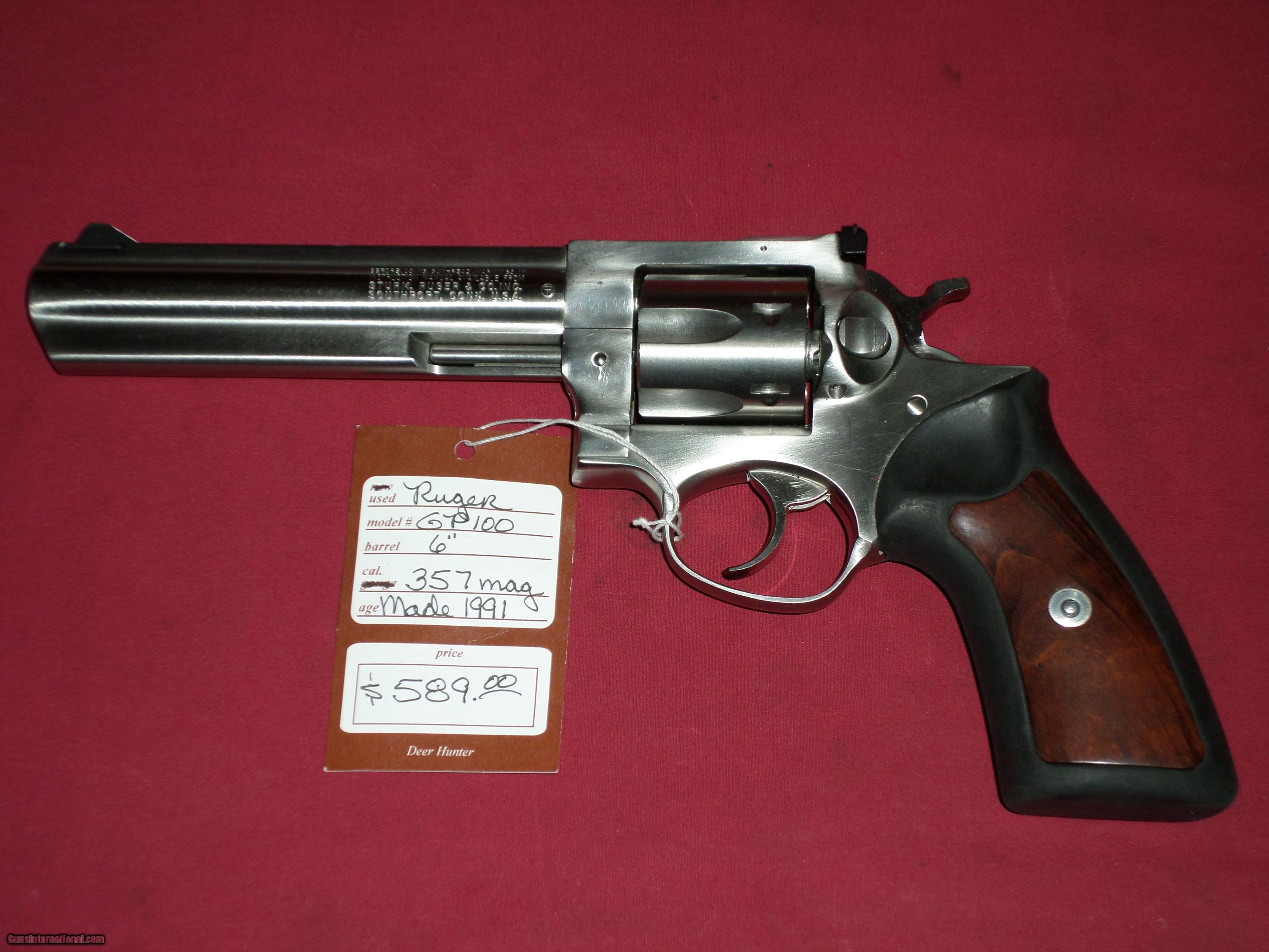 Description: SOLD For sale, Ruger GP100 6" .357 Mag. Very good to excellent condition in the box. Circa 1991 To see more of our inventory, visit deerhunterguns,com We collect 7% sales tax for Florida sales. We accept MC, Visa and Discover, no AmEx. No Sales to California. Like us on Facebook: Deer Hunter Guns SOLD |