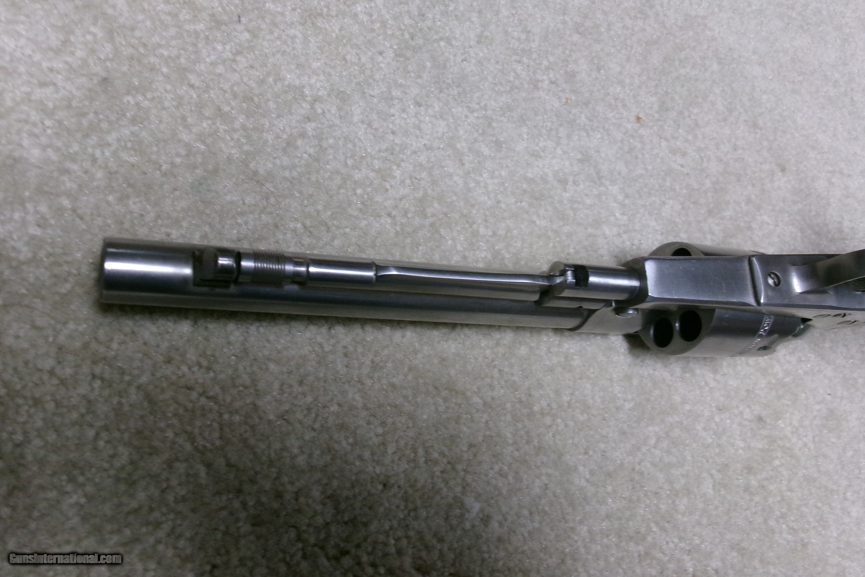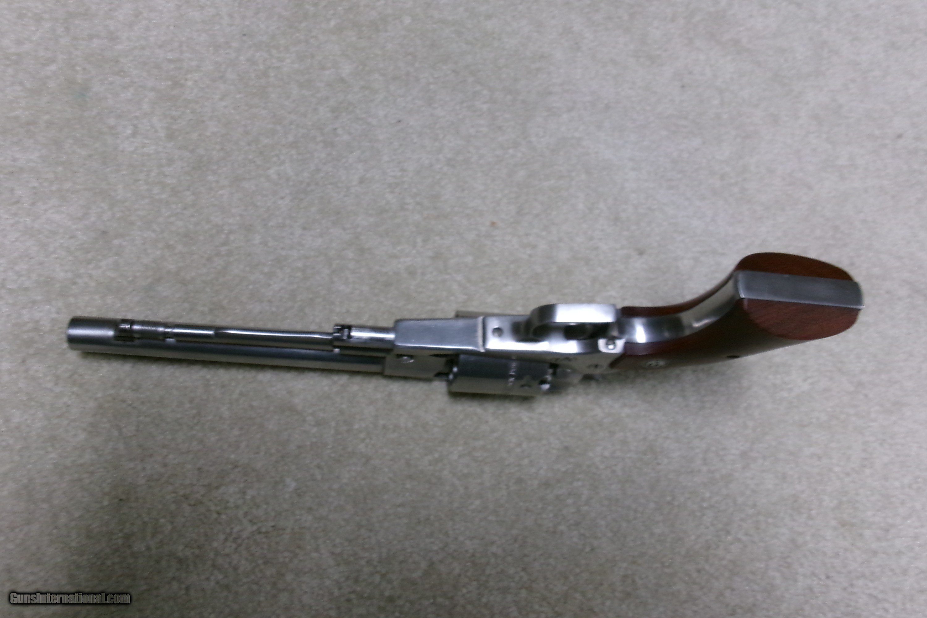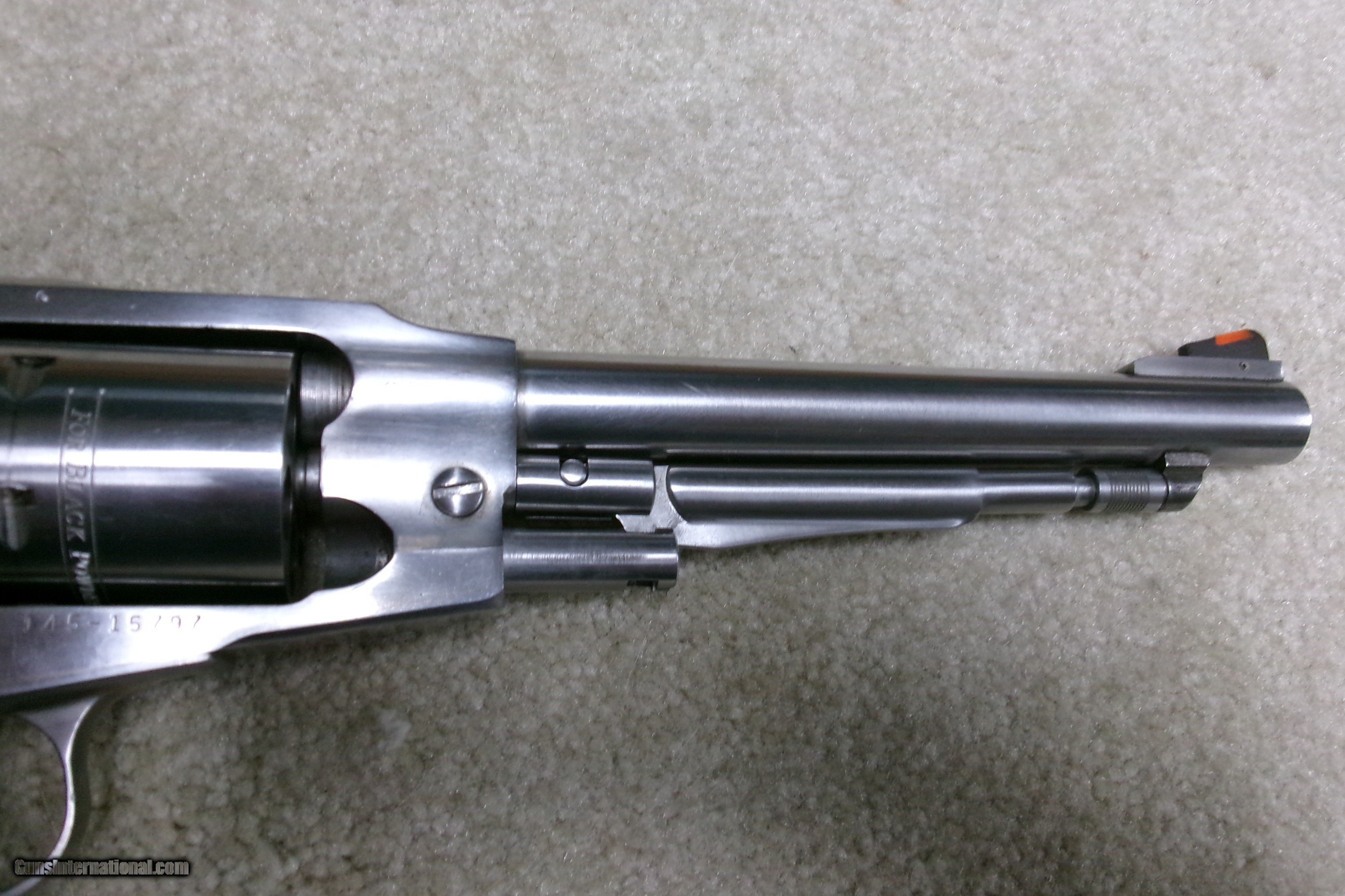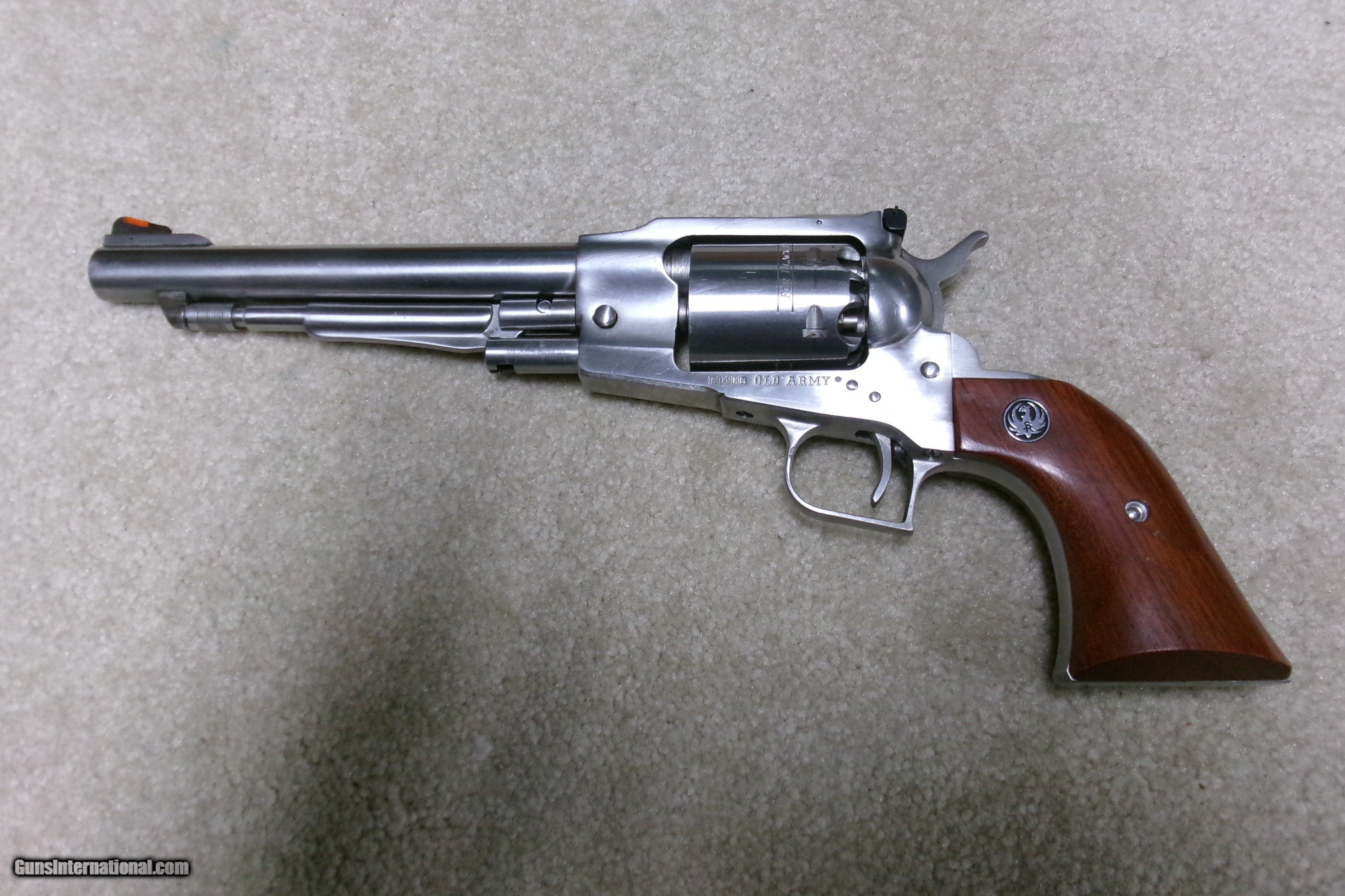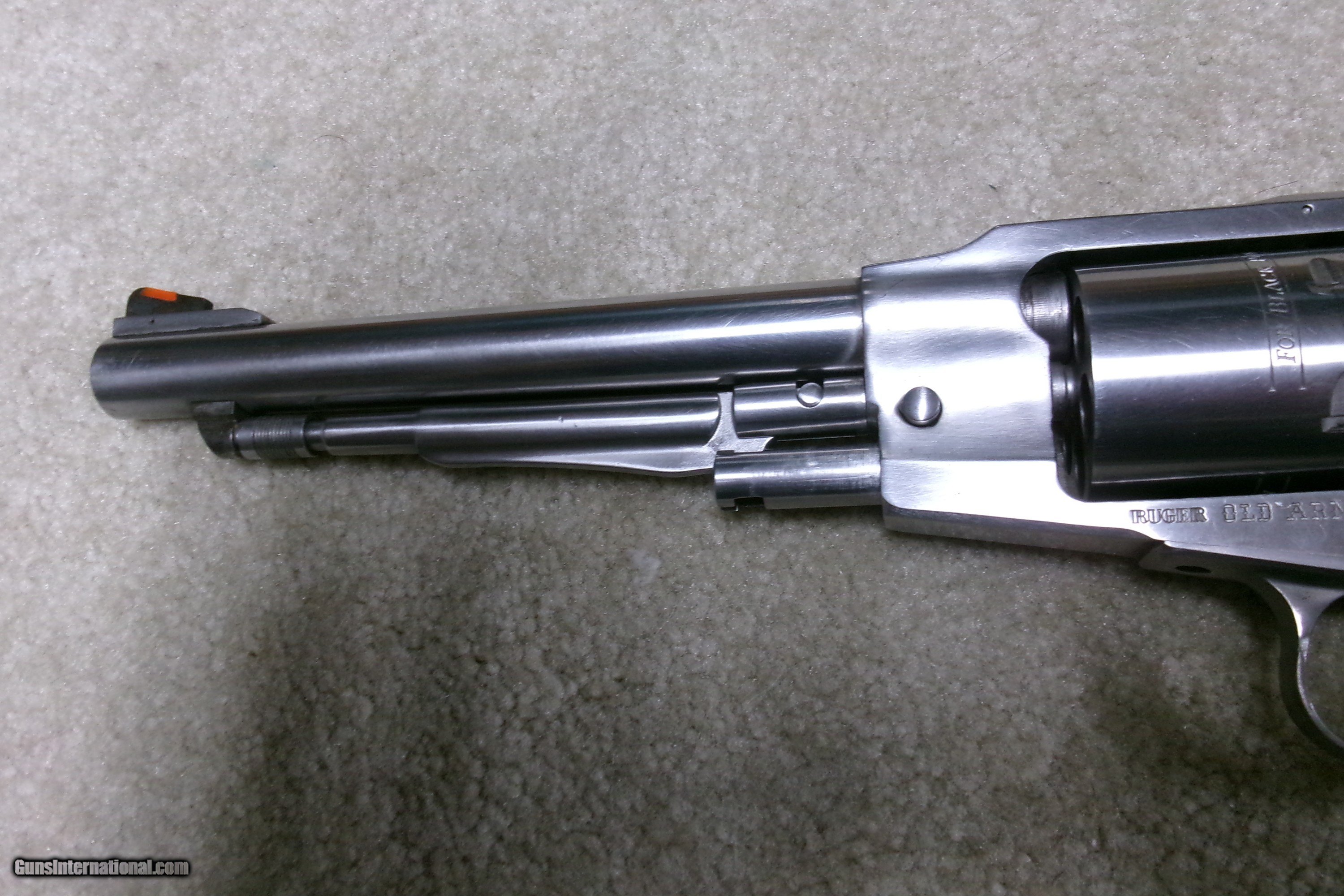 Description: CUSTOMIZED RUGER STAINLES STEEL OLD ARMY .45 PERCUSSION REVOLVER, #145-15XXX, MADE 1978. This Stainless Old Army has been fitted with a matching stainless steel Super Blackhawk grip frame with square back trigger guard. This is a larger grip frame than the standard Old Army and allows all fingers on the front strap. It also gives the revolver a "Dragoon" look. It is also fitted with a pinned red insert front sight in the original ramp and a white outline rear sight. Recently passed sixgun expert John Taffin was a fan of putting the Super Blackhawk grip straps on the Old Army as he said it kept his fingers from being battered by the rear of the trigger guard. Excllent overall. Bright bore, tight mechanically. Does not appear to have seen much if any real use. SOLD Antique: Yes Manufacturer: RUGER Model: OLD ARMY STAINLESS Serial Number: 145-15XXX Barrel Length: 7 1/2 Condition: EXCELLENT Bore Condition: EXCELLENT |