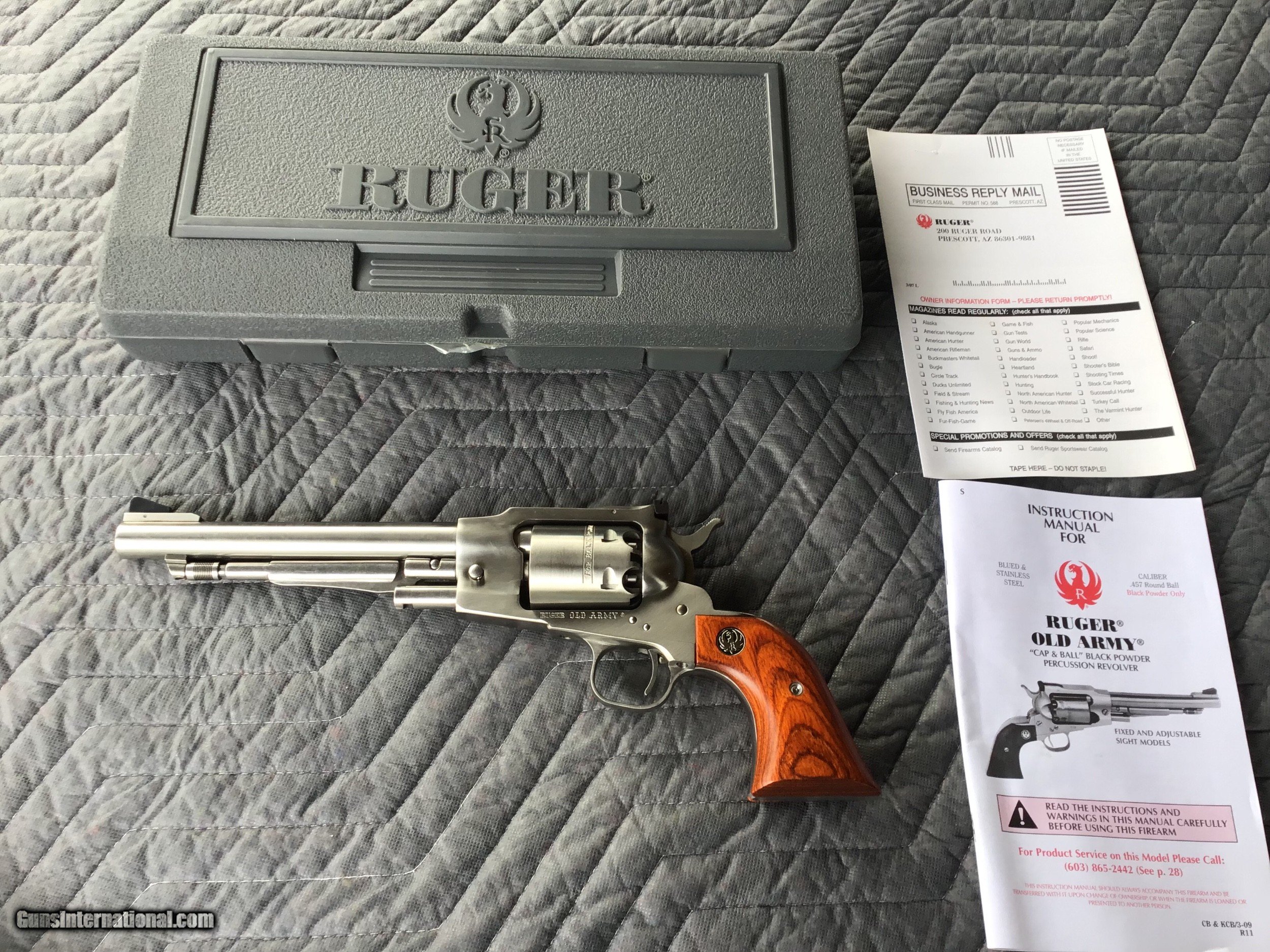 RUGER OLD ARMY 44 CAL. 7 1/2” BARREL STAINLESS, PERCUSSION CAP & BALL, BLACK POWDER REVOLVER, NEW UNFIRED IN THE BOX WITH OWNER MANUAL, ETC.