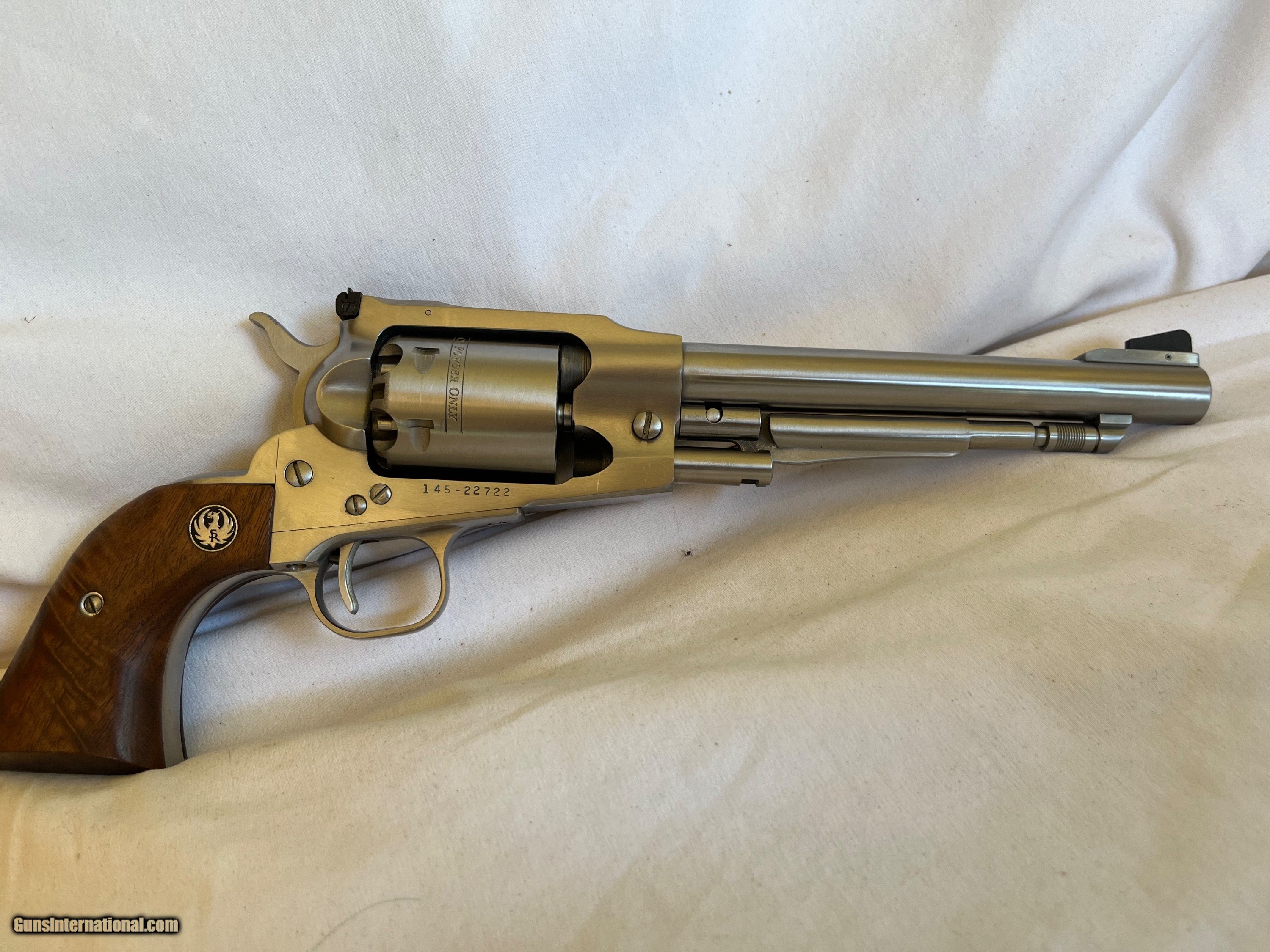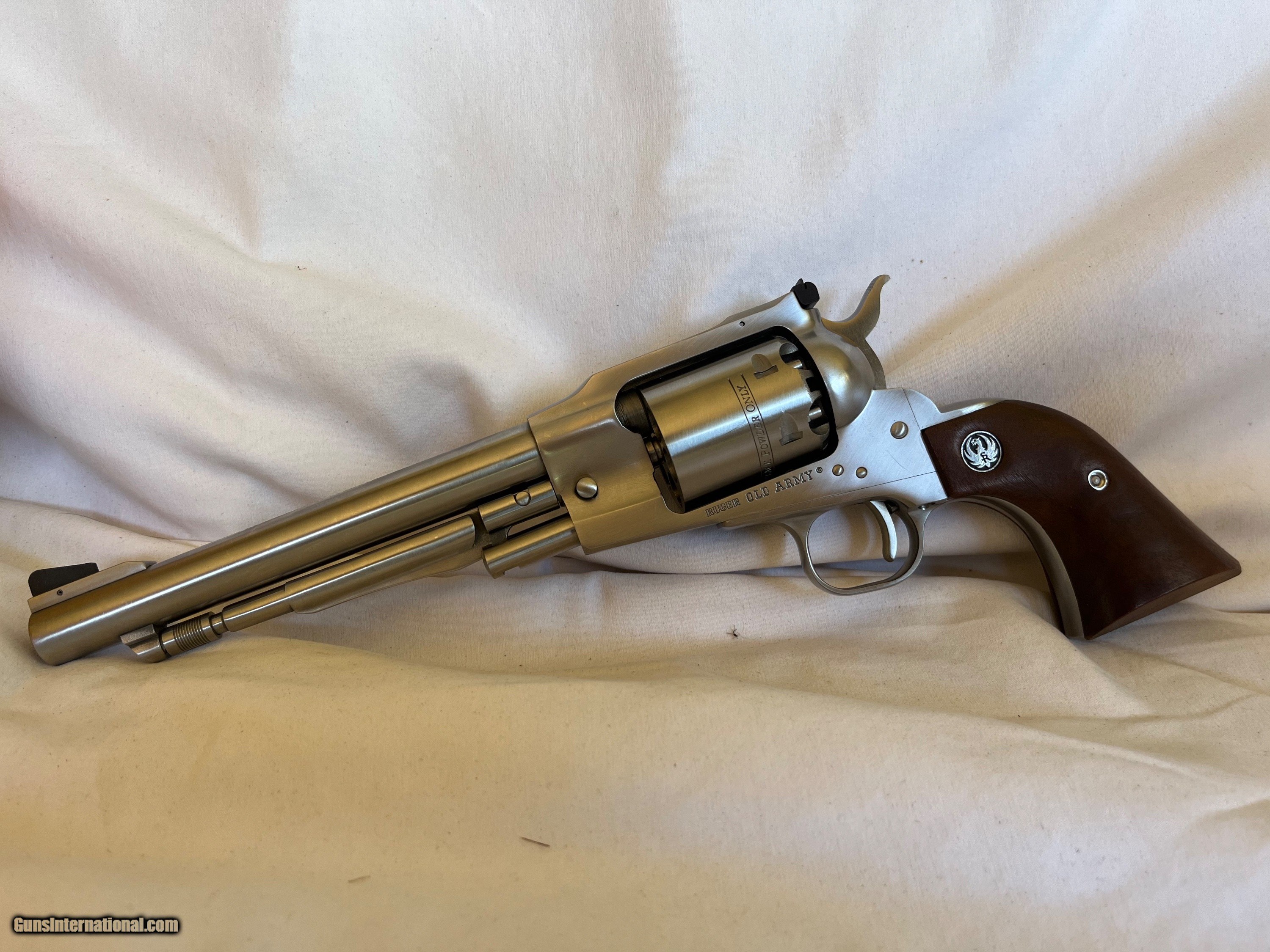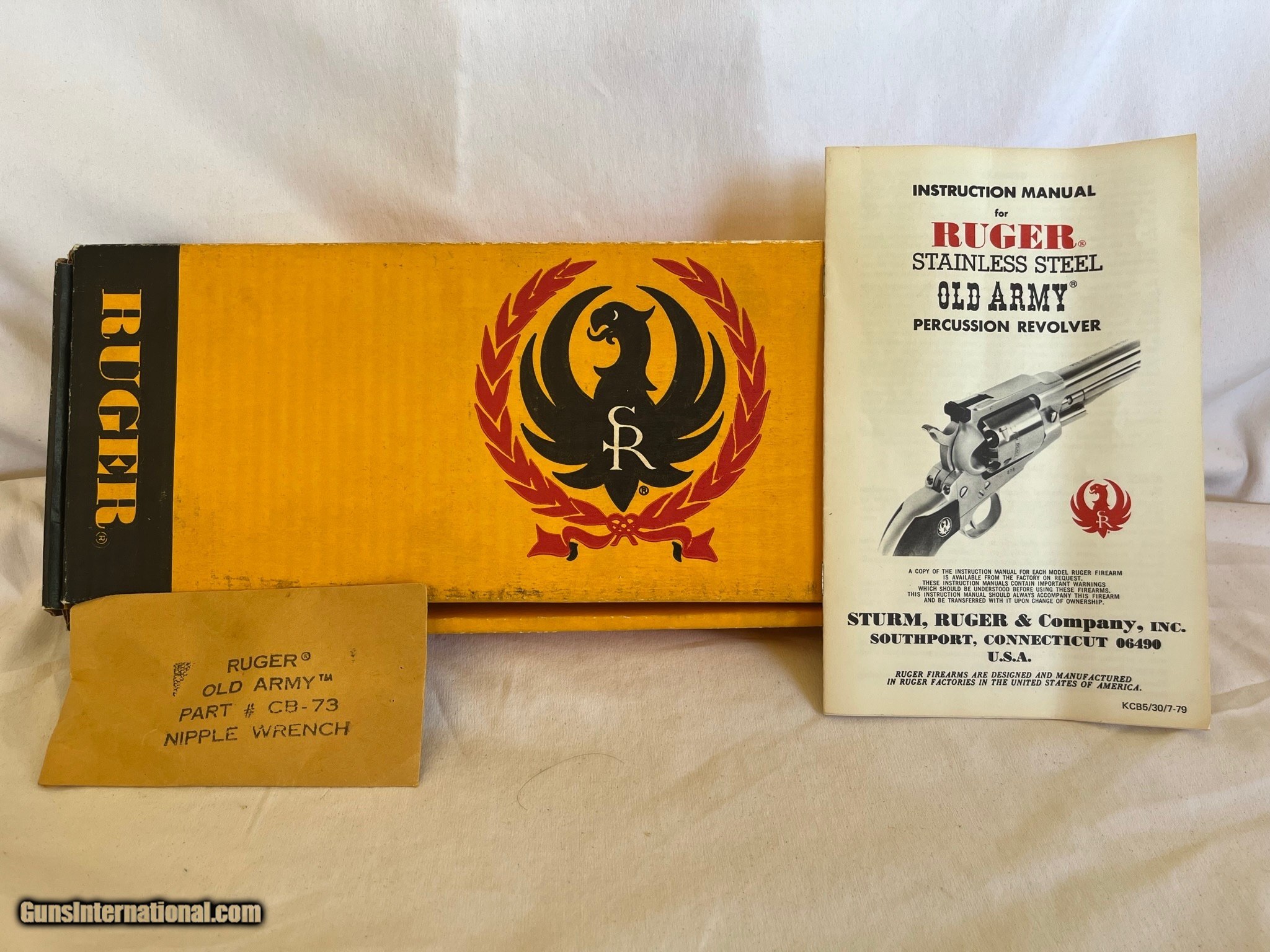 Description: Ruger Stainless Steel .44 Old Army cap & ball revolver. In original box with unused nipple wrench & instruction manual. 7 1/2" barrel, excellent condition, wood grips are as new. If this piece has been used, it was very little! I understand these revolvers were put together very well. And that is all I know about it! Price including shipping to the lower 48 states: $995. SOLD Serial Number: 145-22722 |