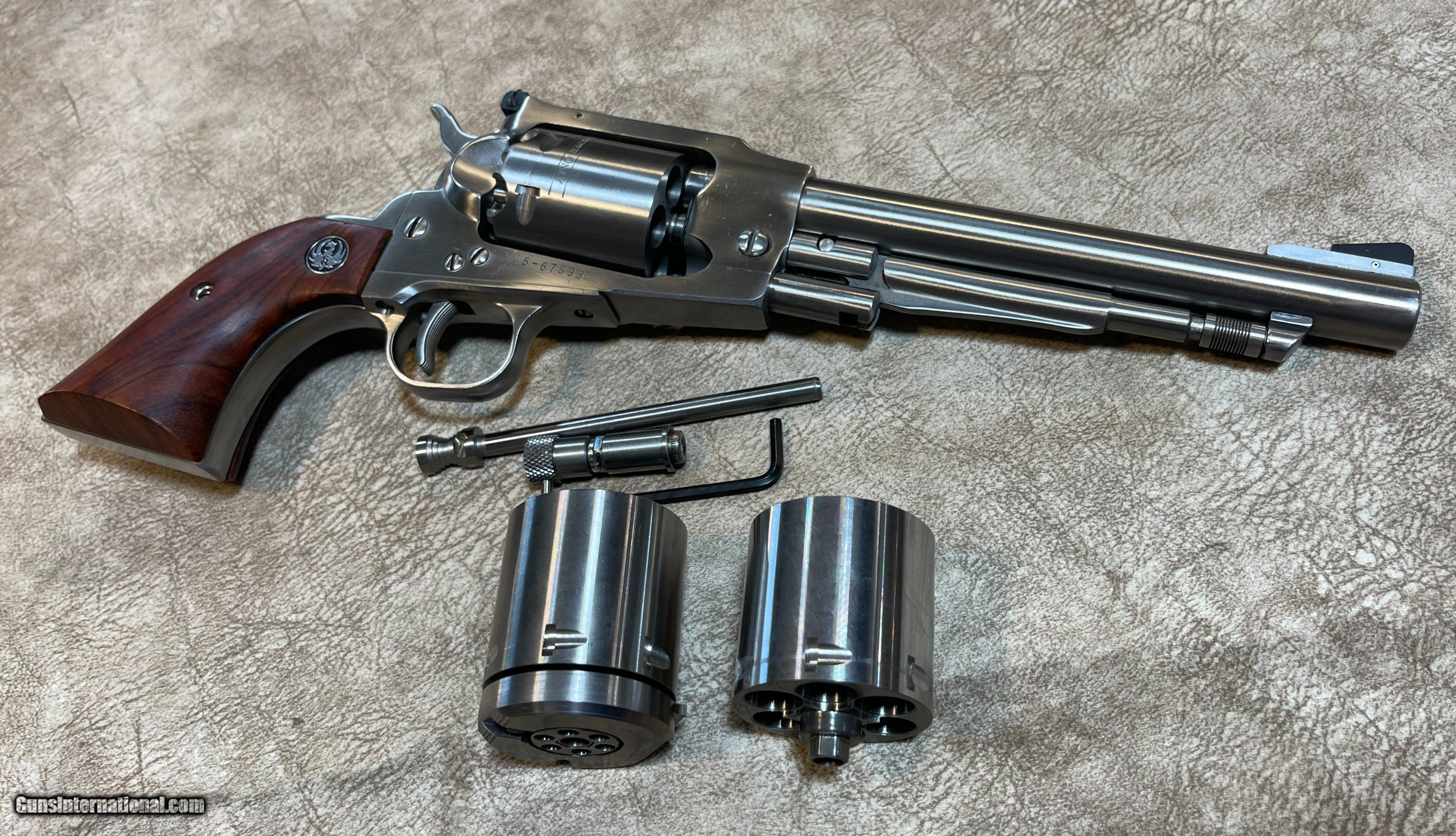 Description: Ruger Old Army percussion revolver in stainless steel, .44 cal., fixed sights, 7 1/2" barrel. This pistol comes with two modern cartridge conversion cylinders in 45lc, and 45acp, and is in excellent condition. Includes original box. $1,650.00 plus $50.00 for shipping. SOLD Handgun Caliber: .45 Colt, .45 ACP (.45 Auto), .44 Manufacturer: Ruger Model: Old Army Barrel Length: 7.5 Bore: Excellent Chambers: Excellent Condition: Excellent Metal Condition: Excellent Wood Condition: Excellent Bore Condition: Excellent Action: Single |