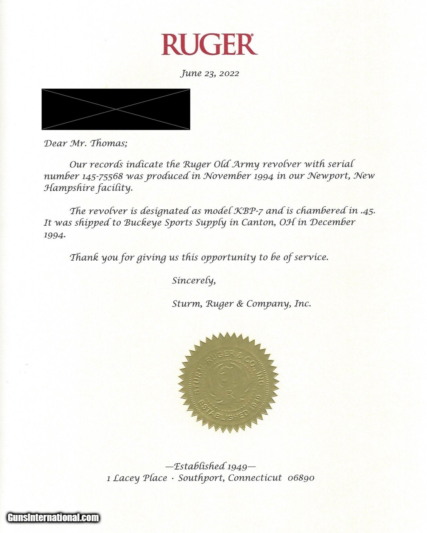 Description: UNFIRED - Ruger Old Army, Stainless Steel, cap and ball revolver, it is designated as model KBP-7 and is chambered in .45 caliber. Arguably the best percussion revolver ever built. Beautiful matte Stainless-Steel finish, with 7.5-inch round barrel, adjustable sights, stainless steel nipples, smooth walnut wood grips with black and silver Ruger Eagle Medallions, comes in a Ruger yellow and black one-piece box, with Owner’s Manual and combination Nipple Wrench and Screw Driver, only the lightest of handling marks. Built in 1994. Serial number 145-75568. While listed as .45 caliber it uses .457 round balls or .454 conical bullets. Ruger states It is safe to use as much Black Powder as the chamber will hold, leaving room for the bullet, although Ruger recommends 20 grains of FFFG with a round ball and either #10 or #11 caps for target practice. Like new is the best way to describe this cap and ball revolver. Even the red and black Ruger box is in excellent condition. All local, state and federal laws apply. Please check your local laws before your purchase. FREE USPS Priority Shipping to lower 48 states. SOLD Manufacturer: Ruger Model: KBP-7 Serial Number: 145-75568 Condition: Like New |