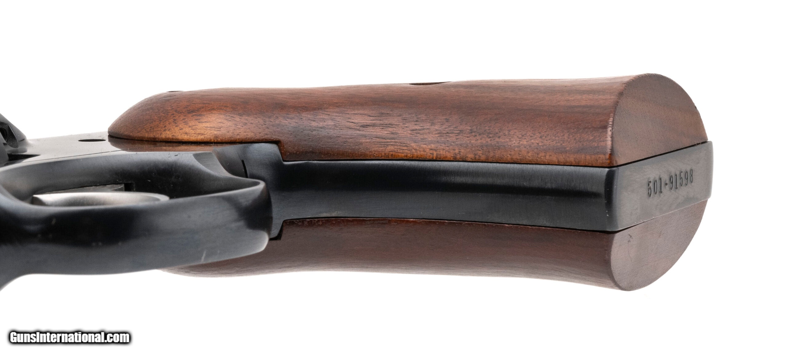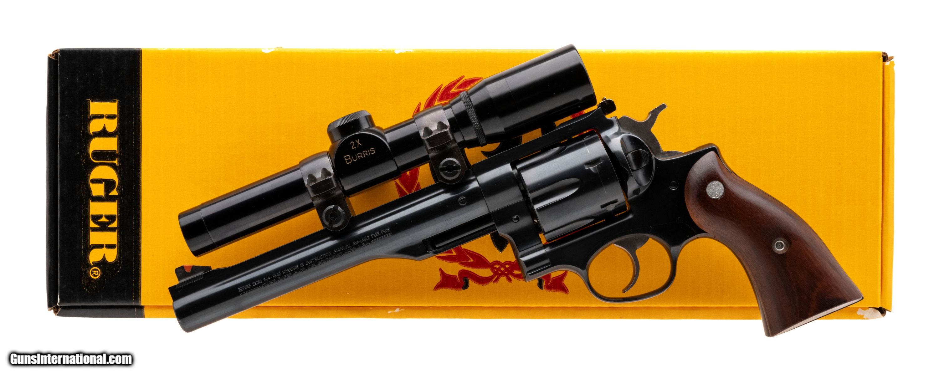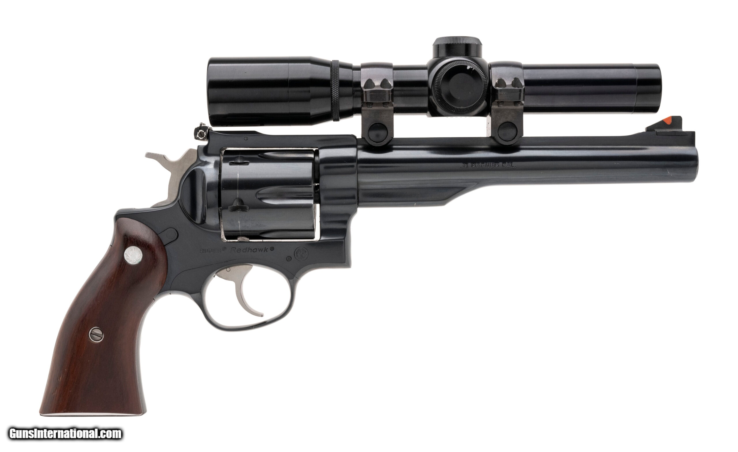 Description: "SN: 501-91598. Made in 1987, .41 Magnum with a 7.5"" barrel. Bore is bright with strong rifling. Scarce .41 Magnum double action revolver with a 2x Burris scope. Blued finish is in very good condition. Wood grips are in very good condition. Comes with box. SOLD |