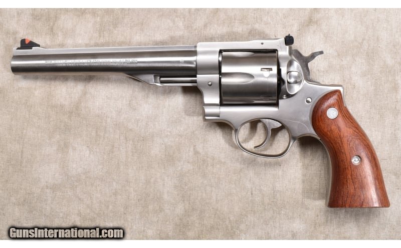 Description: Very nice all-stainless revolver, chambered in .44 Magnum, and suitable for target, hunting, and defense. .44 Magnum SOLD Chambers: 6 rounds Metal Condition: Very Good to Excellent. There is some powder residue on the cylinder face. Wood Condition: Excellent. Bore Condition: Shiny and bright with good rifling. Barrels: 7-1/2 inch Triggers: Factory double and single action. Butt Pad: Smooth walnut with Ruger medallions. Weight: 55 oz Sights: Serrated ramp with red insert and adjustable notch. Item Location: Rogers |