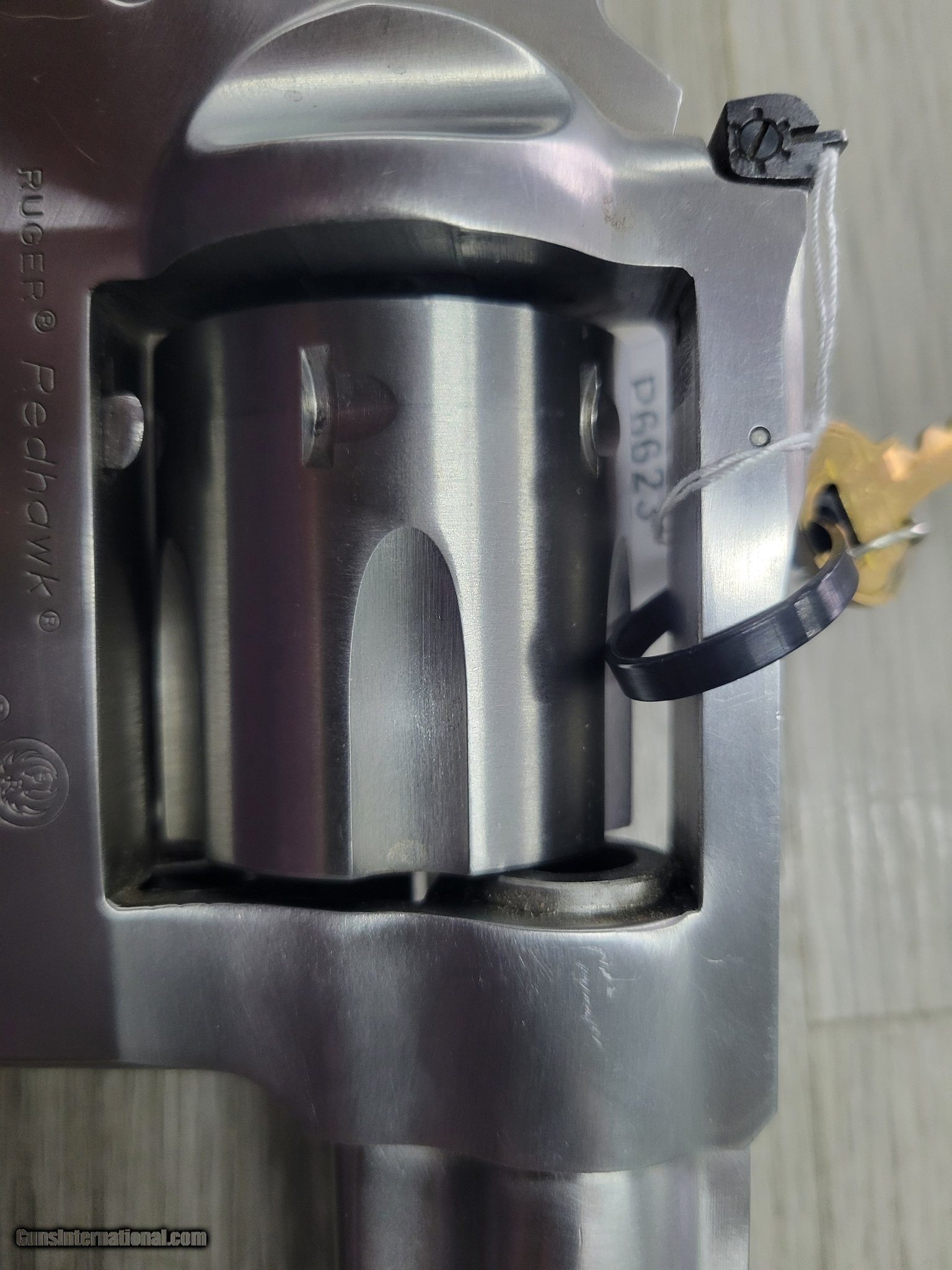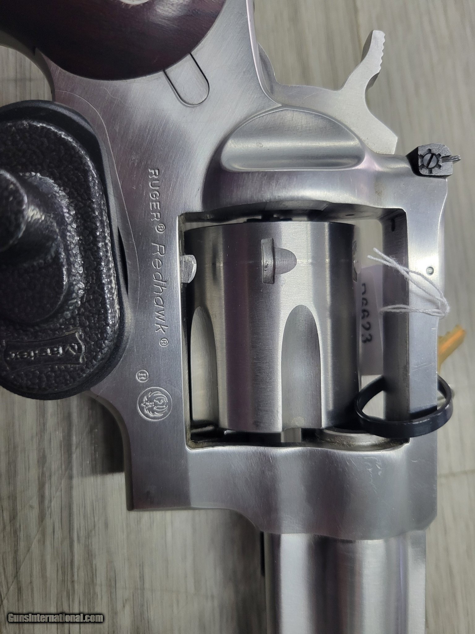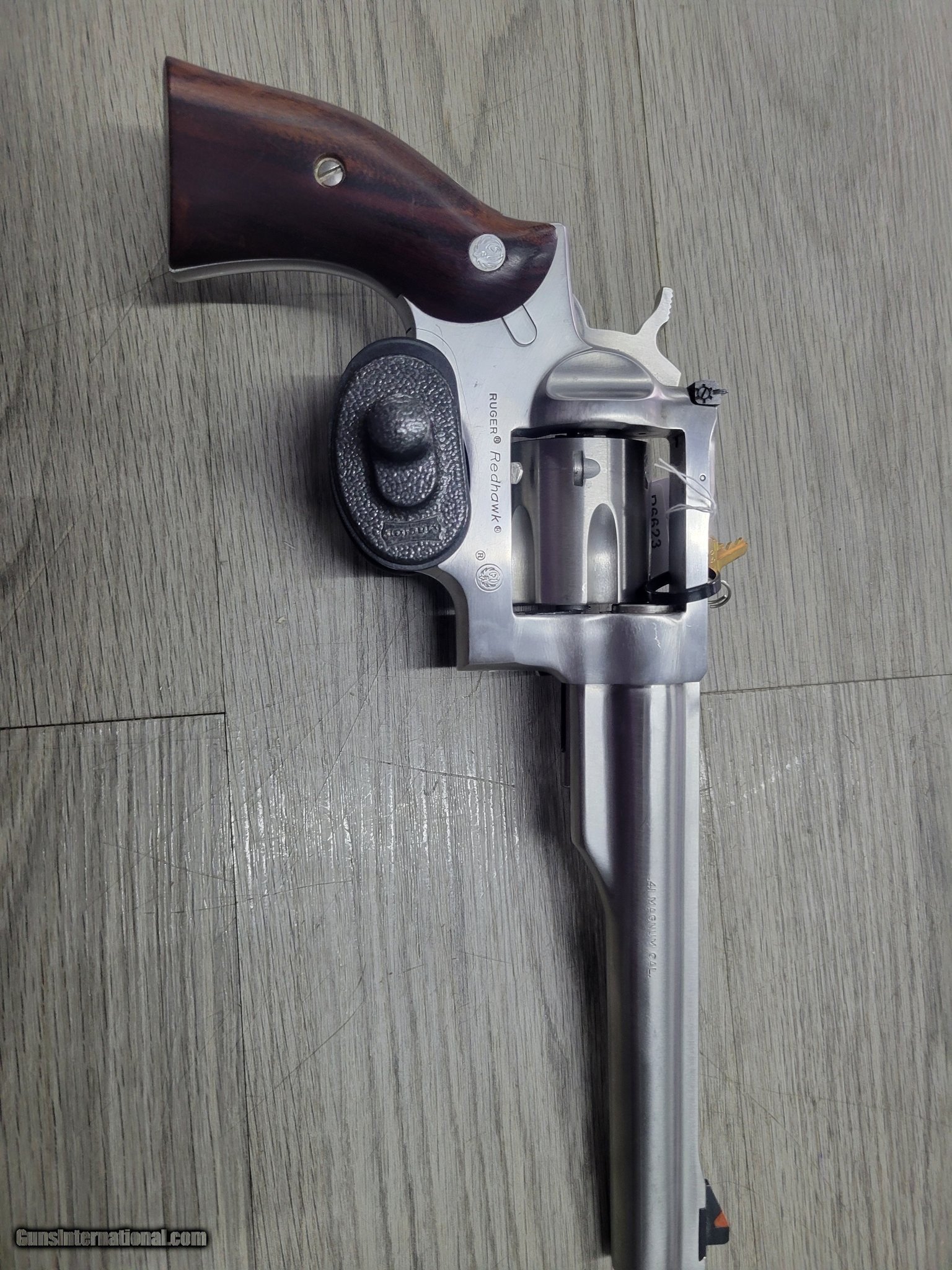 Description: Guns Listing ID: 585922 Ruger Redhawk — Stainless Steel, Wood Grips — .41 Magnum Robust stainless Ruger Redhawk revolver in .41 Magnum with attractive factory-style wood grips — heavy-duty, accurate, and built for years of hard use. Detailed description The Ruger Redhawk is a large-frame, double-action/single-action revolver built on a beefy stainless-steel frame and cylinder to handle high-pressure magnum cartridges. This .41 Magnum example features a corrosion-resistant brushed/polished stainless finish and classic wood grips that give it a timeless look while providing a solid, comfortable purchase. The Redhawk’s swing-out, six-shot cylinder, heavy-duty crane and lockup, and Ruger’s proven transfer-bar safety make it a reliable option for hunting, range duty, or collection. Key features Caliber: .41 Magnum Capacity: 6 rounds (typical for Redhawk) Action: Double-action / single-action (DA/SA) Frame & Finish: Stainless steel (durable, corrosion-resistant) Grips: Wood Cylinder: Swing-out cylinder with robust lockup Sights: Usually ramp front sight and adjustable rear (describe the actual setup on your gun) Safety: Transfer-bar safety (prevents discharge unless hammer is intentionally cocked) Uses: Hunting, big-bore target shooting, collector Bore: bright/clean Cylinder lockup: tight Action: smooth Finish: like-new / light handling marks Grips: original factory Sights: original and functional SOLD Manufacturer: RUGER Model: REDHAWK Caliber Info: .41 REM MAG Condition: Used - Non-Certified Barrels: 7.5" BARREL Action: REVOLVER Finish: stainless/wood grips |