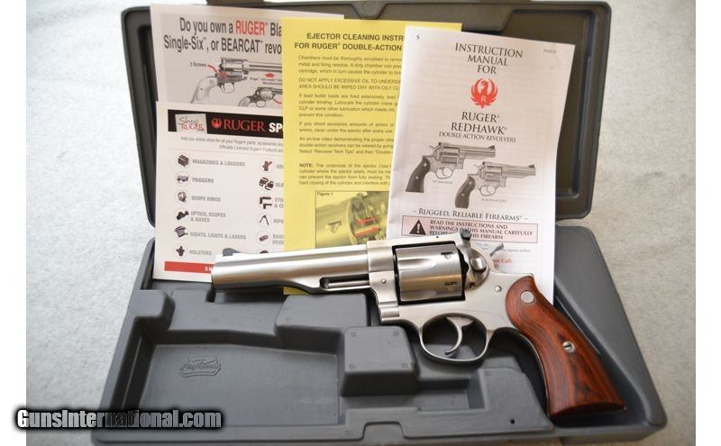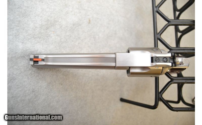 Description: Very good condition overall. Metal has some small and very minor handling marks; but the grips are virtually perfect. Bore is in excellent condition with healthy shine and strong rifling. .44 Remington Magnum SOLD Chambers: 6-Shot revolving cylinder. Metal Condition: Very good. Wood Condition: Grips are in excellent condition. Bore Condition: Excellent. Barrels: 5½" Brushed stainless. Triggers: Wide matte stainless steel with smooth surface. Butt Pad: Ruger medallion wood laminate grips. Weight: 3 lbs. Sights: Ramped front blade with orange insert and adjustable notch rear. Item Location: Green Bay |