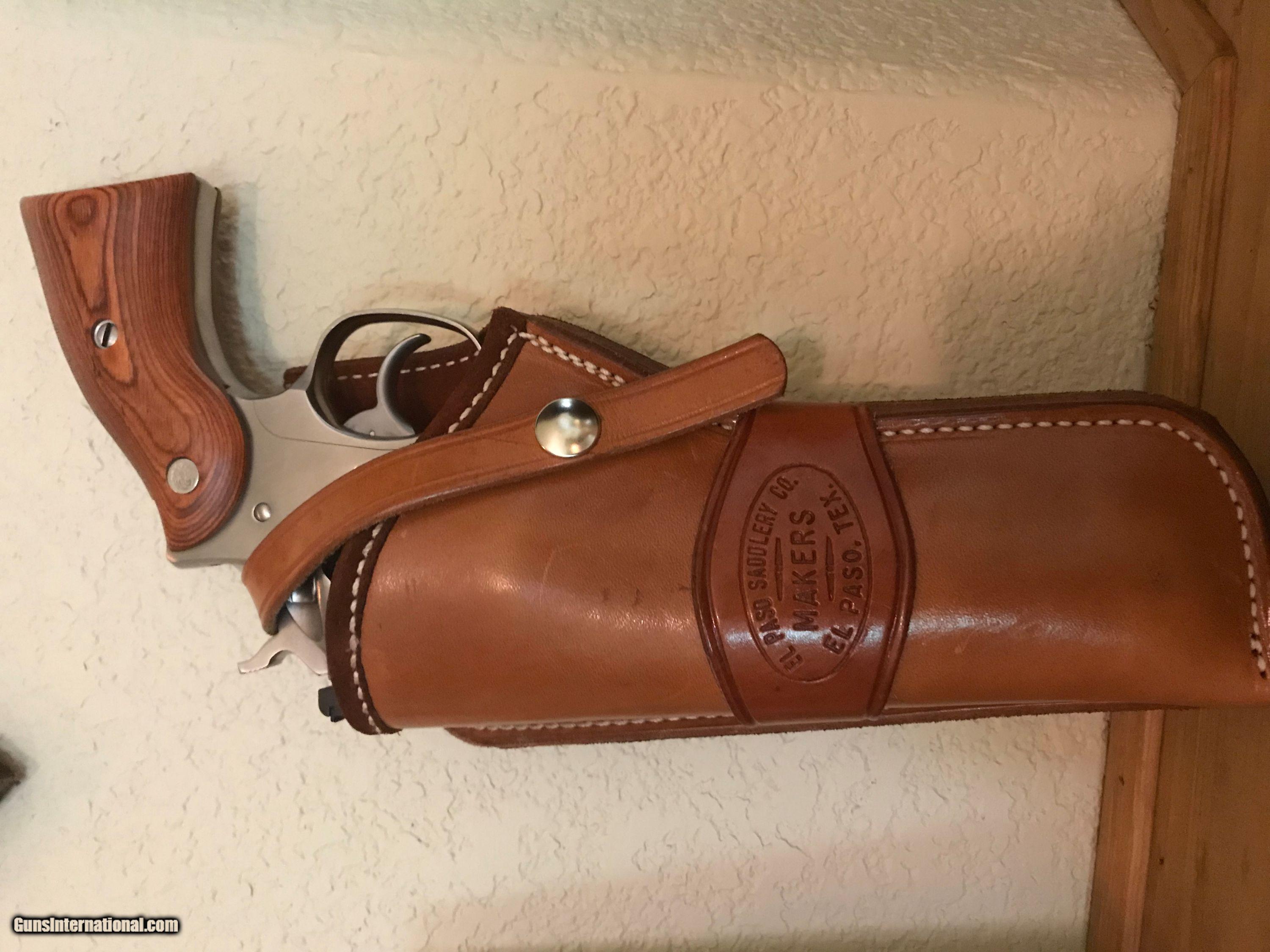 Description: Ruger Redhawk .44 Magnum double action revolver, nearly brand new, 99%+ condition; manufactured in 2017. One piece staineless steel, beautiful and powerful handgun. Flawless satin stainless steel finish, fancy hardwood grips, purchased direct from factory. Includes also: (1) 24 cartridge .44 Magnum custom gun belt from El Paso Saddlery, sizes 30-40 (2) Custom Holster, Lefty, " 1930 Austin " slide-on, from El Paso Saddlery BOTH ACCESSORIES AT NO EXTRA CHARGE. SOLD Manufacturer: Ruger Model: 5004 Serial Number: 503-90213 Caliber Info: .44 Magnum Chambers: 6 Condition: Pristine Metal Condition: Pristine Wood Condition: Pristine Bore Condition: Excellent Barrels: 5.5 inches Action: double Finish: satin silver Weight: 49 oz Sights: Standard Manufacture Date: 2017 Item Location: Texas |