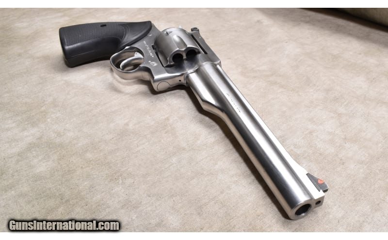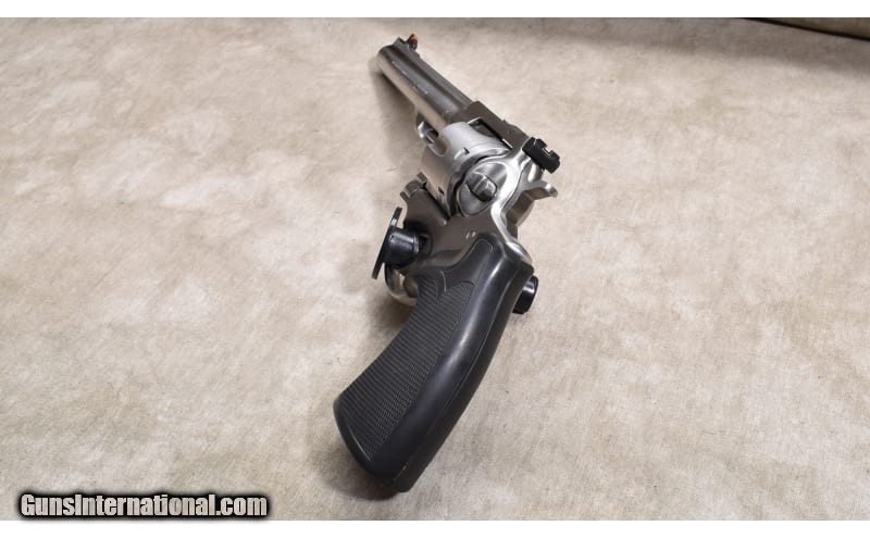 Description: Nice hunting revolver with adjustable sight, double action trigger, 7-1/2 inch barrel, and soft rubber grips. Manufactured in 1983. .44 Magnum SOLD Chambers: 6 rounds Metal Condition: Excellent. Wood Condition: Excellent. Bore Condition: Shiny and bright with good rifling. Barrels: 7-1/2 inch Triggers: Factory double and single action trigger. Butt Pad: Rubber Pachmyr Presentation grips. Weight: 59 oz. Sights: Serrated ramp with red insert and adjustable notch. Item Location: Rogers |