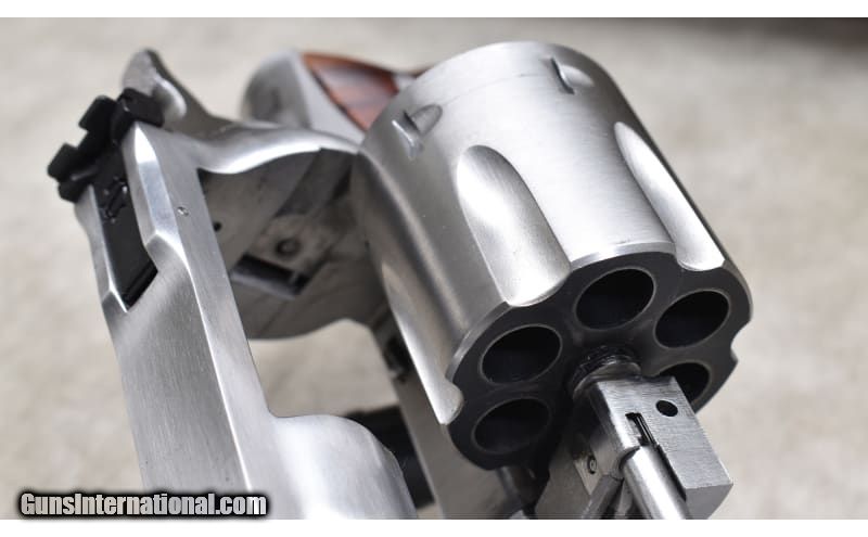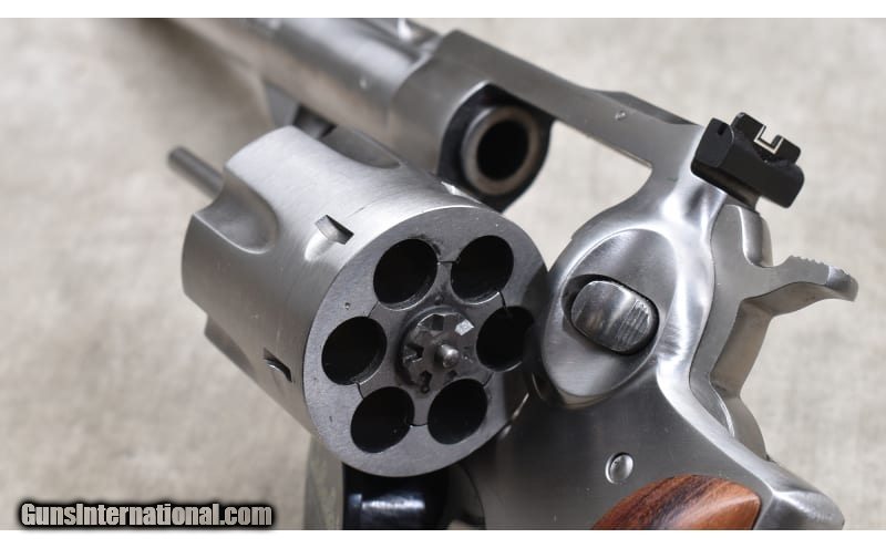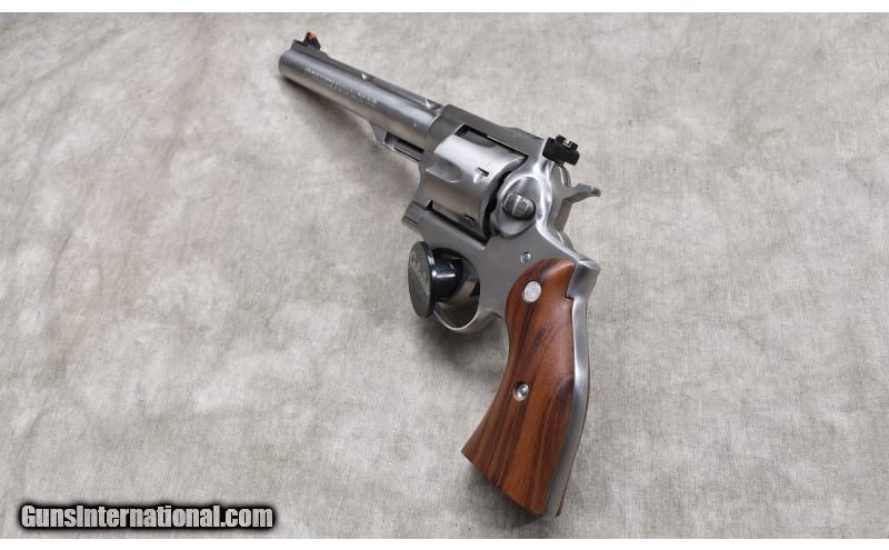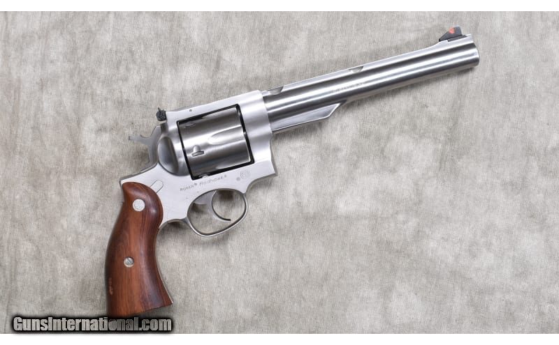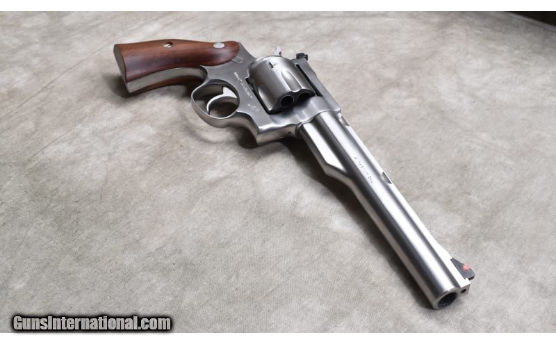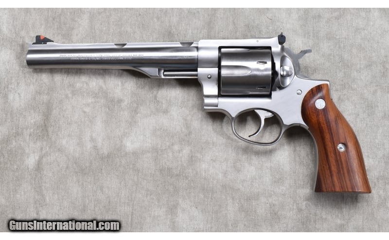 Description: All stainless steel construction and 7-1/2 inch barrel are features of this revolver. It will make a great hunting pistol and it comes with rings for scope mounting. .41 Remington Magnum SOLD Chambers: 6 rounds Metal Condition: Very good. Powder burn residue on the cylinder face. Wood Condition: Very good. Small chip. Bore Condition: Shiny and bright. Barrels: 7-1/2 inch Triggers: Factory double and single action trigger. Butt Pad: Smooth hardwood with Rugger medallions. Weight: 55 oz Sights: Serrated ramp with red insert and adjustable white outline notch. Set up for scope. Item Location: Rogers |