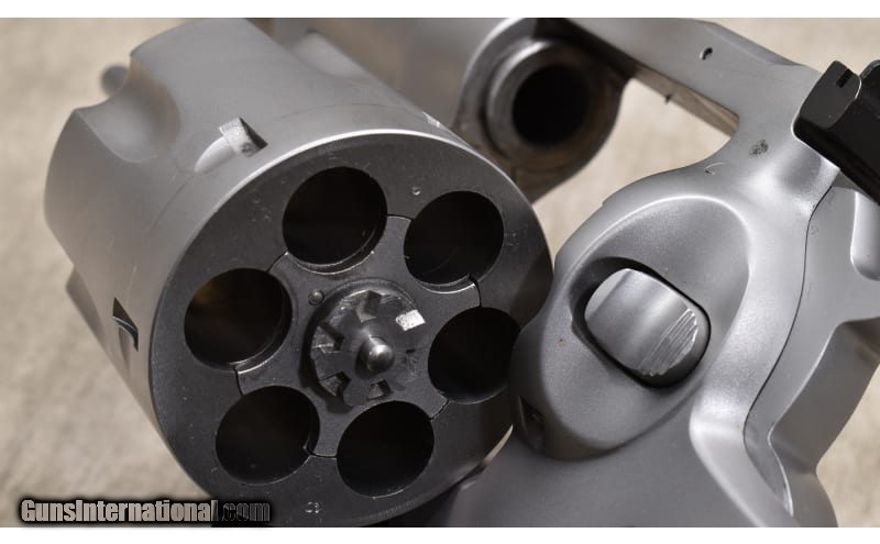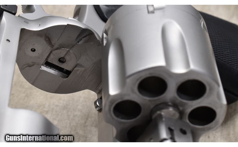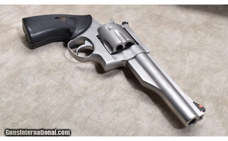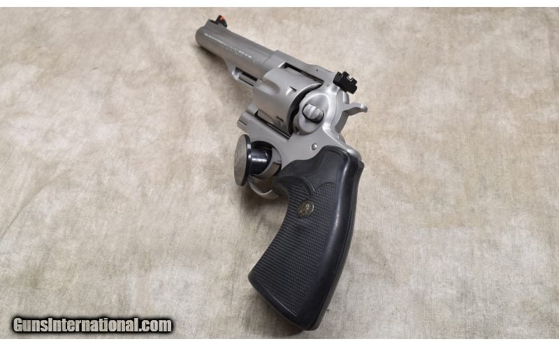 Description: Satin stainless steel, rubber grips, adjustable sights, and double/single action are all features of this revolver dating to 1991. .41 Remington Magnum SOLD Chambers: 6 rounds Metal Condition: Very good to excellent. There are a few very light handling marks and a light turn line. Wood Condition: Excellent. Bore Condition: Shiny and bright with good rifling. Barrels: 5-1/2 inch Triggers: Factory double and single action trigger. Butt Pad: Black rubber Pachmyr grips. Weight: 54 oz. Sights: Serrated ramp with red insert and adjustable notch. Item Location: Rogers |