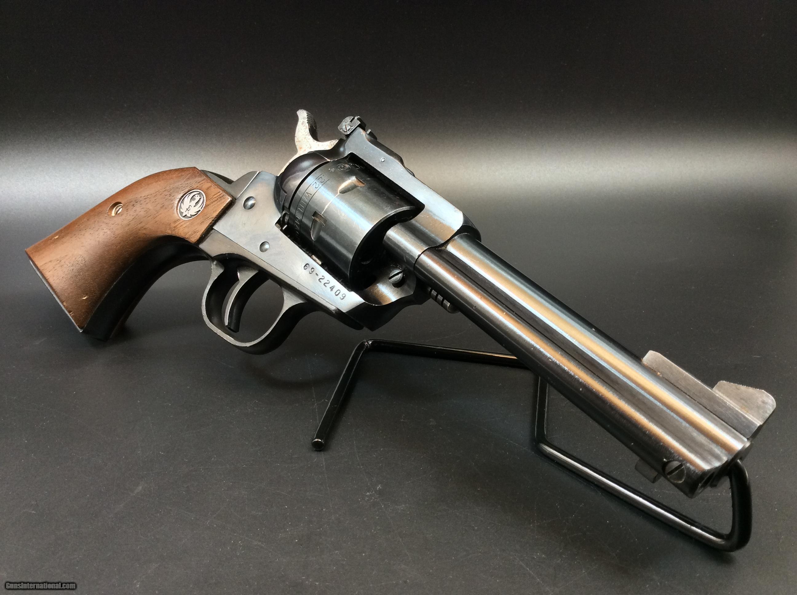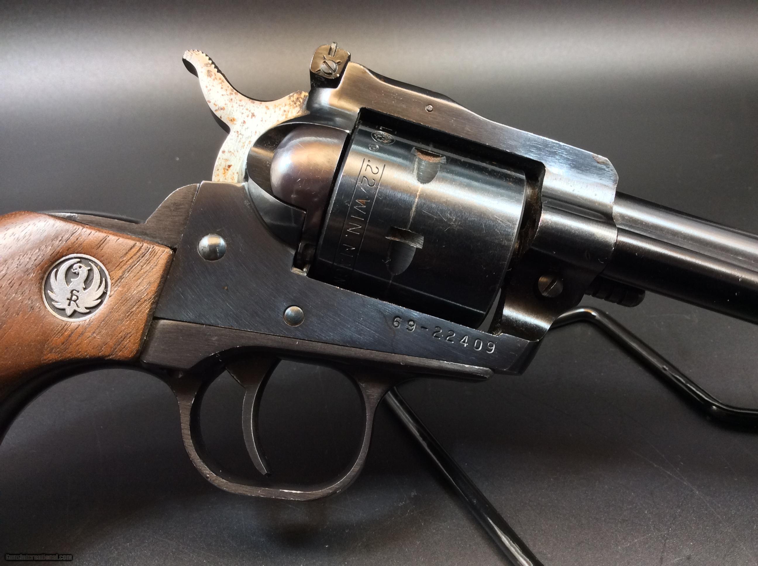 Description: Ruger New Model Single-Six .22 Magnum Cca. 1983. Windage and elevation adjustable rear sights. Patented transfer bar mechanism and loading gate interlock provide an unparalleled measure of security against accidental discharge. Cold hammer-forged barrel results in ultra-precise rifling that provides exceptional accuracy, longevity and easy cleaning. Rust on hammer, some wear on the finish near the left side of the muzzle, action wear on the cylinder and some nicks out of the wood grip, action is smooth and it still looks in great condition for its age. 4 ¾” barrel with a good bore. SOLD |