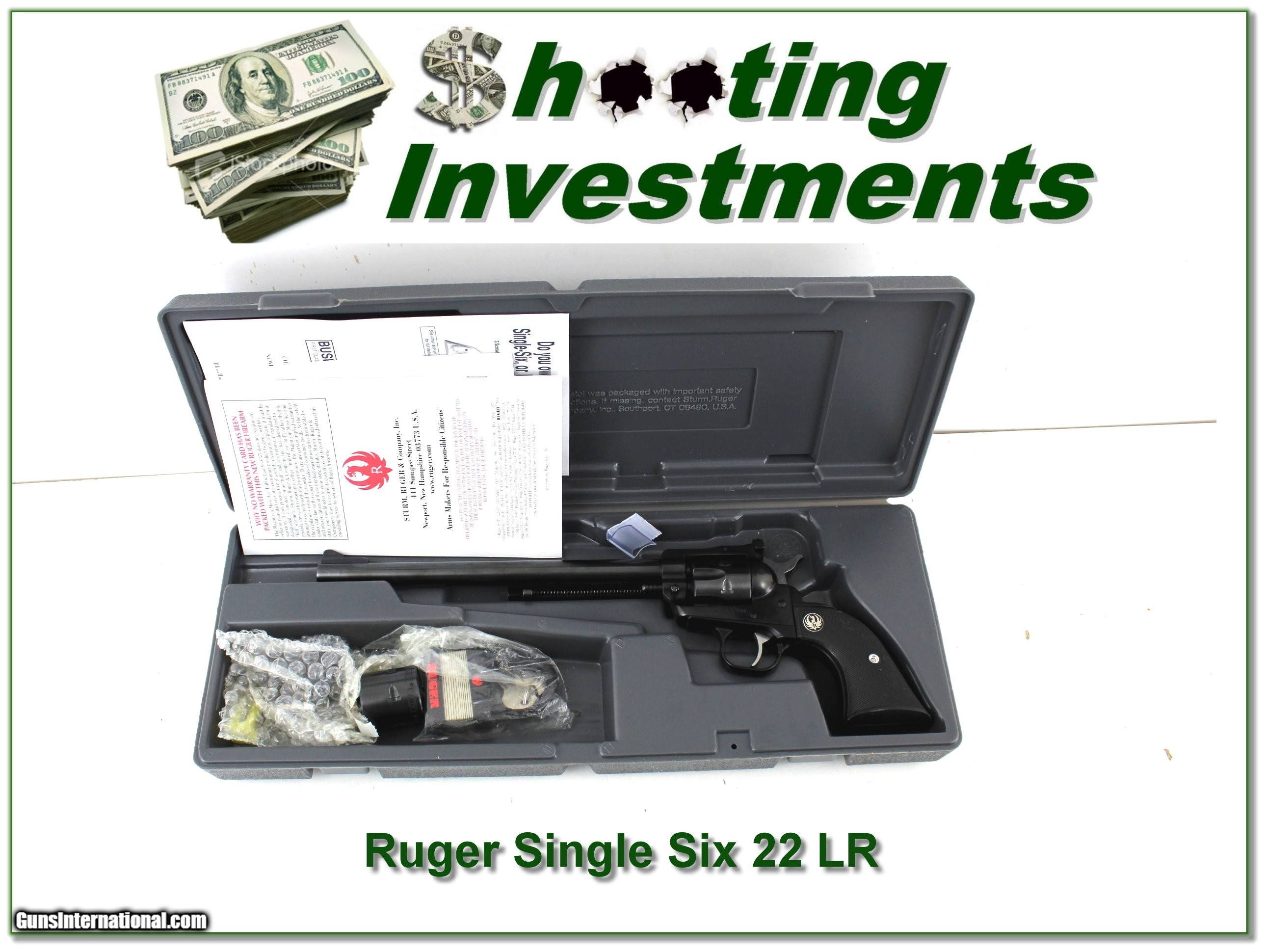 Description: This is a new and unfired Ruger Single Six with 9.5in barrel. It comes with both 22 LR and 22 Magnum cylinders. It comes in the original case with papers as seen. I am selling this one on consignment and as such lay-a-way can’t be used. It does of course have the standard 3-day inspection. Shipping and insurance is $39. Please email me with any questions or larger pictures. (Consign your quality firearms with Shooting Investments for only 12%! Let me know if you have any you would like to sell!) 24-0139 Payment: Payment is by Money Order, Cashier’s Check or Personal Check. I can now also accept Credit Cards (MasterCard, Visa, Discover & American Express) with a 3% convenience fee. Shipping: The shipping charge will be listed in each description. It is $49 for most firearms. Some heavy guns or those insured for over $2000 will be higher. Shipments to Alaska and Hawaii are higher because air shipment is required. Most firearms are shipped on Tuesday and Thursday and usually in 5 days of receipt of payment. We package all shipments carefully and insure them. Optics are shipped Priority Mail and most other non-firearm shipments are shipped First Class. Returns: Our return policy is simple. If for any reason you are not pleased with your purchase, you may return your item for a full refund of purchase price. Ammunition cannot be returned. It is important to us that you are happy. Guns cannot be fired or dissembled before returning them and they must be returned in the same condition as received. Notification of a return must occur within 3 days of receipt at your dealer. Shipping, convenience and dealer fees are not refundable and are the responsibility of the buyer. Lay-a-way: If needed, we offer a 60 day lay-a-way option on most firearms. It is 1/3 now, 1/3 in 30 days and 1/3 in 60 days. Lay-a-way firearm sales are final and cannot be returned. If a lay-a-way is not completed the first payment cannot be refunded. Consigning your firearms with Shooting Investments: We will help you get top dollar for your firearms. While most local guns shops charge 20% or more, our fee is only 12% with a minimum of $75. At your local gun shop it might take months to sell. Selling on-line provides instant access to thousands of interested buyers. You won’t find any other on-line dealer willing to sell your firearms for only 12% or listing every gun on 3 separate s. Selling through an House typically costs the seller 15% and the buyer an addition 15% (so 30%) and you have to wait several months to sell and longer to receive funds. If properly priced, we will sell your firearms within a few weeks. Send us an email or give us a call and we’ll explain how easy it is for you to get top dollar. Trading: Trading for us is really just buying your gun to re-sell. If you have a gun you want to trade, please email a picture and we will let you know what we can give for it. You will always get more if we sell it for you on consignment. SOLD |