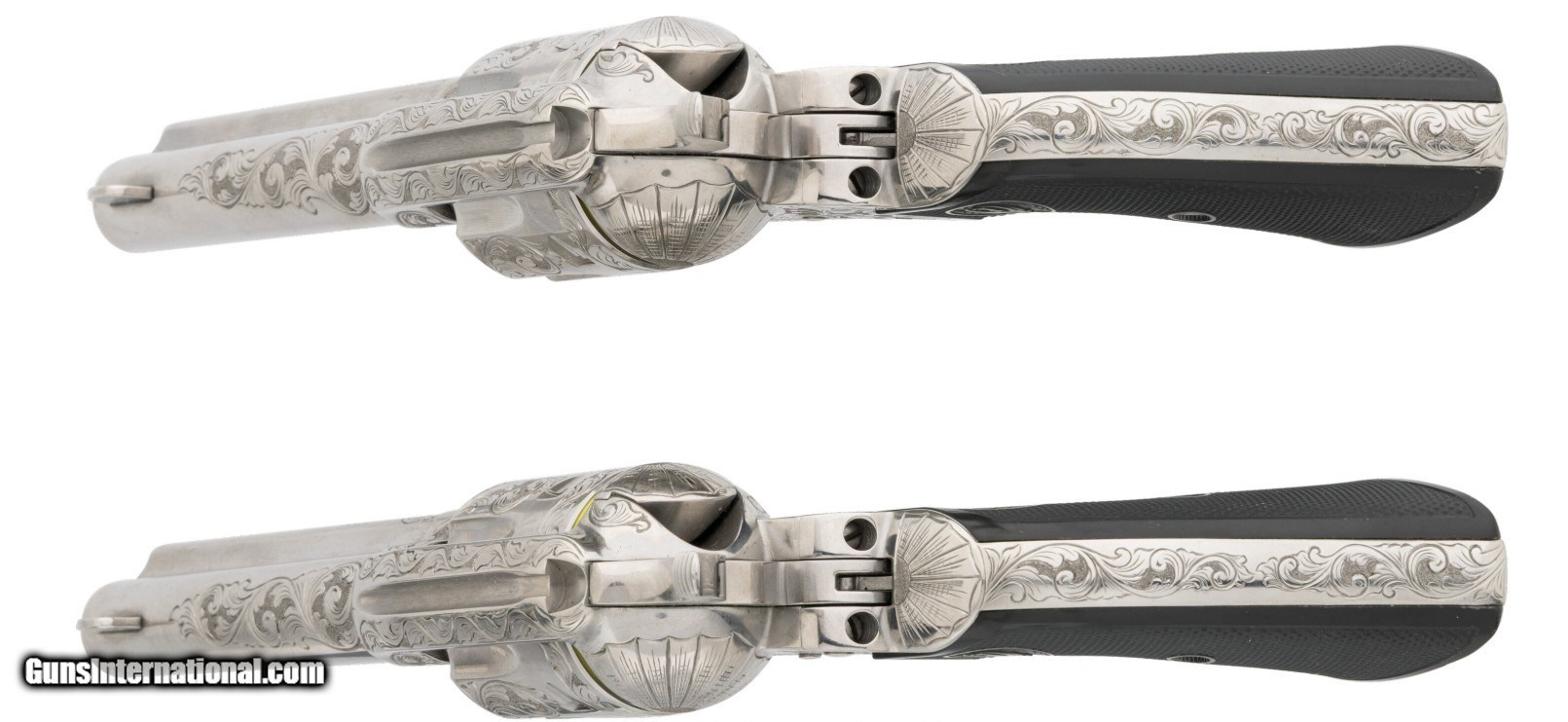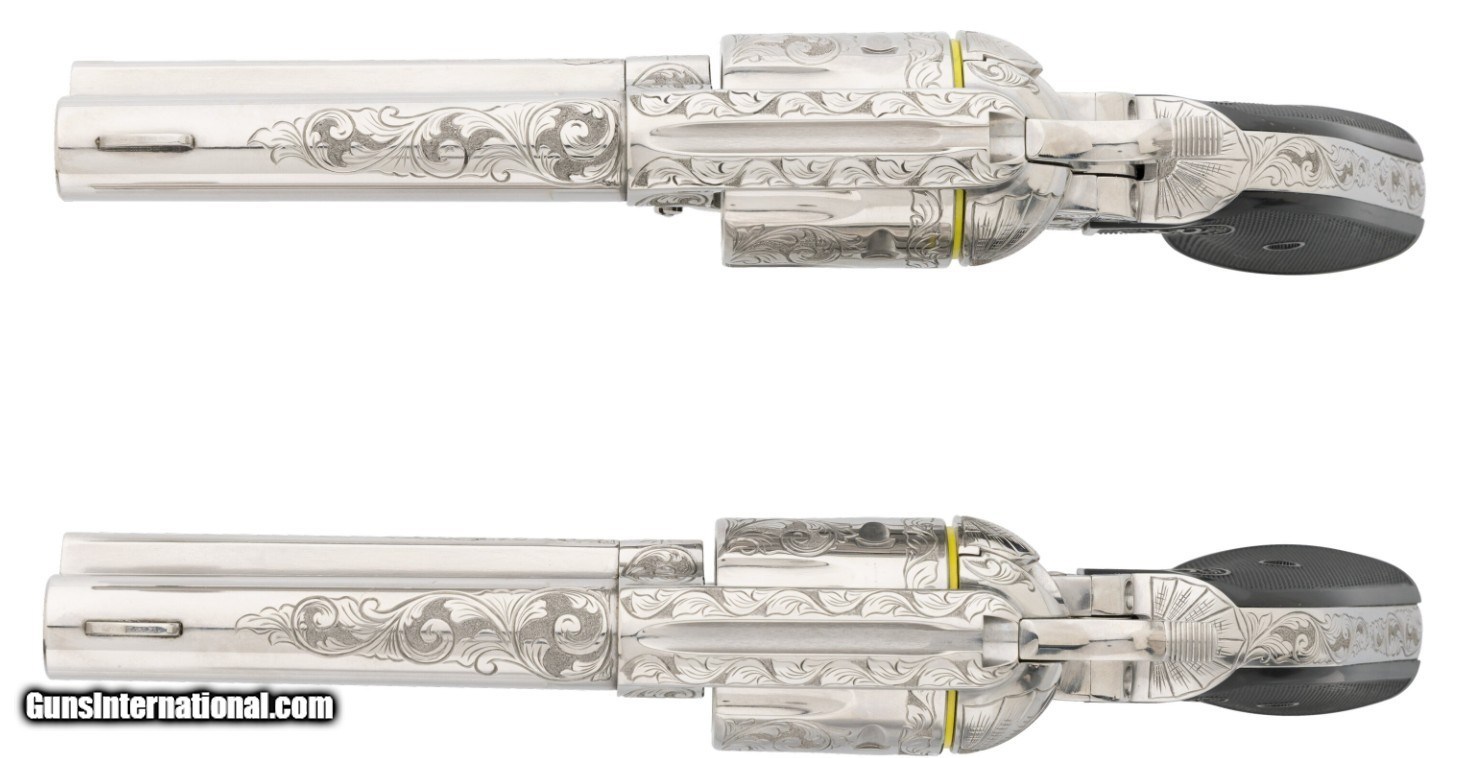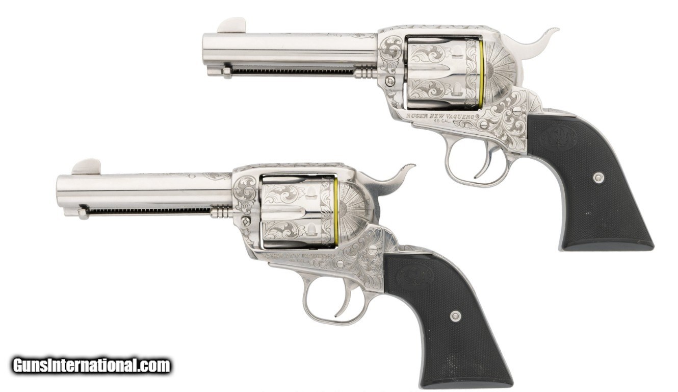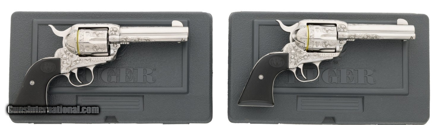 Description: Consecutively Serialized. Pair of Cased & Engraved Sturm Ruger Model New Vaquero Single Action Revolvers. Serial no's. 511-07761 & 511-07762, .45 calibers, 4 1/2-inch barrels with fixed front blade sights and frame notch rear sights. Nickel-plated finish. Elaborately scroll engraved barrel, frame, cylinder, triggerguard, backstrap and butt. Smooth factory hard-rubber grip panels with inlaid Ruger medallions. Each contained in fitted factory plastic carrying case. Each sold along with literature, lock, yellow cylinder disk and spent test-fire round. Consecutively serialized, meaning these came off the factory line back to back. The Ruger New Vaquero revolver is a beautifully crafted, modern take on the classic Old West single-action revolver. It's ideal for cowboy action shooting, collectors, and anyone who loves the feel of a traditional six-shooter with modern safety features. Engraved sets like these just add a little more flare. Condition: Excellent. Test-fire rounds are only shots for each. Actions crisp. Bores bright. Price: $5,000.00 Shipping: $100.00 Buy Now Pay with