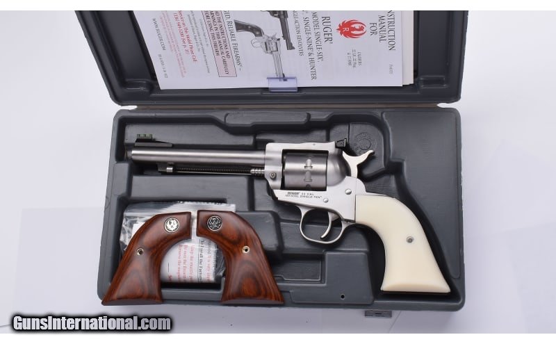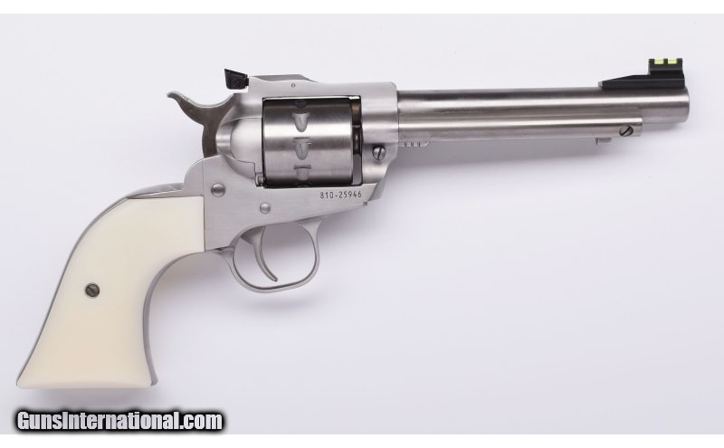 Description: Rugers 10-shot 22 RF single action with aftermarket Faux Ivory grip. Pre-owned in excellent overall condition with factory box, manual and original wood grip panels. Ask about availability of sequential serial numbered pair. .22 Long Rifle SOLD Metal Condition: Brushed Stainless Bore Condition: Excellent Barrels: 5.5 Triggers: Single Action Weight: 38 oz. Sights: Fiber enhanced adjustable sights Item Location: Buda, TX |