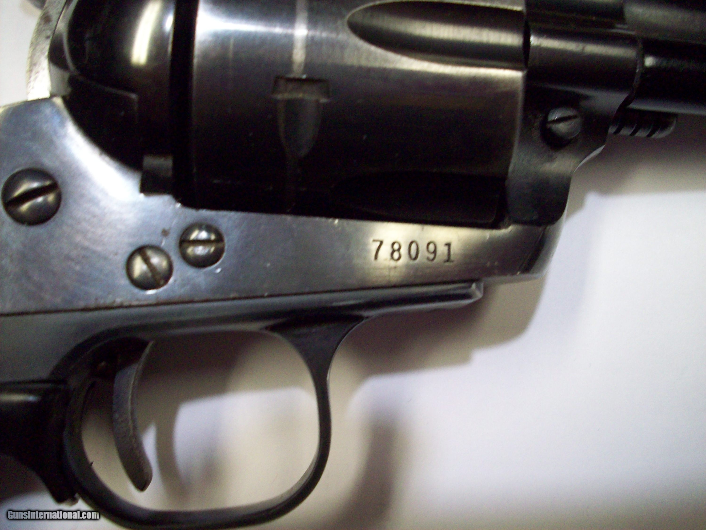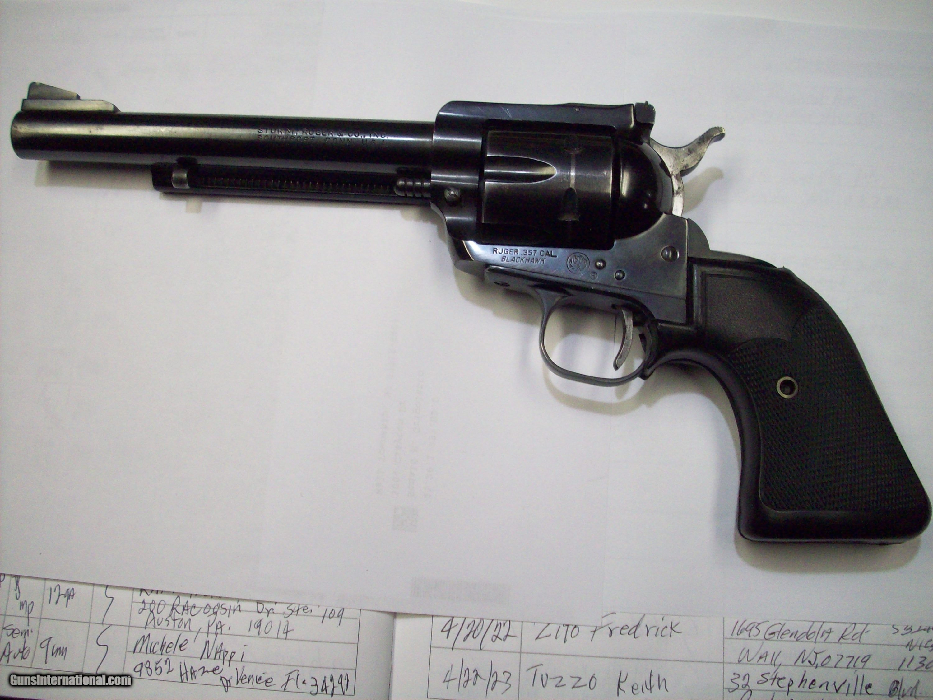 Description: This .357 MAGNUN is a Ruger THREE SCREW Blackhawk (Mfg. 1966) S# 78091. 6 1/2" barrel with adj. rear sight. Holster wear on left side of muzzle. Great light action trigger pull. $600.00 rmgrigolettoyahoo 732 280 8750. SOLD |