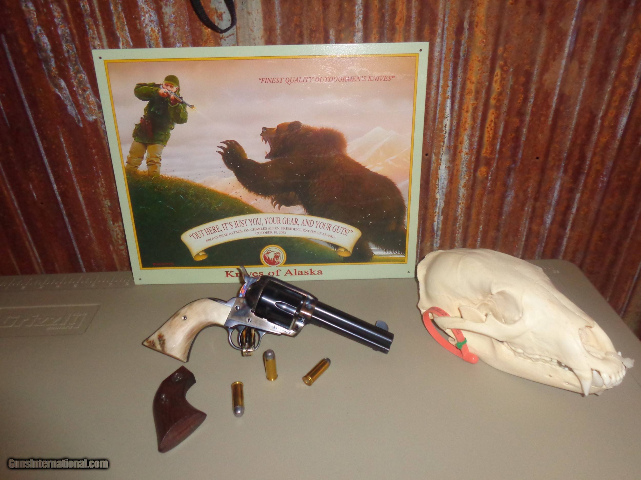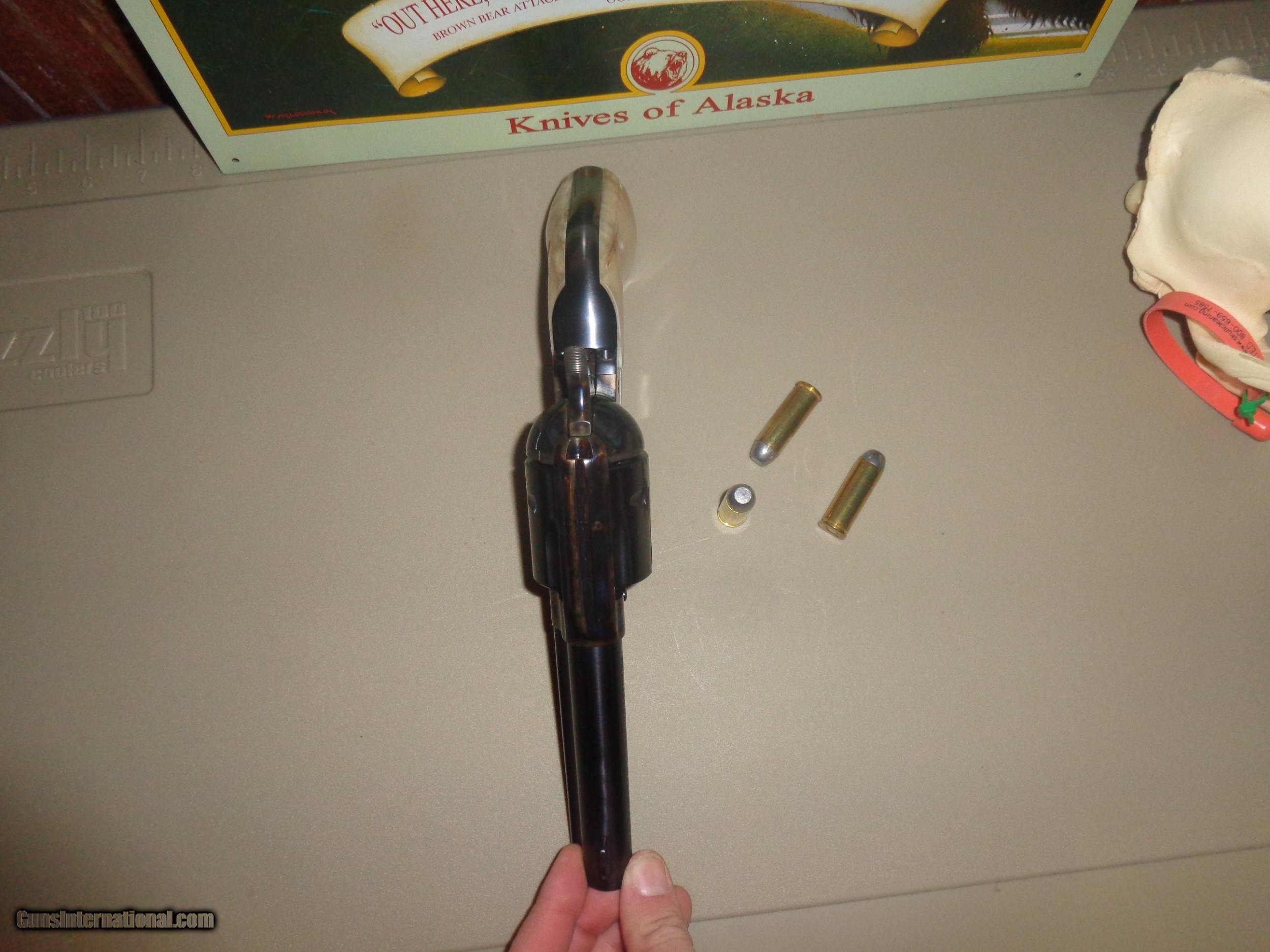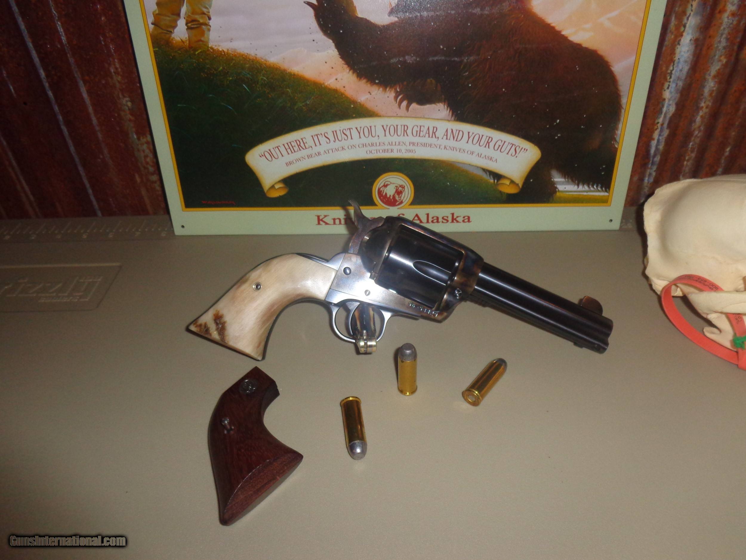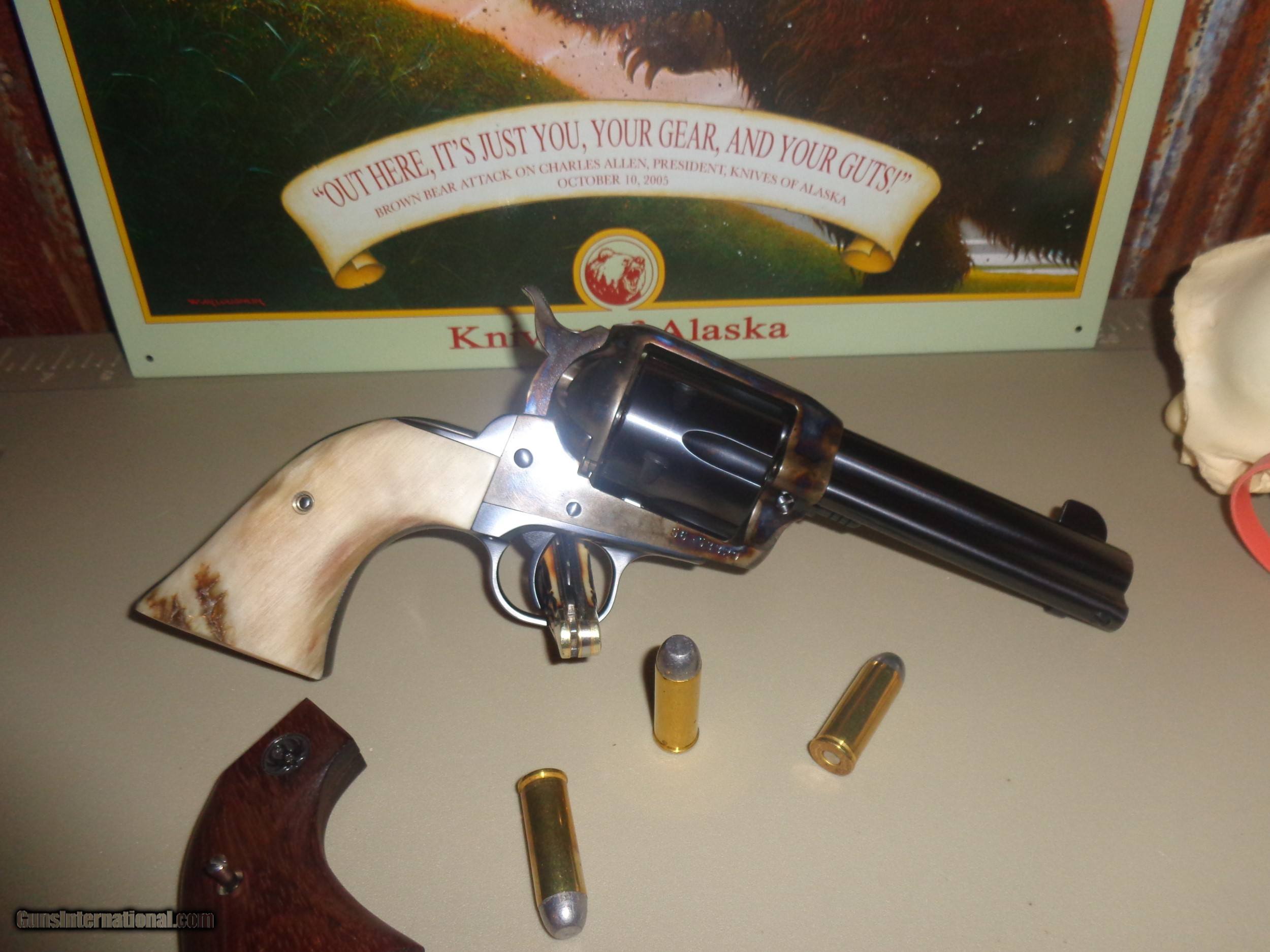 Description: Ruger Vaquero 45LC 4.62" made in 1997. This Ruger can handle the hottest 45LC loads including the extra long bullets , like a 365gr Garrett, Double Tap, or Buffalo Bore. Its been completely gone through, Blued, bone and charcoal color cased receiver-loading gate- and hammer, steel ejector rod housing, action , and sights regulated. Beautiful Ram Horn Grips by Nutmeg Sports custom fitted to the pistol, also comes with the original grips and aluminum ejector rod housing. FREE shipping anywhere in the lower 48 US! No box but does come with receits and paper work, plus a nice soft case. Have $615.00, $35.00 S&H, $25.00 transfer fee in the gun, $650.00 plus $84.00 S&H for grips, $1,234.00 from Turnbull for there work. Make an offer! SOLD Manufacturer: Ruger Model: Vaquero Serial Number: 56-53329 Barrel Length: 4.62 Caliber Info: 45 long colt Condition: Excellent Metal Condition: Excellent Bore Condition: Exellent Action: SA Finish: Color cased/Blued Sights: open fixed Manufacture Date: 1997 Extras: yes Case: soft case Item Location: Arkansas |
