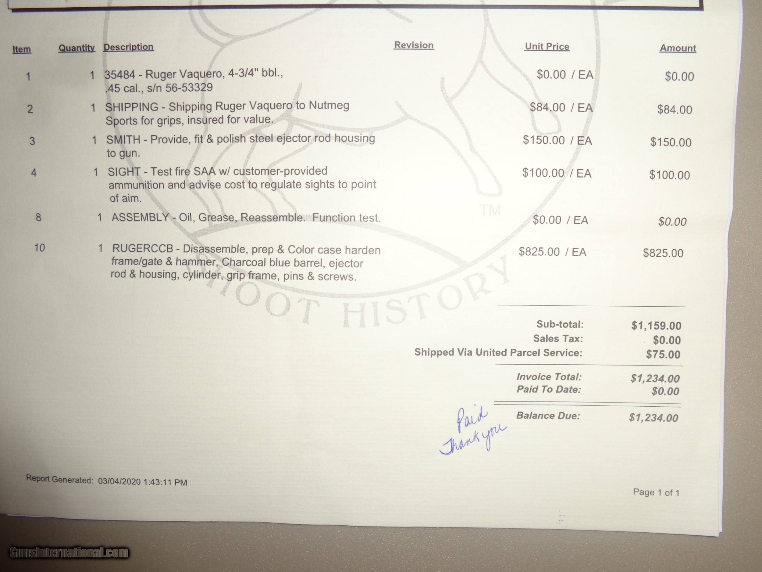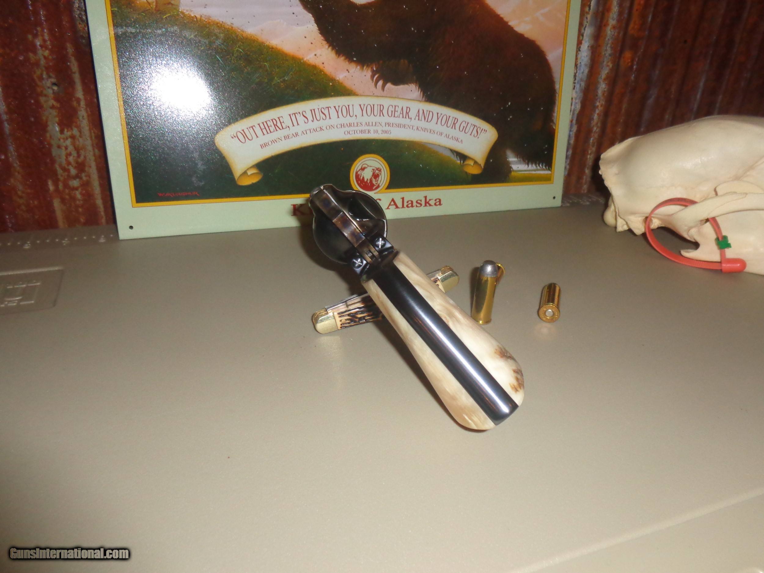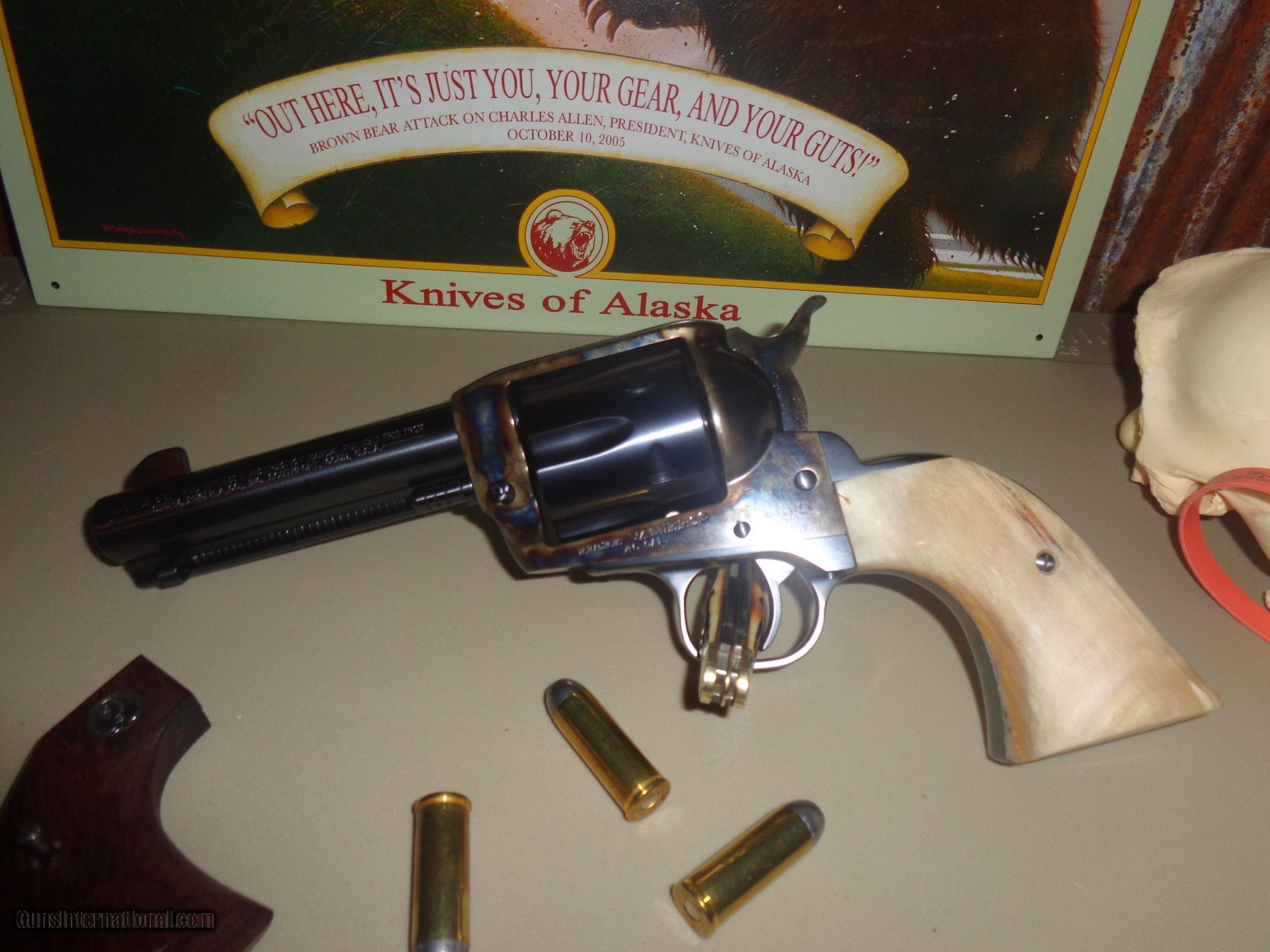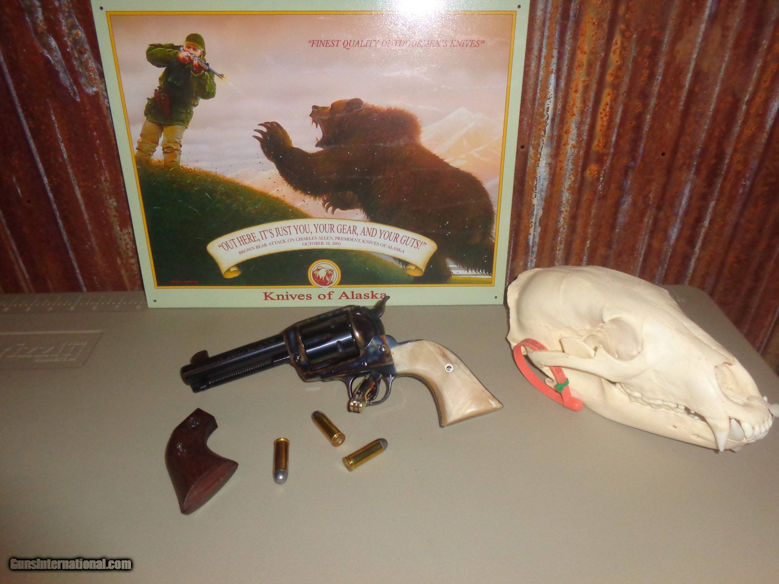 Description: Ruger Vaquero 45LC 4.62" made in 1997. This Ruger can handle the hottest 45LC loads including the extra long bullets , like a 365gr Garrett, Double Tap, or Buffalo Bore. Its been completely gone through, Blued, bone and charcoal color cased receiver-loading gate- and hammer, steel ejector rod housing, action , and sights regulated. Beautiful Ram Horn Grips by Nutmeg Sports custom fitted to the pistol, also comes with the original grips and aluminum ejector rod housing. FREE shipping anywhere in the lower 48 US! No box but does come with receits and paper work, plus a nice soft case. Have $615.00, $35.00 S&H, $25.00 transfer fee in the gun, $650.00 plus $84.00 S&H for grips, $1,234.00 from Turnbull for there work. Make an offer! SOLD Manufacturer: Ruger Model: Vaquero Serial Number: 56-53329 Barrel Length: 4.62 Caliber Info: 45 long colt Condition: Excellent Metal Condition: Excellent Bore Condition: Exellent Action: SA Finish: Color cased/Blued Sights: open fixed Manufacture Date: 1997 Extras: yes Case: soft case Item Location: Arkansas |