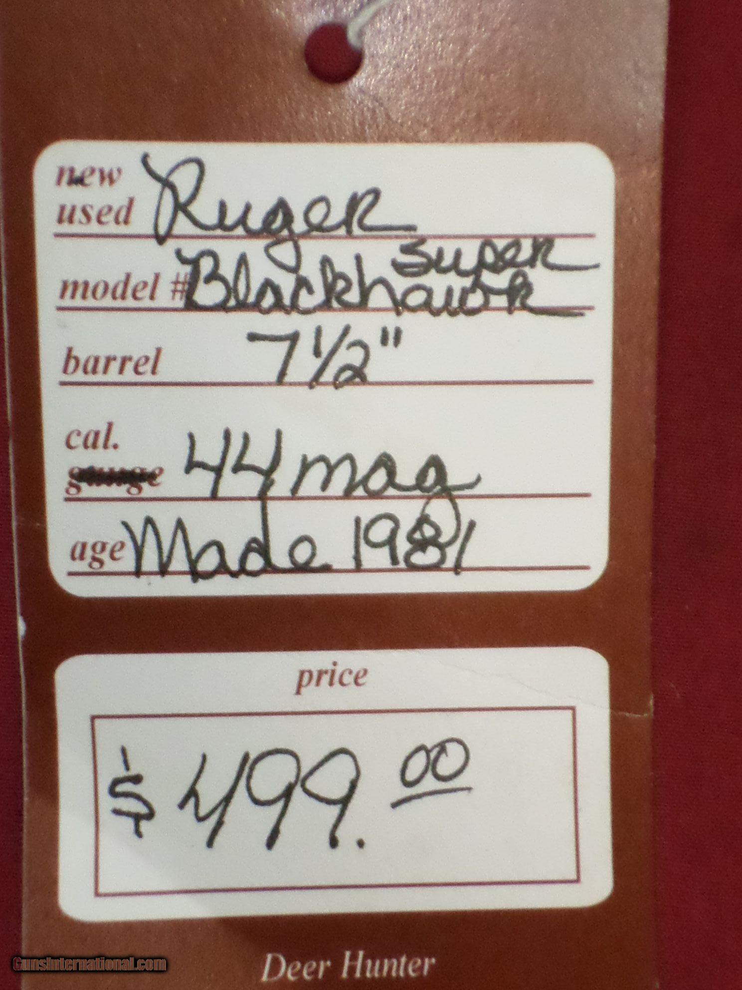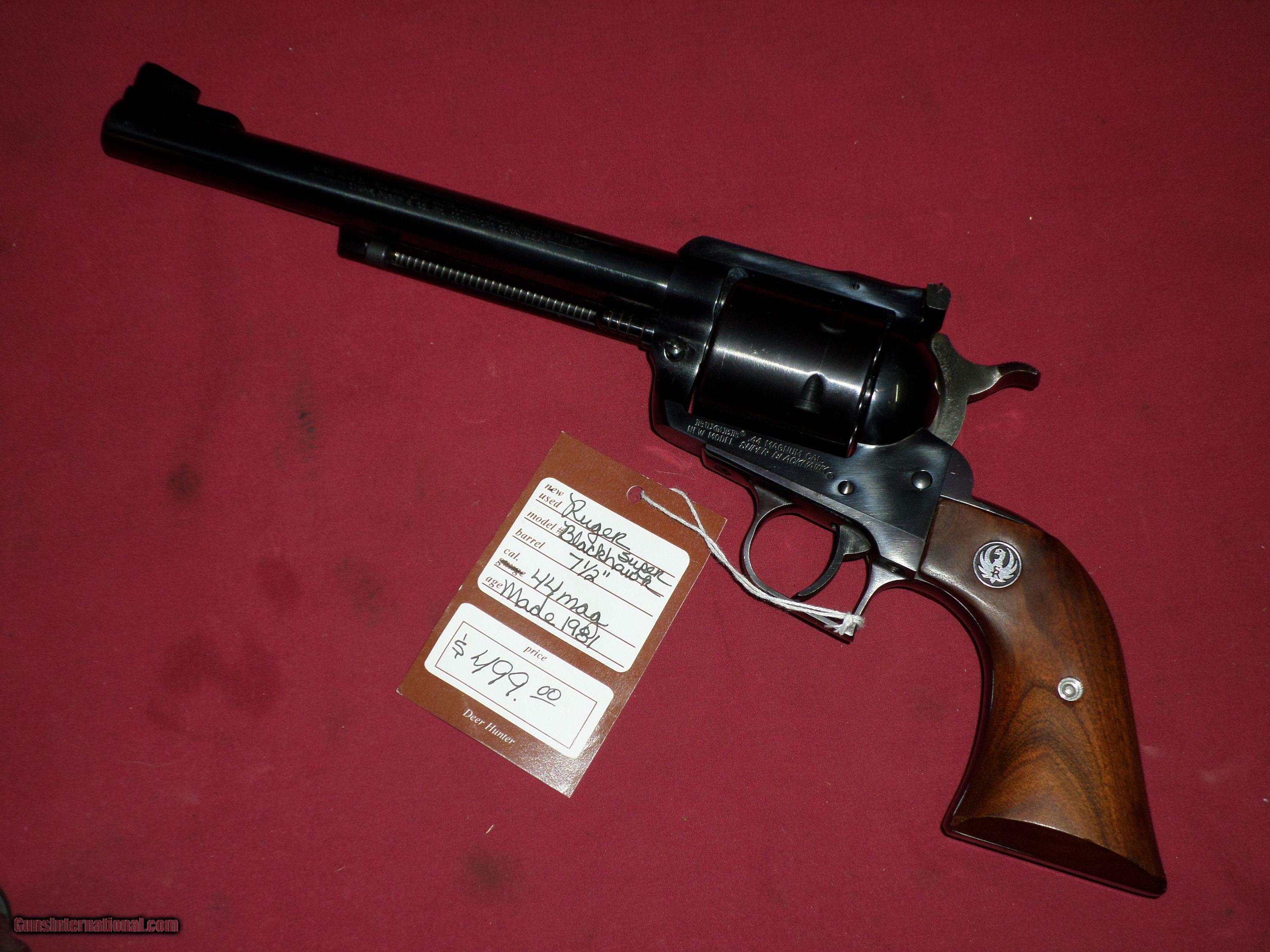 Description: SOLD For sale, Ruger Super Blackhawk, 7.5" blued, 44 Magnum. Excellent condition. Circa 1981 SOLD To see more of our inventory, visit deerhunterguns,com We collect 7% sales tax for Florida sales. We accept MC, Visa and Discover, no AmEx. No Sales to California. Like us on Facebook: Deer Hunter Guns SOLD |