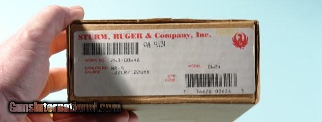 Description: 1994 NEW IN BOX RUGER NEW MODEL SINGLE-SIX CONVERTIBLE NR-9 .22LR / .22MRF (.22 WIN MAG) 9 1/2" BLUE REVOLVER. All matching including original box, end lable and shipping sleeve. New in unfired condition with both cylinders (one in velvet bag). Walnut grips. Adjustable rear sight. Box with sleeve includes manual, warranty card, original Ruger plastic bag, yellow chamber flag(for shipping) and original receipt from the one owner who bought it the year it was made. New Unfired condition with mint box AND shipping box sleeve just like gun. SOLD |