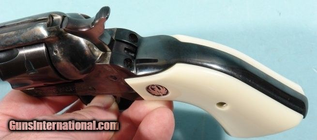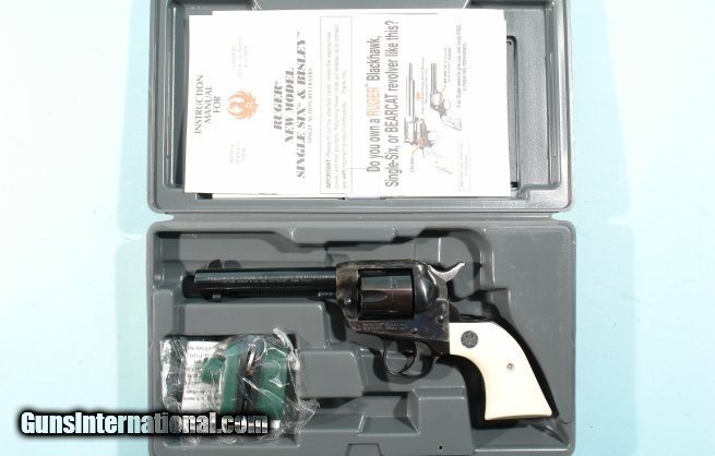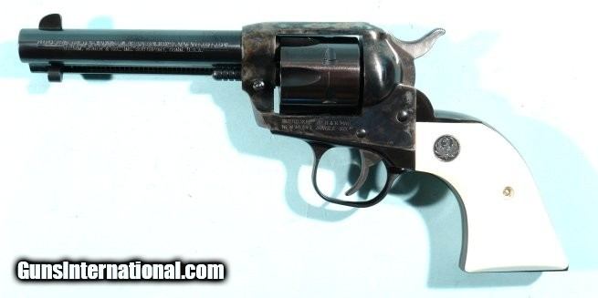 Description: RUGER NEW MODEL SINGLE SIX 32 H&R MAG. CAL. BLUE/CASE HARDENED 4 5/8” REVOLVER IN ORIGINAL BOX. Very near new possibly only test fired. Looks unused. Faux ivory Ruger Medallion grips. With security lock and Instruction Manual. SOLD |