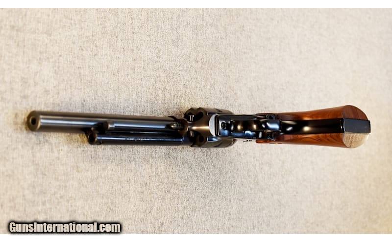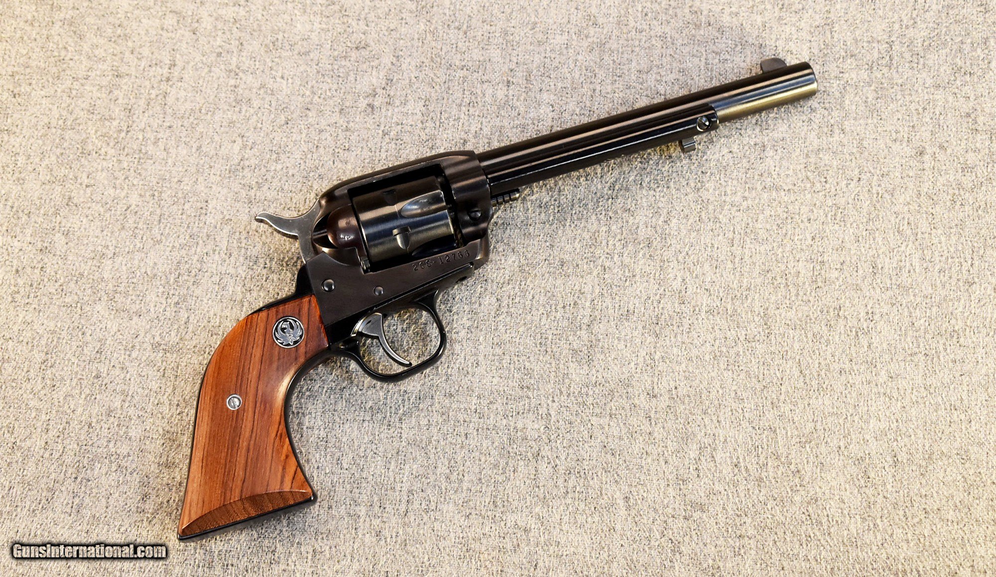 Description: This is a pre-owned Ruger New Model Single-Six convertible with .22 Long Rifle and .22 Magnum cylinders .22 Long Rifle/.22 Mag SOLD Metal Condition: "Very good overall with a few small scratches, light cylinder drag marks, light pitting on the cylinder, light wear to the blue at the muzzle and light plum color on the loading gate and hammer Wood Condition: Very good with a few small scratches Bore Condition: Clean with shallow rifling Barrels: 6.5 Triggers: SA Butt Pad: Smooth walnut grips Weight: 2 Lbs. 2 Oz. Sights: "Vaquero style sights, blade front, integral U-notch rear Item Location: Glendale, AZ |