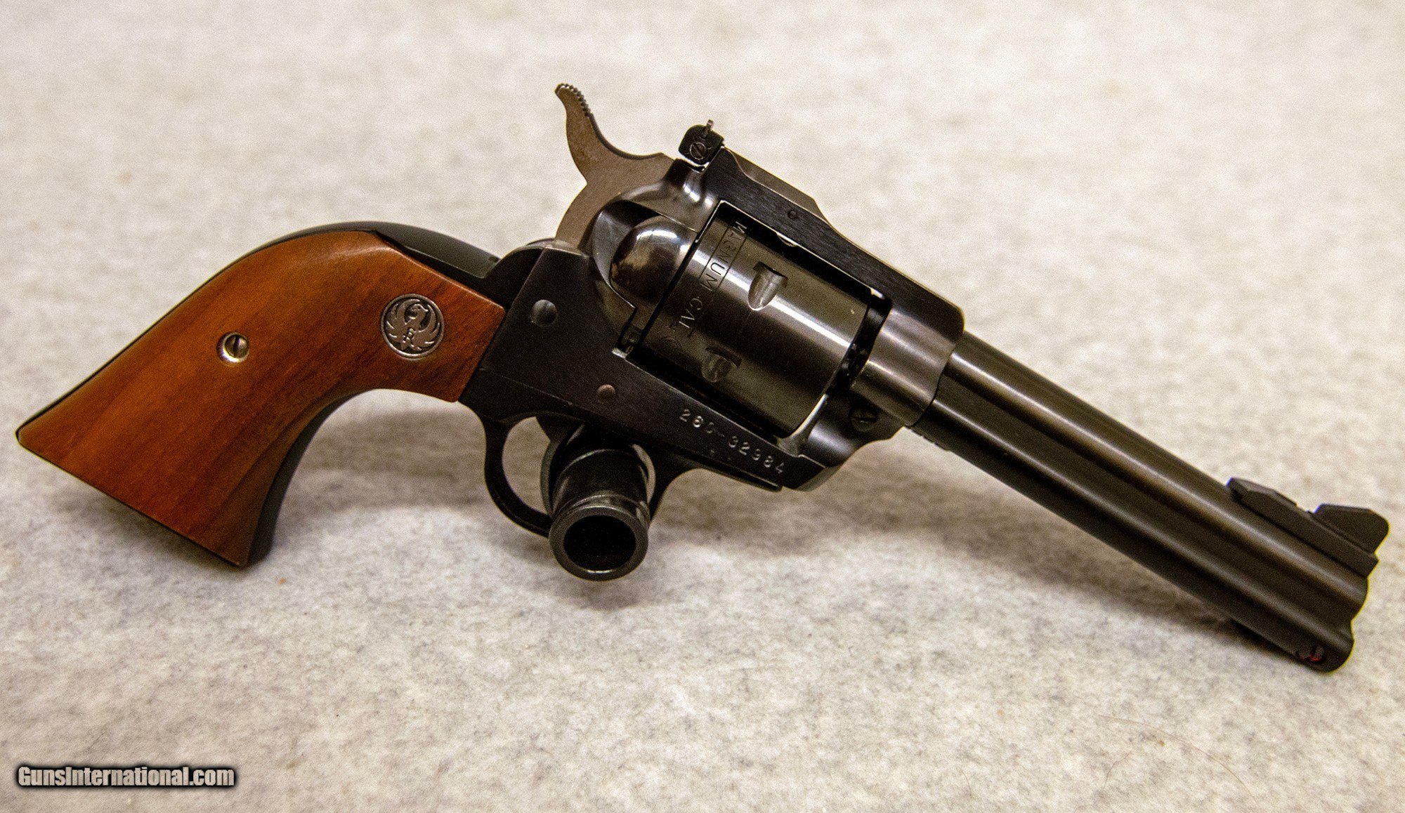 Description: Ruger New Model Single-Six Convertible, chambered in .22 WMR. Features include: 4 5/8 in. barrel, blue finish, 6 shot, similar to old Super Single Six, except has transfer bar safety, adj. rear sight, walnut grips, 33 oz. .22 WMR SOLD Chambers: .22 WMR Metal Condition: Excellent Wood Condition: Excellent Bore Condition: Excellent Barrels: 4 5/8'' Sights: "Adjustable Rear, Ramp Front Item Location: Fort Mill, SC |