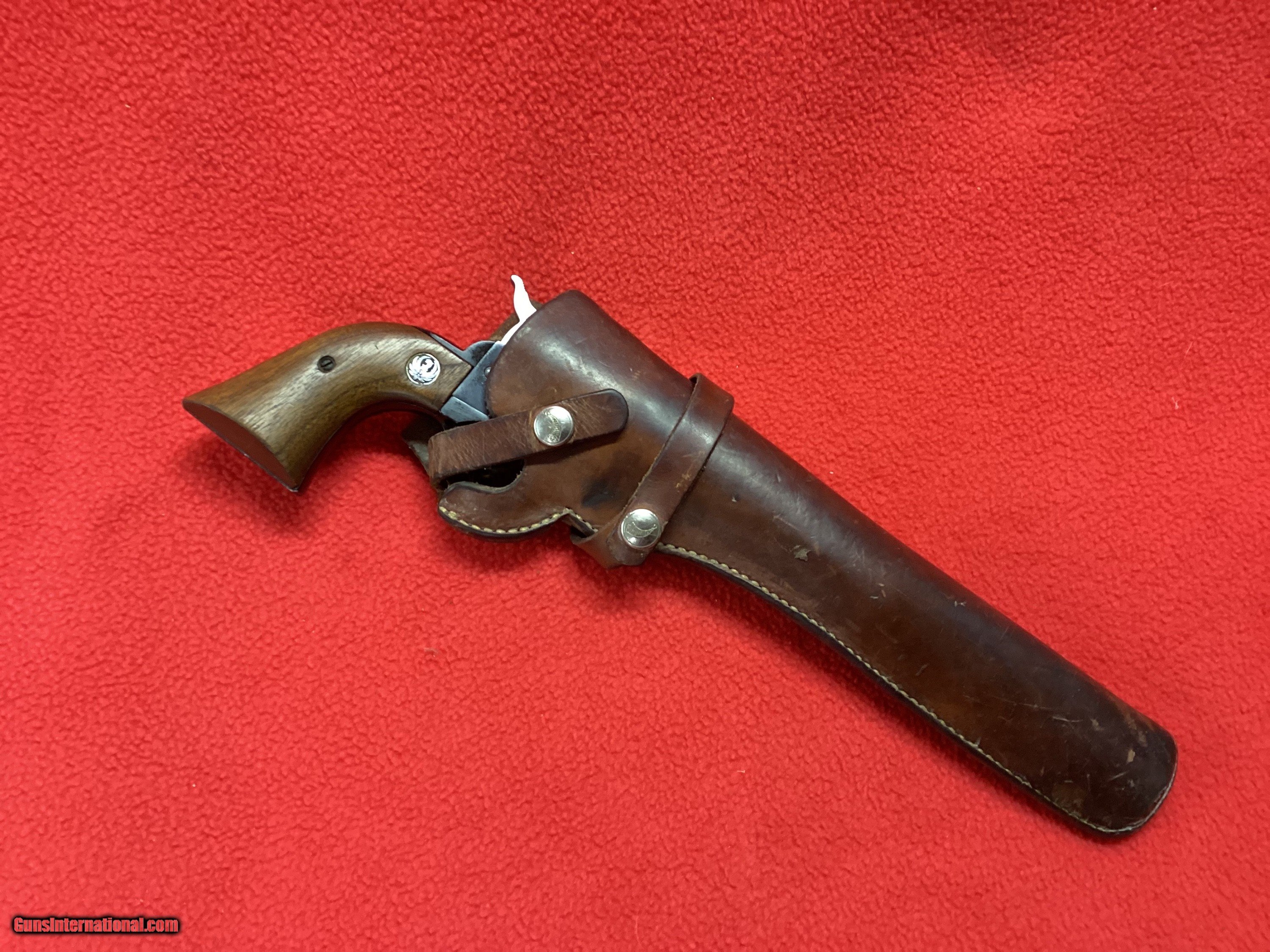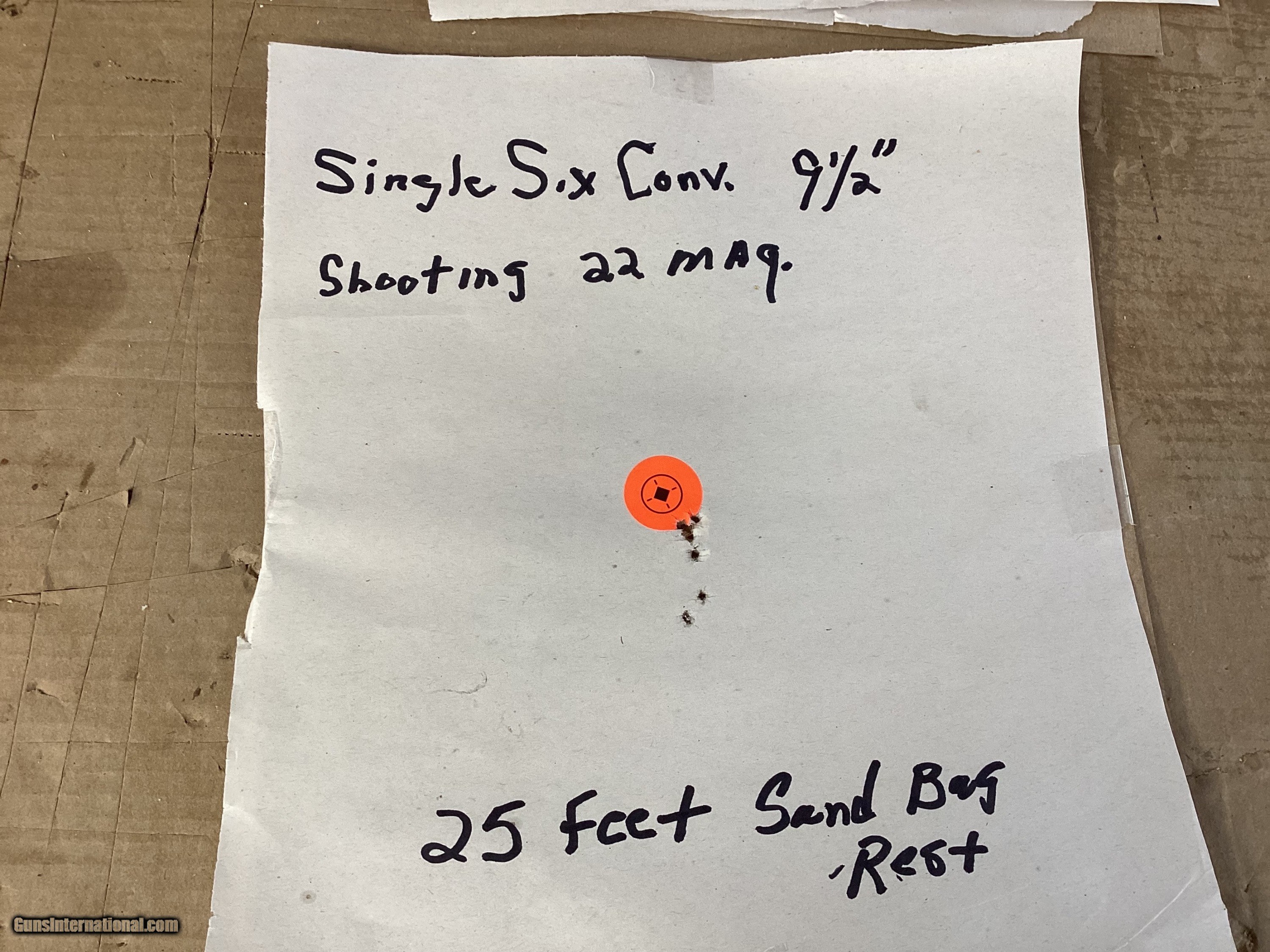 Description: FOR YOUR VIEWING FROM AN ESTATE IS A NEW MODEL SINGLE SIX CONVERTIBLE MODEL WITH THE 22 MAGNUM CYLINDER AND 9 1/2" BARREL. REVOLVER SHOOTS WELL, VERY CLEAN BORE, BUT DOES HAVE SOME BLUE LOSS DUE TO HOLSTER WARE FRONT OF BARREL. IT'S A CLEAN SHOOTER, VERY FUN TO SHOOT. SEE TARGET, NEED A FEW CLICKS ELEVATION FOR MY EYES. NOTE: SHIPPING AND INS. EXTRA CALL OR EMAIL FOR MORE INFO ETC. THANKS FOR LOOKING ASK ABOT MY 90 DAY EZ PAYMENT PLAN SOLD |