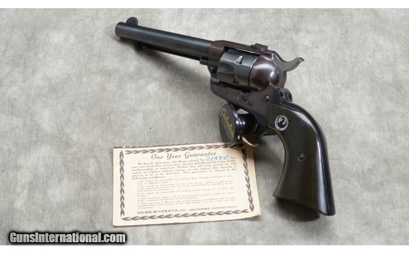 Description: This unconverted flat gate Single Six features like new condition. It appears unfired and includes the black box, factor papers and the warrantee hang tag s/n number matches the gun. .22 Long Rifle SOLD Chambers: 6 shot single action revolver. Metal Condition: Excellent - could pass for new, certainly hasn't been shot much if at all. Wood Condition: Excellent- could pass for new. Barrels: 6-1/2 Inch. Triggers: Factory single action trigger. Sights: Fixed blade and notch. Item Location: Rogers |