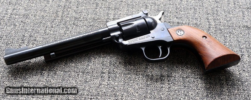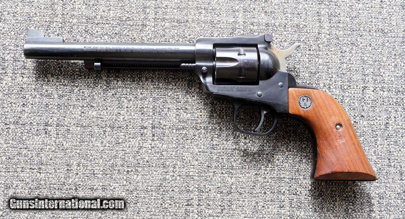 This is an early Ruger Single Six, six shot revolver in 32 H& R Magnum. It is finished in blue steel and black aluminum and has a 6 1/2" barrel. It has an adjustable rear notched sight and ramped blade front sight. It is equipped with walnut grips with the standard Ruger eagle medallion.