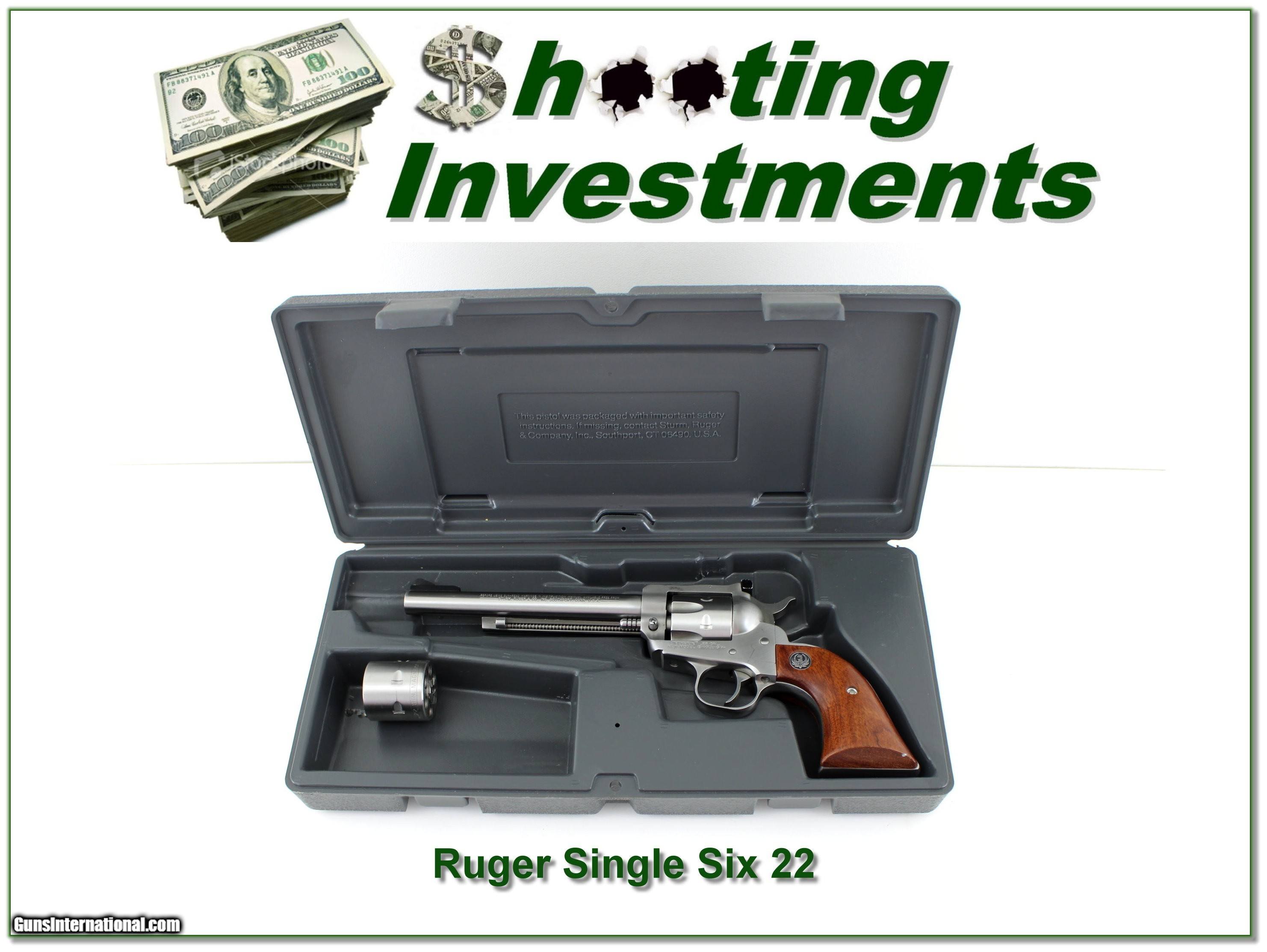 Description: Ruger Single-Six Stainless Revolver with 6.5" barrel, chambered in .22 LR and .22 Mag (includes both cylinders). Durable stainless steel finish, classic single-action design, and outstanding accuracy. Perfect for target shooting or small game. In very good condition with a few small marks and rubs on the metal—versatile, reliable, and built to last. A must-have for any shooter. This revolver includes the original case as well. I am selling this one on consignment and as such lay-a-way can’t be used. It does of course have the standard 3-day inspection. Shipping and insurance is $39. Please email me with any questions or larger pictures. (Consign your quality firearms with Shooting Investments for only 12%! Let me know if you have any you would like to sell!) 25-0702 Payment: Payment is by Money Order, Cashier’s Check or Personal Check. I can now also accept Credit Cards (MasterCard, Visa, Discover & American Express) with a 3% convenience fee. Shipping: The shipping charge will be listed in each description. It is $49 for most firearms. Some heavy guns or those insured for over $2000 will be higher. Shipments to Alaska and Hawaii are higher because air shipment is required. Most firearms are shipped on Tuesday and Thursday and usually in 5 days of receipt of payment. We package all shipments carefully and insure them. Optics are shipped Priority Mail and most other non-firearm shipments are shipped First Class. Returns: Our return policy is simple. If for any reason you are not pleased with your purchase, you may return your item for a full refund of purchase price. Ammunition cannot be returned. It is important to us that you are happy. Guns cannot be fired or dissembled before returning them and they must be returned in the same condition as received. Notification of a return must occur within 3 days of receipt at your dealer. Shipping, convenience and dealer fees are not refundable and are the responsibility of the buyer. Lay-a-way: If needed, we offer a 60 day lay-a-way option on most firearms. It is 1/3 now, 1/3 in 30 days and 1/3 in 60 days. Lay-a-way firearm sales are final and cannot be returned. If a lay-a-way is not completed the first payment cannot be refunded. Consigning your firearms with Shooting Investments: We will help you get top dollar for your firearms. While most local guns shops charge 20% or more, our fee is only 12% with a minimum of $100. At your local gun shop it might take months to sell. Selling on-line provides instant access to thousands of interested buyers. You won’t find any other on-line dealer willing to sell your firearms for only 12% or listing every gun on 3 separate s. Selling through an House typically costs the seller 15% and the buyer an addition 15% (so 30%) and you have to wait several months to sell and longer to receive funds. If properly priced, we will sell your firearms within a few weeks. Send us an email or give us a call and we’ll explain how easy it is for you to get top dollar. Trading: Trading for us is really just buying your gun to re-sell. If you have a gun you want to trade, please email a picture and we will let you know what we can give for it. You will always get more if we sell it for you on consignment. SOLD |