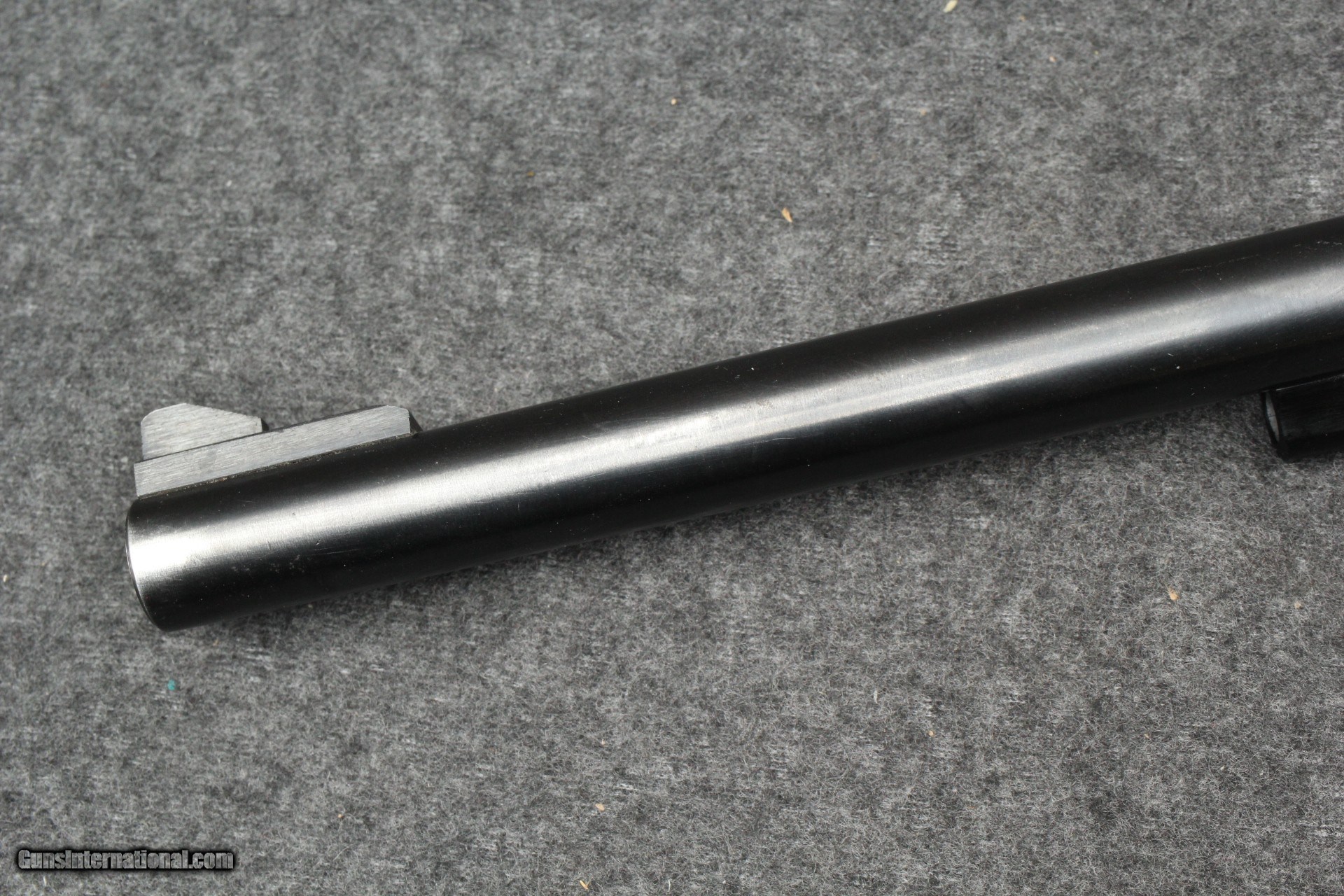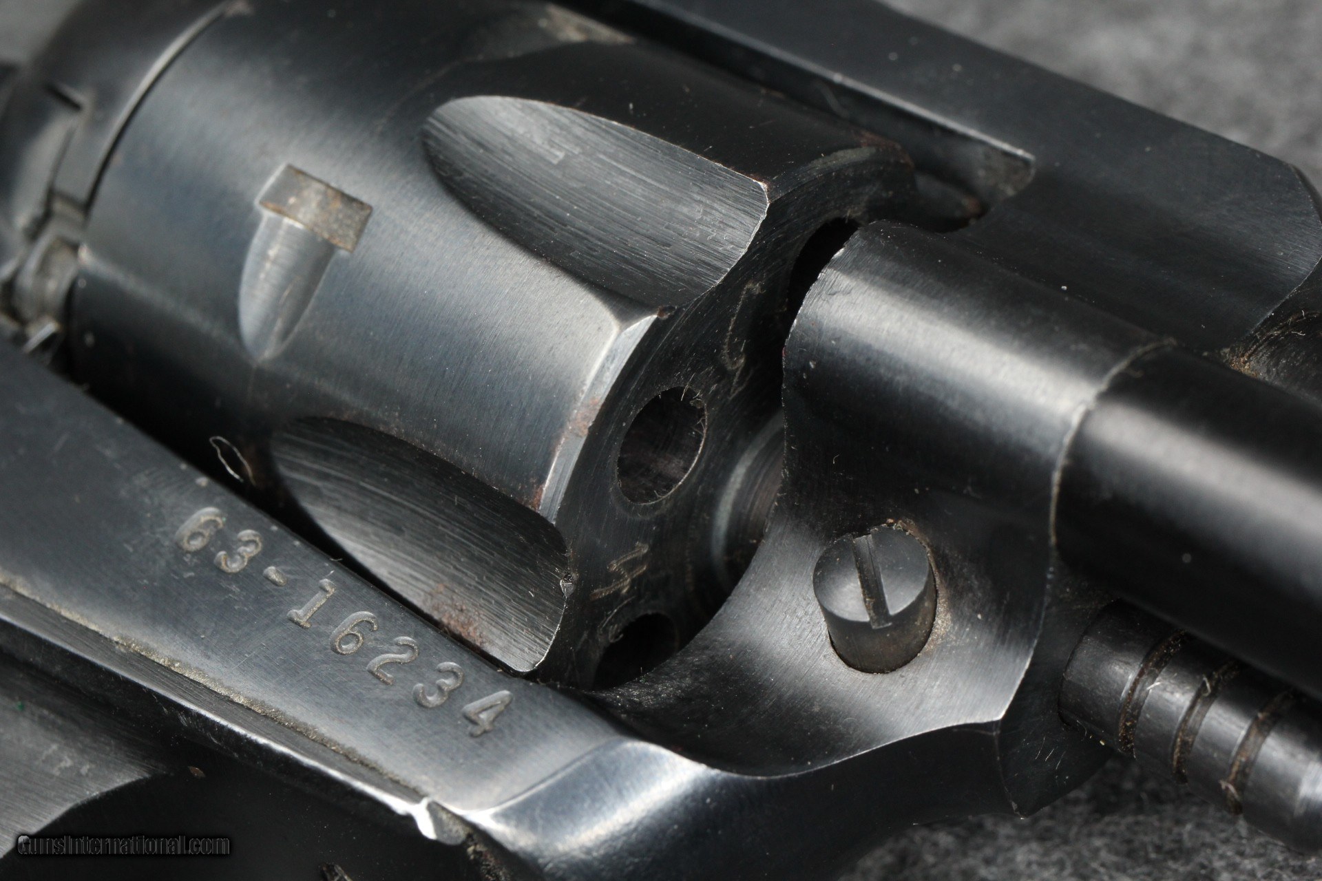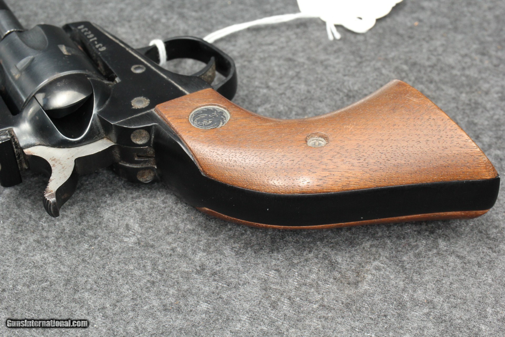 Description: Serial number 63-162XX. Mfg 1974. 9.5" barrel. New model Single Six convertable but only comes with 22 Mag cylinder. Previous ower's drivers license on bottom of grip frame. Overall in good condition, shows normal wear. Moderate blue wear at muzzle, cylinder ring and small spots of rust on frame, hammer and cylider. Bore is excellent. More photos on request. Plesae add $45.00 for shipping and insurance. Will ship to C&R. SOLD Curio/Relic: Yes Handgun Caliber: .22 WMR (.22 Magnum) |