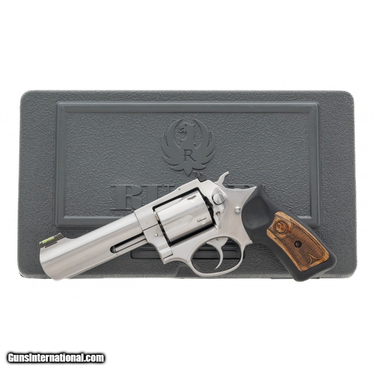 Description: " SN:575-39618. Double action 4"" target 5 shot revolver with a fiber optic adjustable sight system, checkered wood inlaid grip with synthetic rubber grip frames. In excellent condition. In box. SOLD |