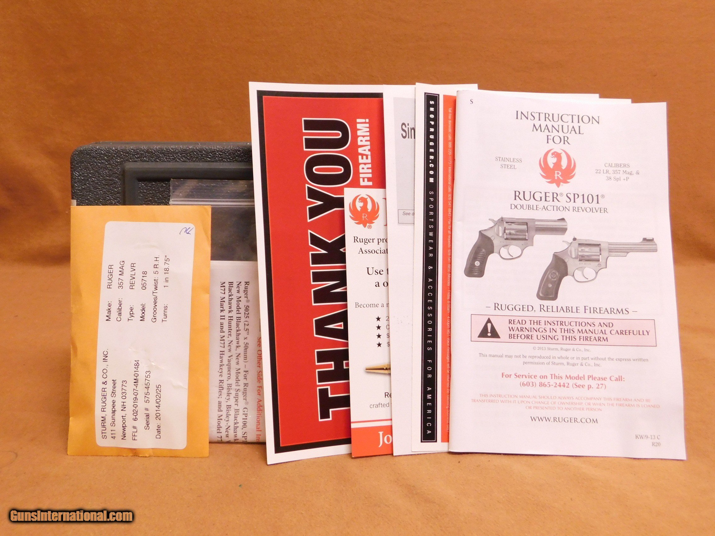 Description: This is a very nice and clean Ruger Model SP101 in .357 Magnum. It has a 2.25-inch barrel and a satin stainless finish. The gun looks fantastic, with no scratches or external wear found upon visual inspection. It comes with its original, grey plastic box, fired case, and paperwork. All items are also available for sale in our brick & mortar store and are subject to prior sale. Think long, think wrong. Payment On firearms, we typically only accept credit cards or money orders/cashier's checks.