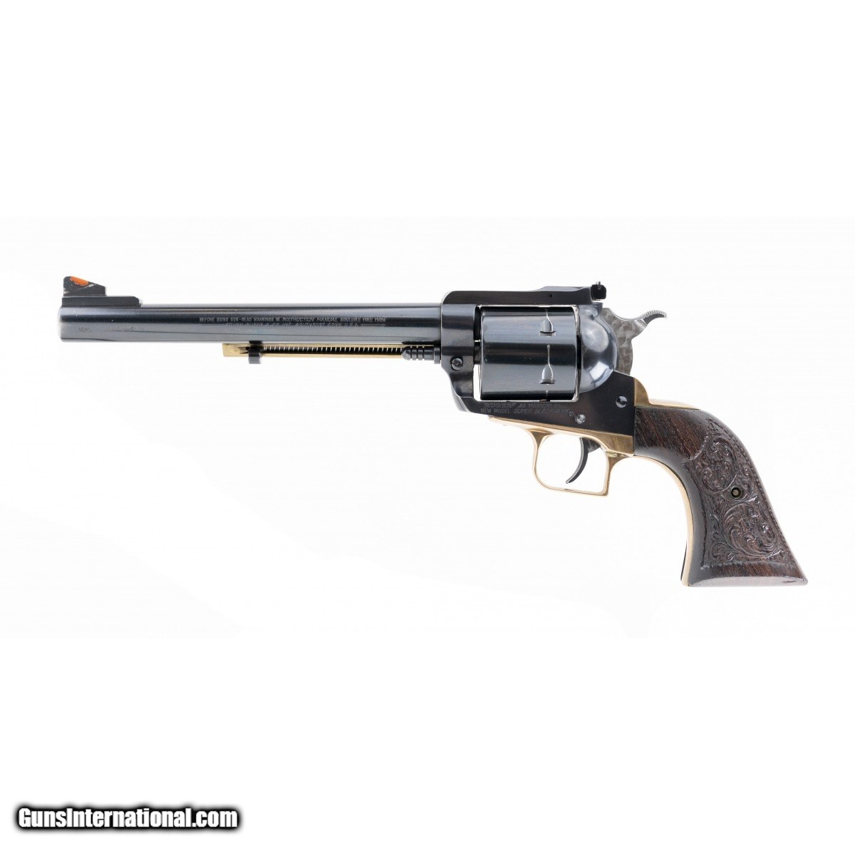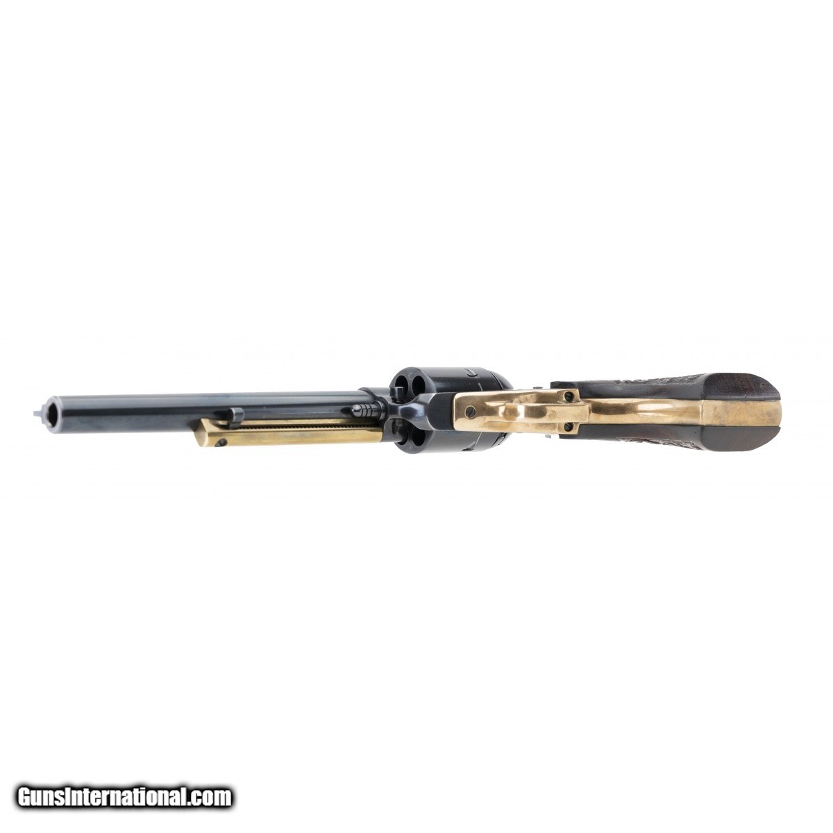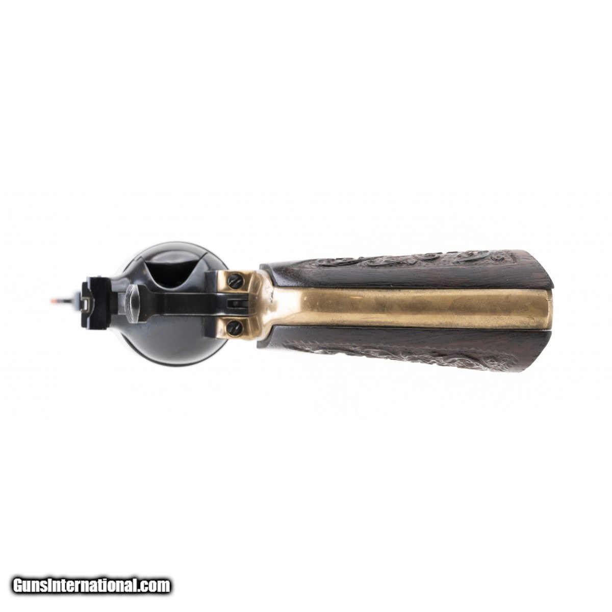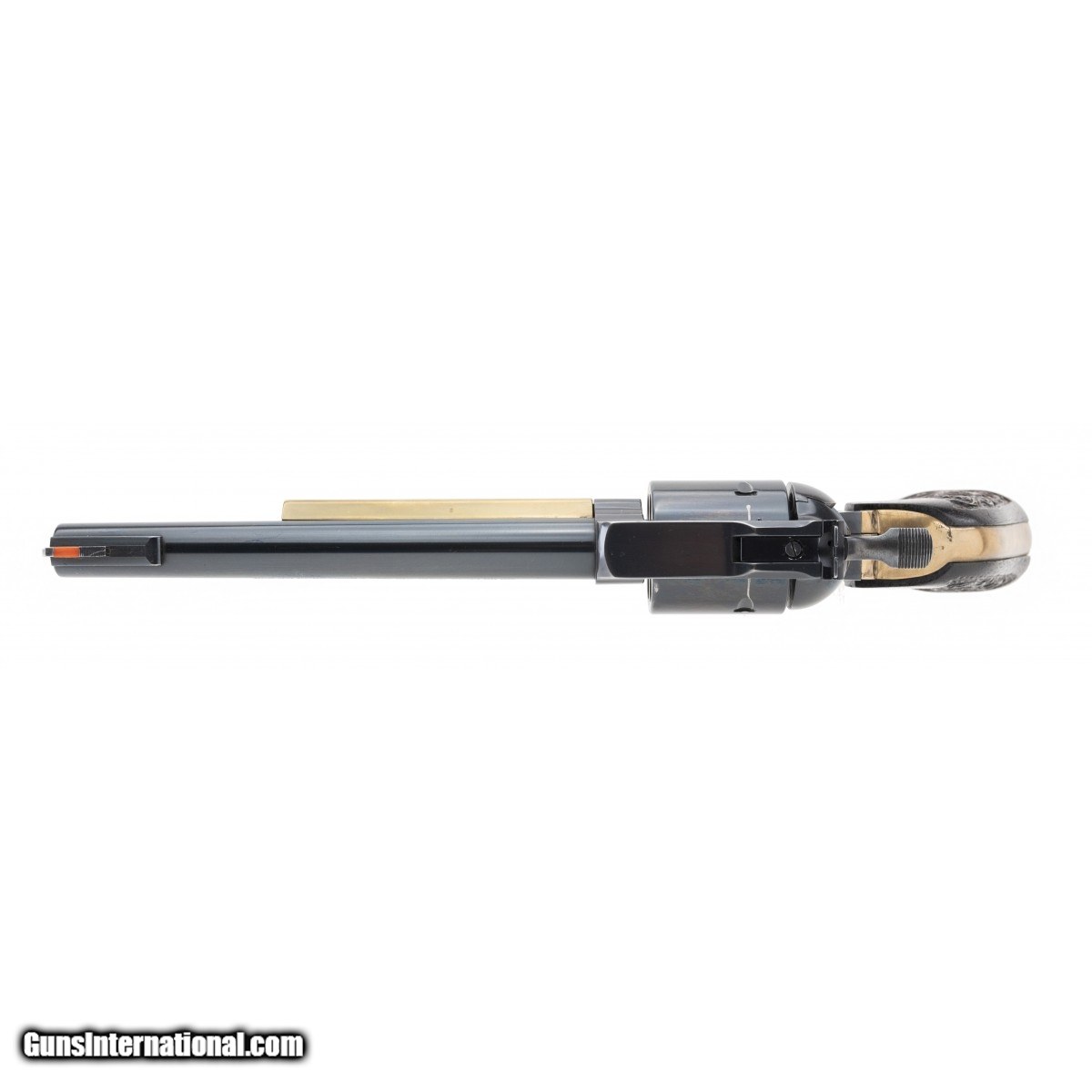 Description: " Single action revolver with 7.5"" barrel, blued finish with ejector rod housing and frame a bronze color, jeweled hammer and carved grips with a floral motif. Good condition with holster wear. SOLD |