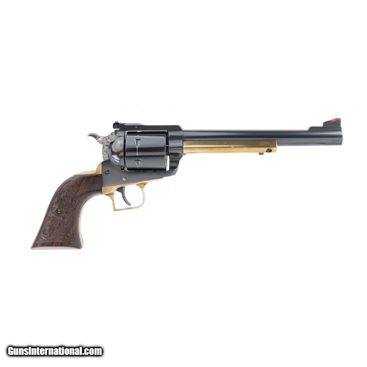 Single action revolver with 7.5"" barrel, blued finish with ejector rod housing and frame a bronze color, jeweled hammer and carved grips with a floral motif. Good condition with holster wear.