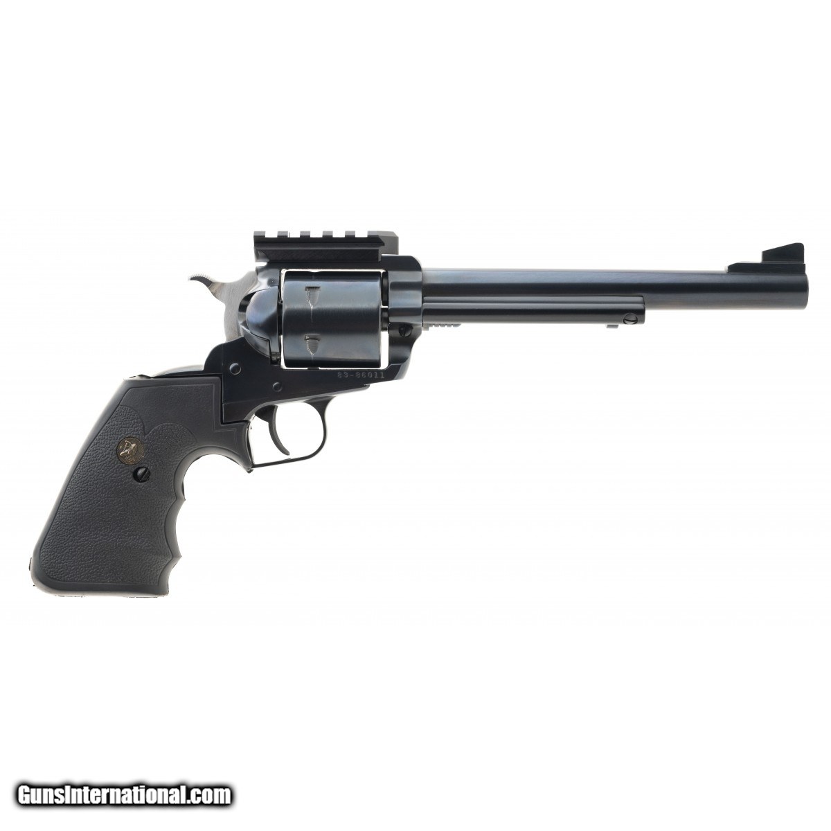 Description: " SN: 83-86011. Blued single action revolver with 7.5"" barrel. Has a scope rail mounted, and rubber grips. Comes with original rear sight and wood grips also. Excellent condition with box. SOLD |