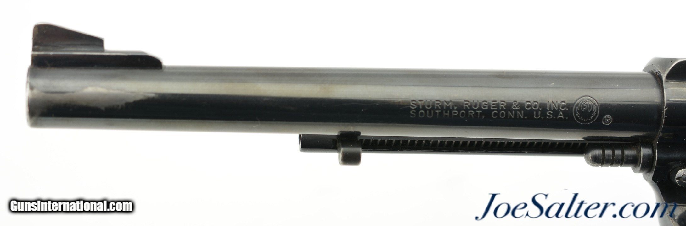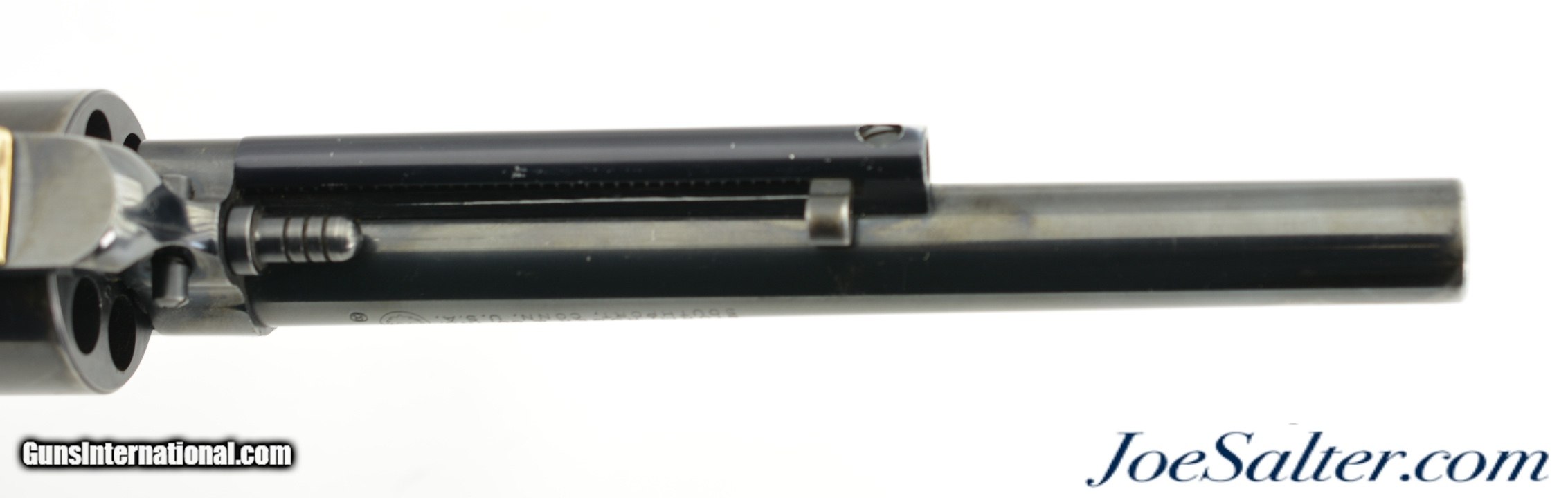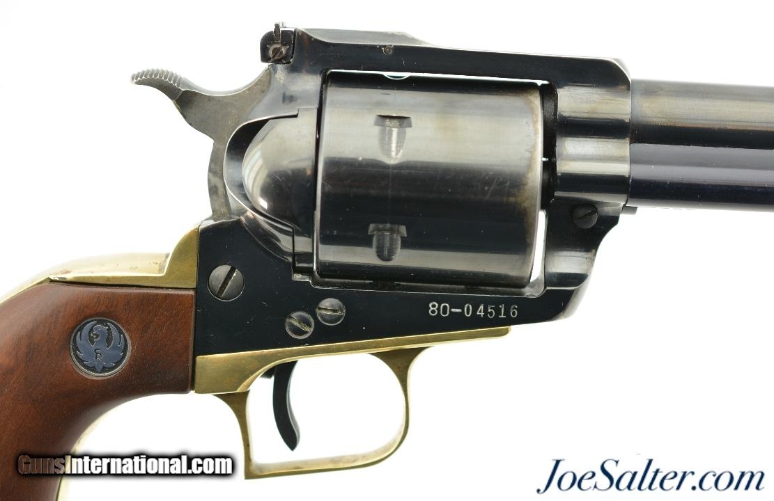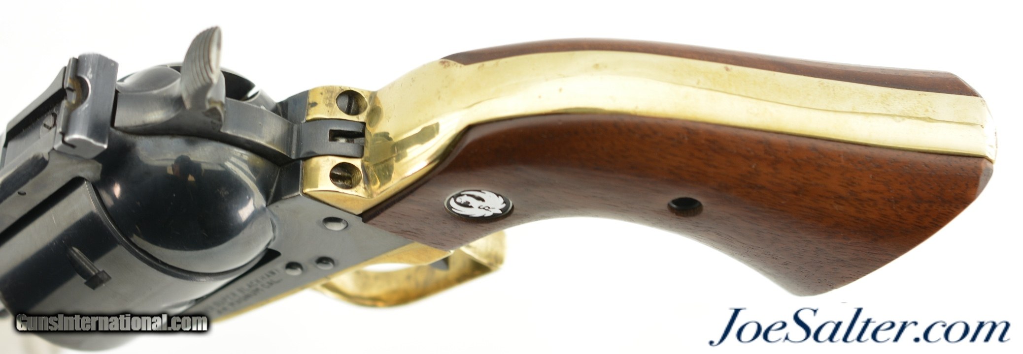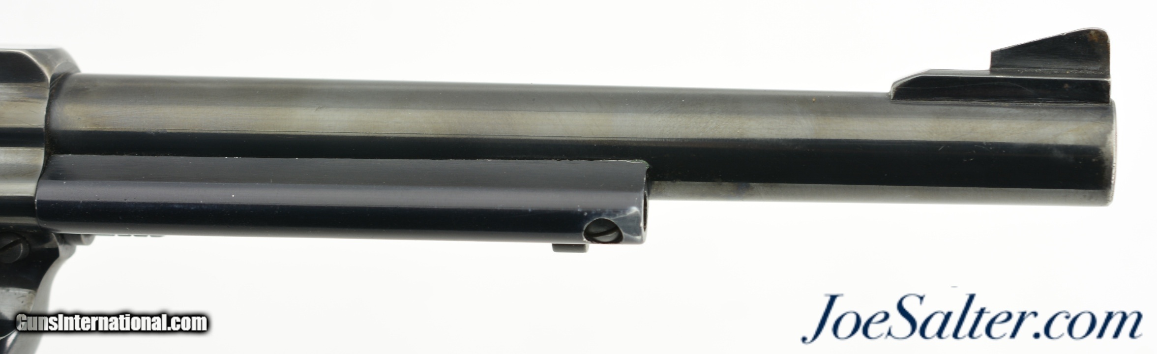 Description: Serial #80-04516, .44 Magnum, 7.5 inch barrel with an excellent bore. This is an Old Model Super Blackhawk revolver, model #00801, manufactured by Ruger in November of 1969 that was later upgraded to a factory Ruger Brass frame, part #MR-3DB (marked on the interior) with Silver Eagle Ruger Logo grips that became available in 1971. In excellent overall condition the barrel, frame and cylinder retain about 87-90% of the original high polish blue finish faded to gray along the high edges especially the muzzle and leading edge of the cylinder. The walnut grips rate excellent. The brass grip frame shows light use marks with a bright, mellow patina. Mechanically it functions properly with a tight lock up. A very nice example of the Super Blackhawk with the scarce Ruger OEM brass frame upgrade. FFL or C&R SOLD Curio/Relic: Yes |