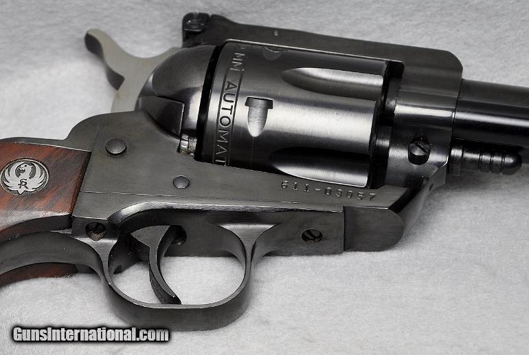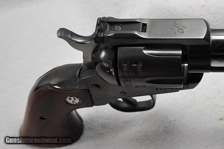 6 1/2" barrel (MINT BORE), two cylinders, THE 10MM AUTO CYLINDER DOES NOT REQUIRE MOON CLIPS TO FIRE, adjustable rear and ramp front sight, FEATURES A BUCKEYE LEAF ENGRAVED ON TOP OF RECEIVER, blue is 100% original, frame retains 100% of blue finish, barrel retains 99% of original blue finish with only an area of carry wear on left side at muzzle (see photos), on a scale of 0-10 with 0 being no cylinder ring and 10 being a deeply visible cylinder ring the 10mm cylinder would rate between 0-1 (virtually none), the .38-40 cylinder exhibits a light ring of between 1&2 (see photos), WALNUT GRIPS ARE MINT AND FEATURE THE RUGER MEDALLIAN INSERT ON BOTH, entire revolver exhibits evidence of being fired very little, no box or papers, RARE- LIMITED EDITION, Retail value $1200.00, Sale priced at $995.00