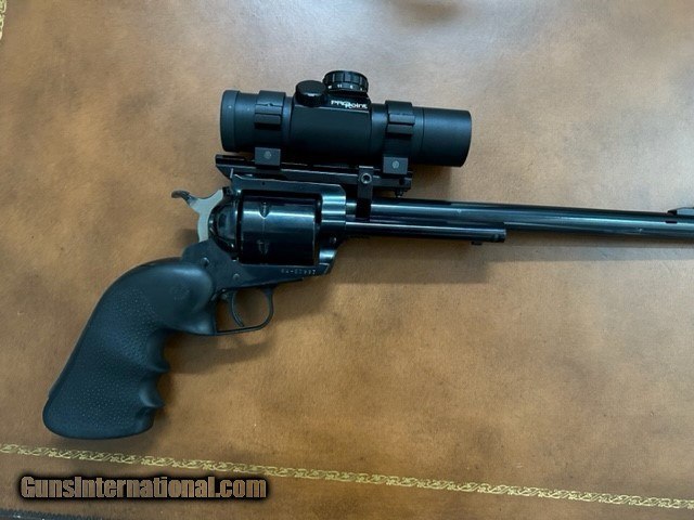 Description: Ruger New Model Super Black Hawk with optic and holster. 10.5" barrel ported Excellent condition with a small scratch on the underside of the barrel. SOLD Handgun Caliber: .44 Remington Magnum Manufacturer: Ryger Model: New Model Super Black Hawk Serial Number: 84-57997 Barrel Length: 10.5 Condition: 90% Metal Condition: 90% Wood Condition: n/a Bore Condition: 90% Action: Single action Stock: Hogue |
