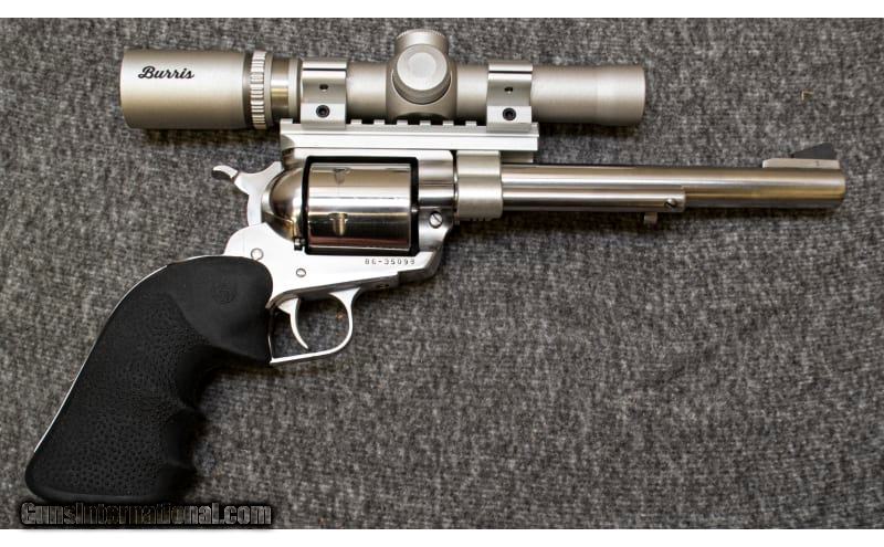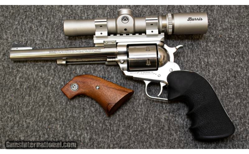 Description: Ruger New Model Super Blackhawk in 44 Magnum. This is in great condition. It comes with the original wood grips, Hogue grips installed on the pistol, a Burris handgun 2x20 scope, and all the parts to put the rear sight back on .44 Magnum SOLD Barrels: 7.5 inches Weight: 21 Oz. Item Location: Charleston, WV |