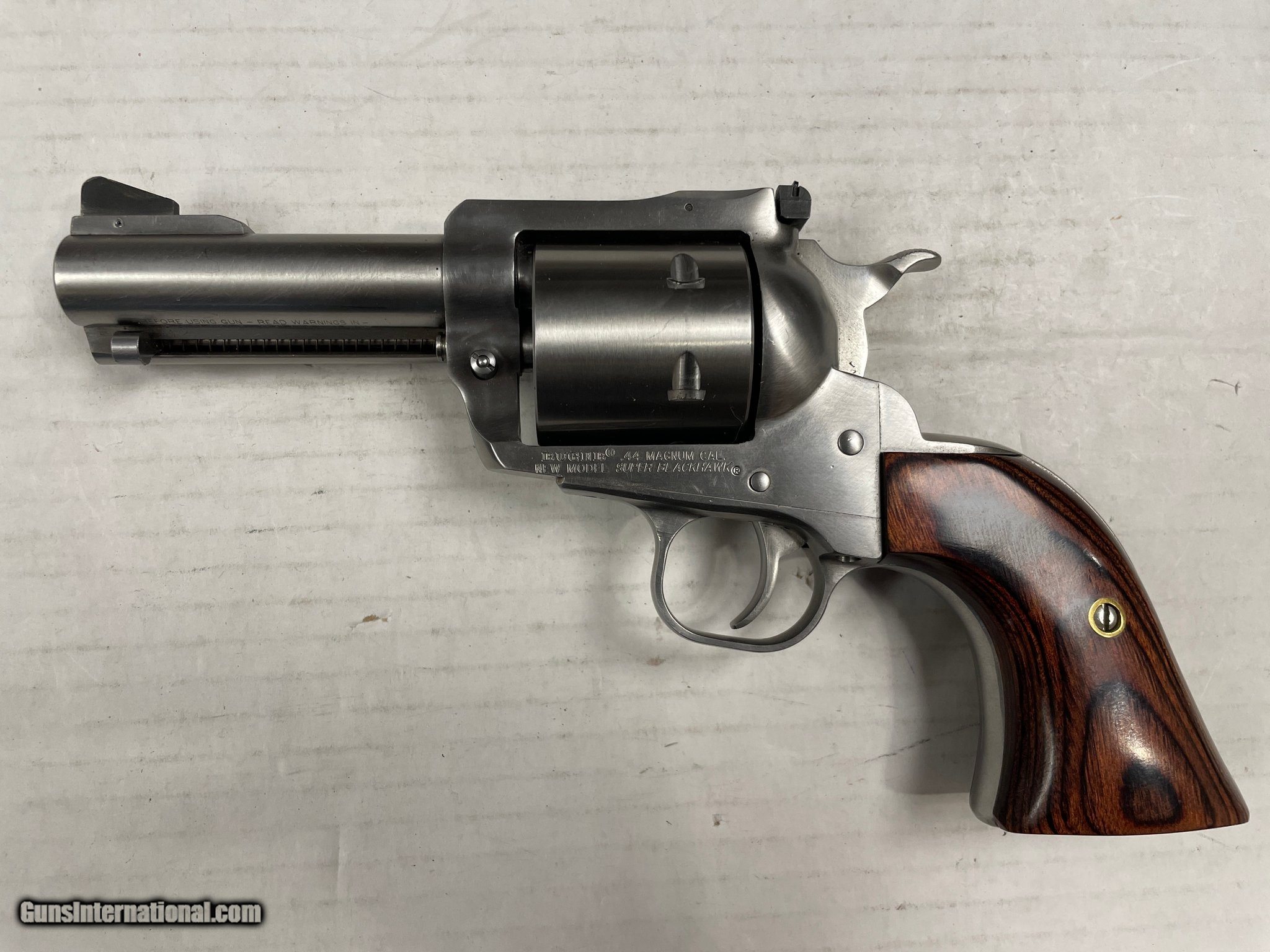 Description: Guns Listing ID: 1278126 Ruger Talo New Model Super Blackhawk, .44 Mag SA Revolver , 3.75\" Bbl, 6 Rounds, SS -Firearm has light usage marks -Original Hardcase -Wood in great shape SOLD AS IS SOLD Manufacturer: RUGER Model: NEW MODEL SUPER BLACKHAWK Caliber Info: .44 MAGNUM Condition: Used - Non-Certified Barrels: 3.75 BARREL Finish: STAINLESS |