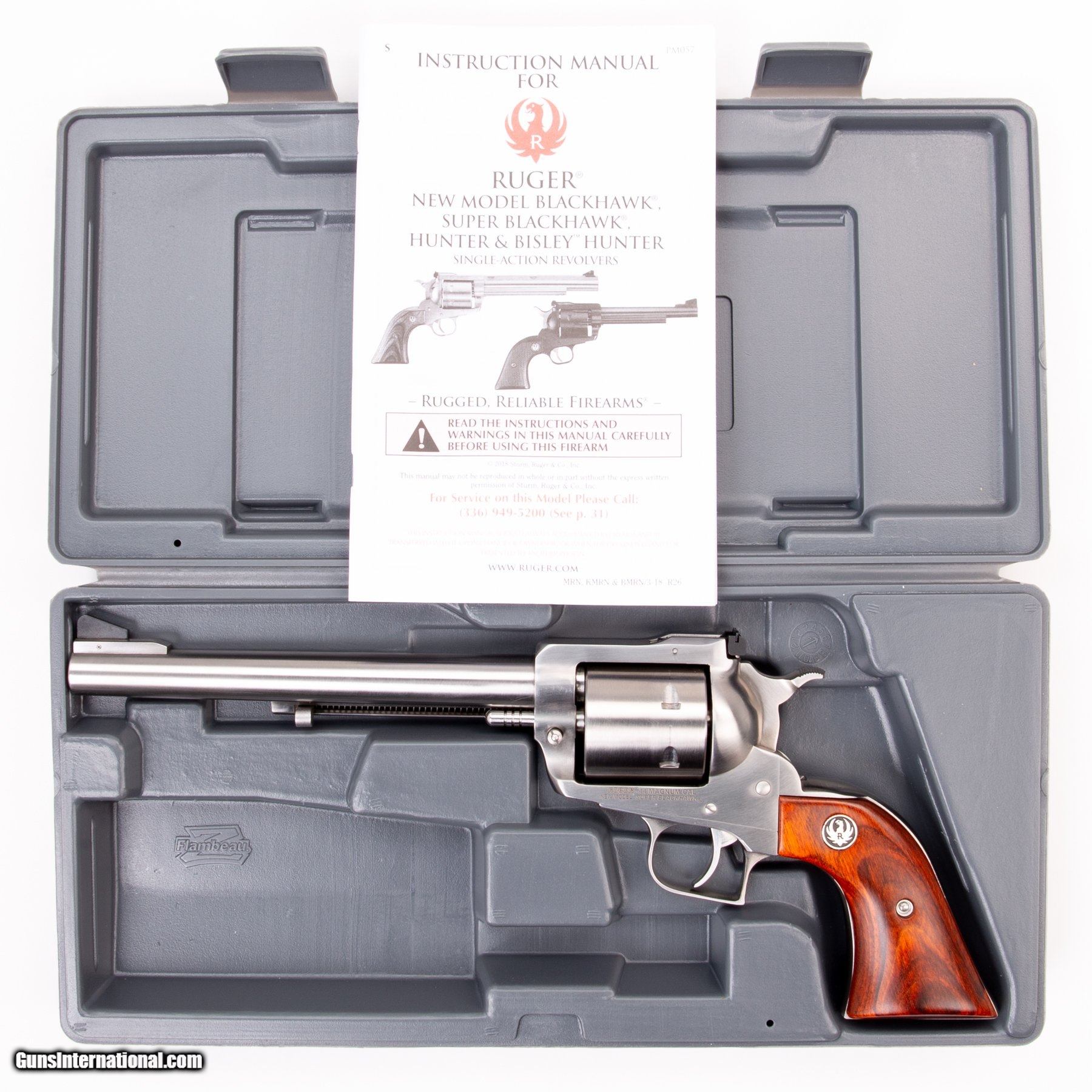 Description: Guns Listing ID: 470251 This Ruger New Model Super Blackhawk features wood grips and an adjustable rear sight. The original case and owner‚‚s manual are included. Get the best bang for your buck when you get a Certified Used Firearm . When you see the Certified Used stamp on any of our firearms, you can be confident that you‚‚re getting exactly what you want – a gun only in very good to excellent condition and held to the highest quality standard. All Certified Used Guns come with a ‚‚no questions asked‚‚ return policy . PLUS, ALL CERTIFIED USED GUNS SHIP F SOLD Manufacturer: RUGER Model: NEW MODEL SUPER BLACKHAWK Caliber Info: .44 MAGNUM Condition: Used - Certified Barrels: 7.50 Action: REVOLVER Finish: STAINLESS Weight: 3 |